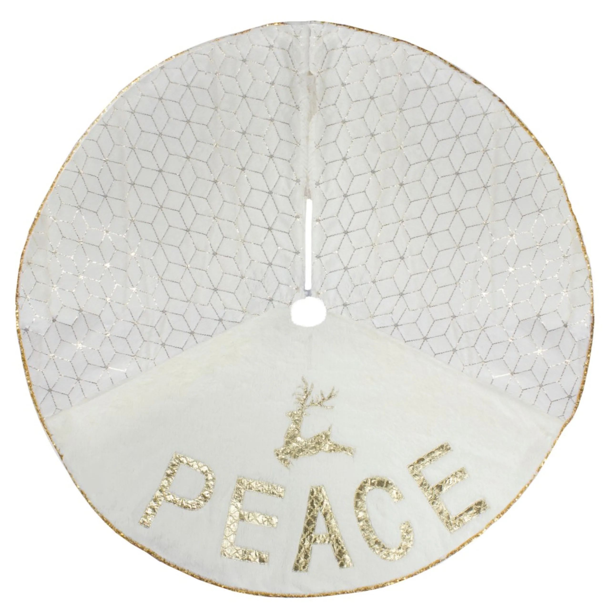 Bring Your Christmas Tree Into A Focal Point Of Attention With This White Faux Fur Skirt. This Skirt Has A Gold Geometric Pattern And A Gold Reindeer With The Word ‘Peace’ Below. This Skirt Creates A Cheerful Statement To Your Holiday Tree, Enhancing Its Overall Appeal. Perfect For Gifts On Christmas Morning!