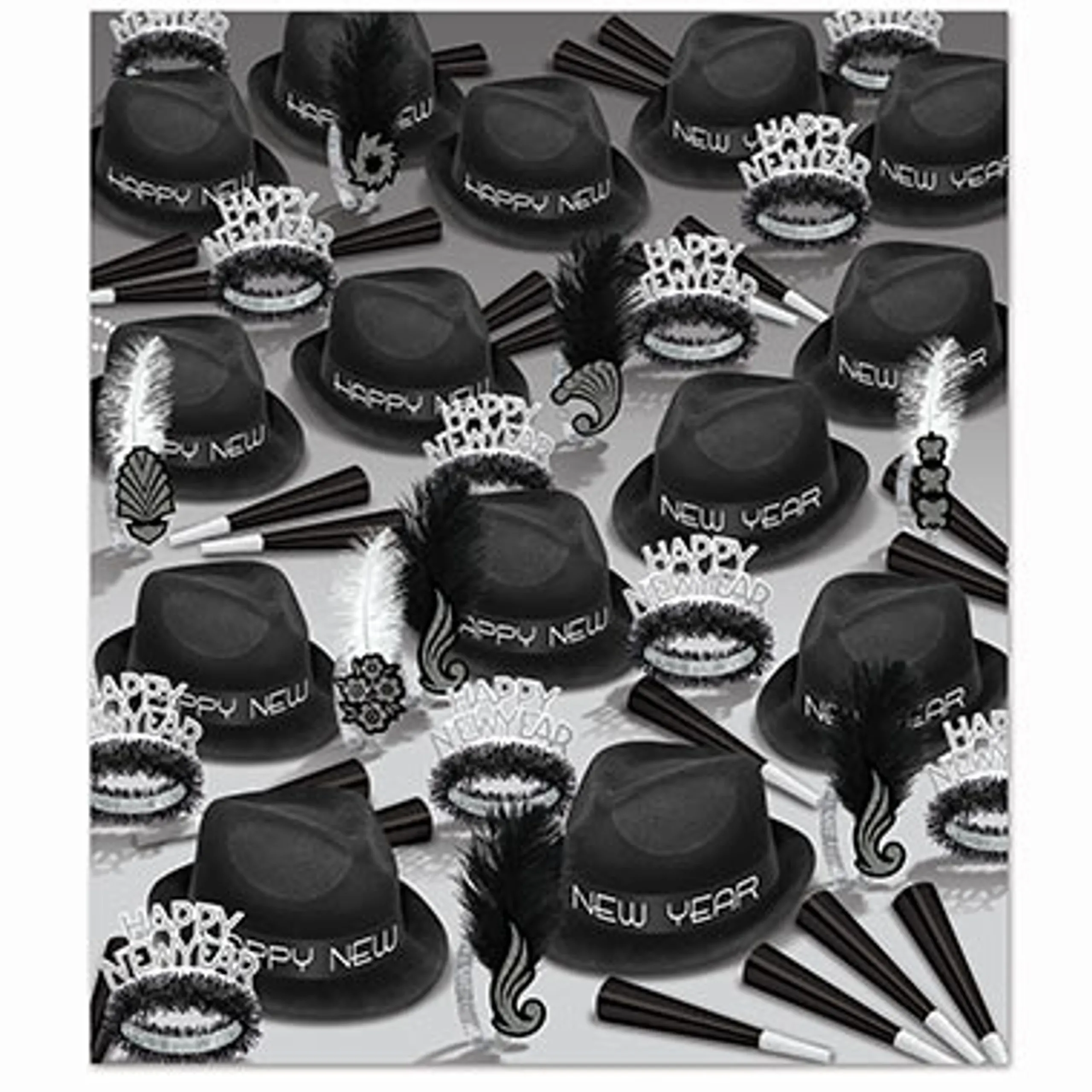 Hats And Tiaras Accented With 100 Counts Of 9″ Foil Horns