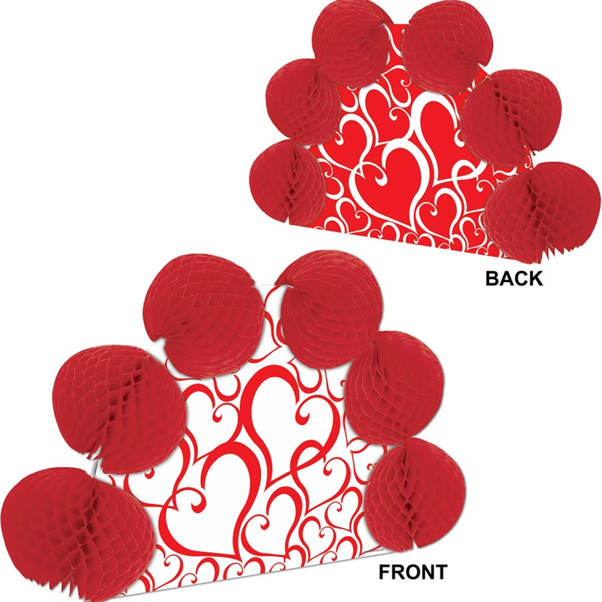 Front Features A White Background With Red Flowing Hearts With Red Honeycomb Puffs