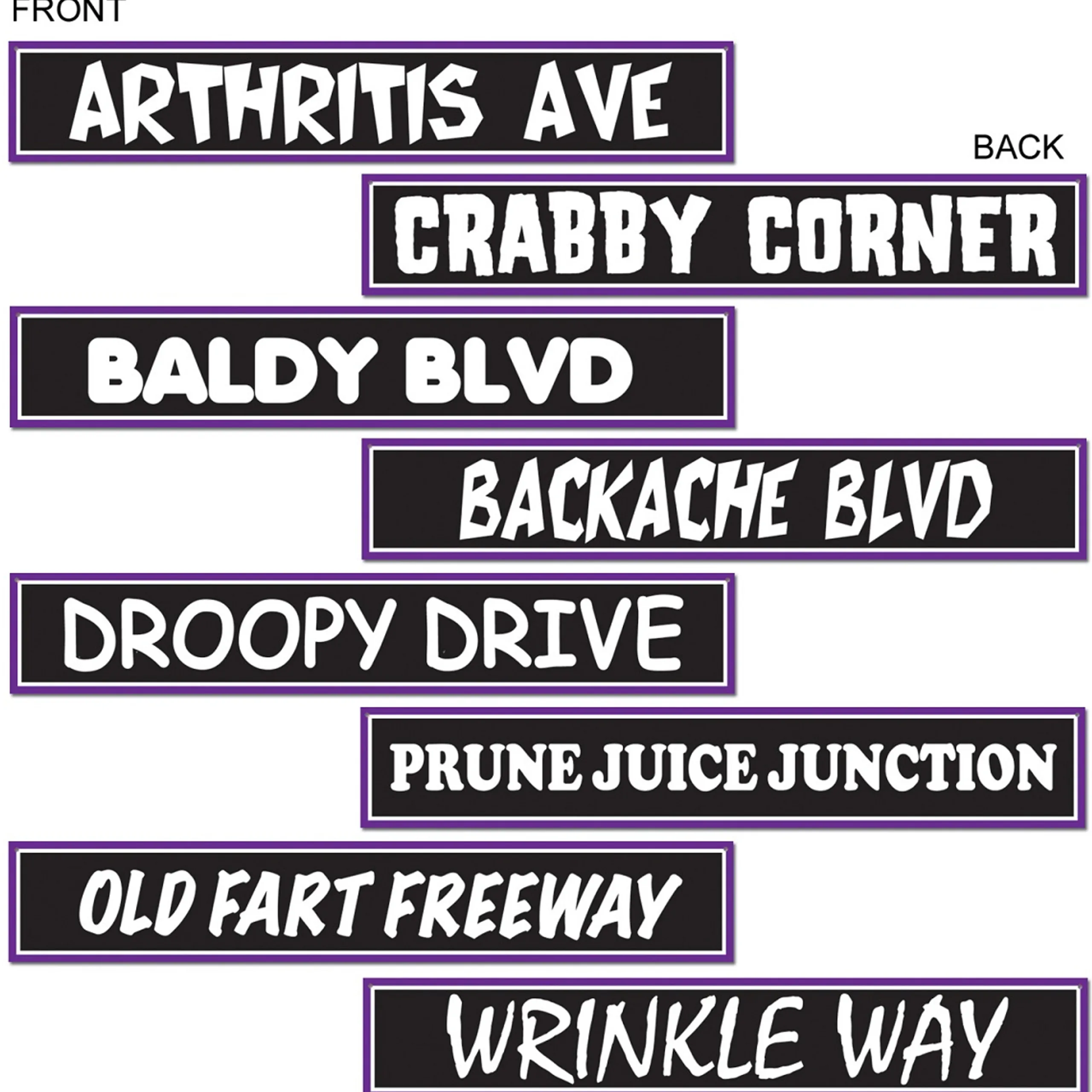 Front: “Arthritis Ave”, “Baldy Blvd”, “Droopy Drive”, And More In White Lettering