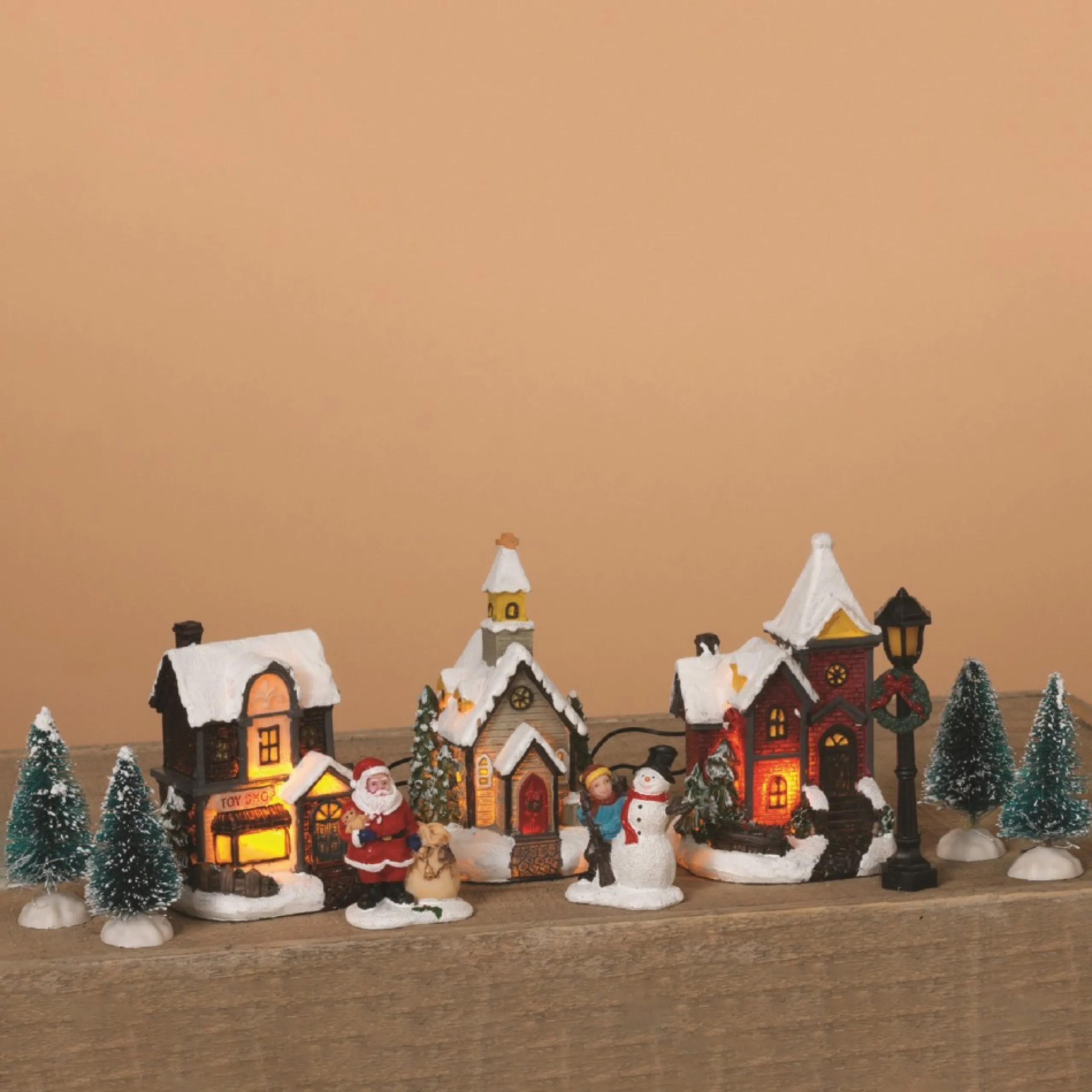 Set Includes 2 Homes, 1 Church, 4 Trees, Santa Figure, Snowman And 1 Lamp Post