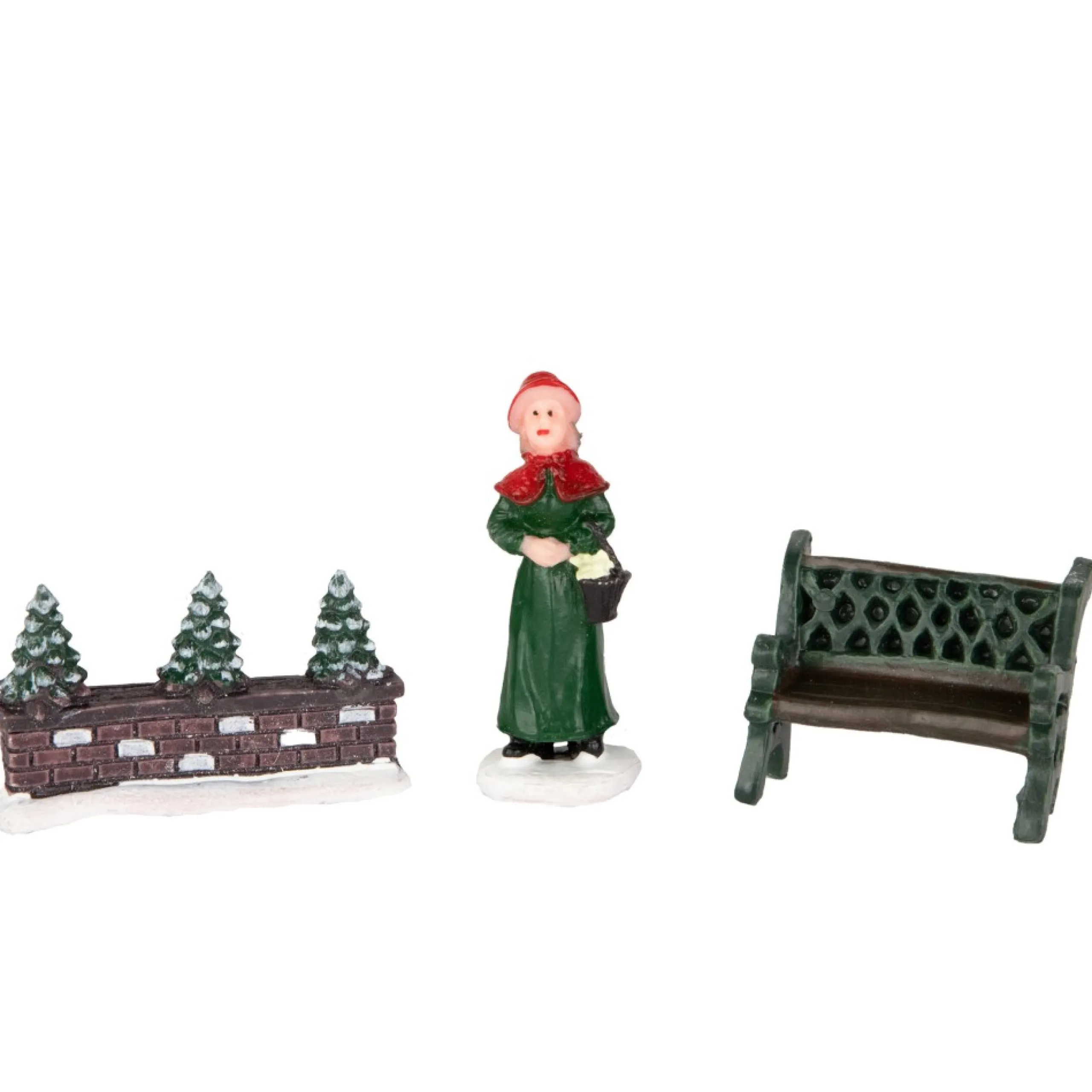 This Convenient Set Makes Adding To Your Christmas Village A Snap. Display Set Includes Santa, Caroling Woman, Leaning Snowman, 2 Trees, Planter And A Bench! Perfect For Adding That Wow Factor In One, Easy Step.