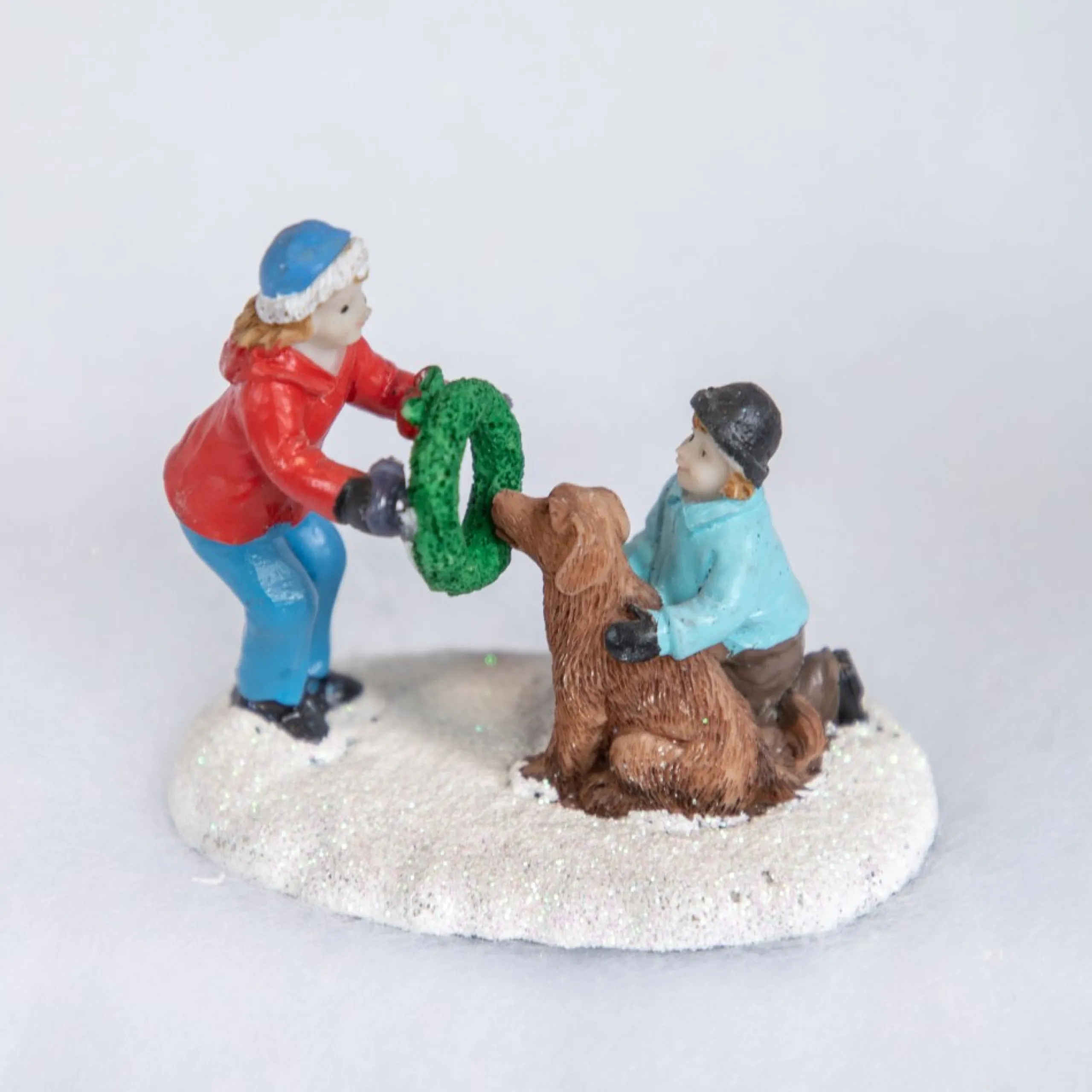 This Sweet Doggy Scene Makes The Perfect Addition To Any Christmas Village. Depicts 2 Children And A Dog. One Single Piece Makes Placement A Breeze.
