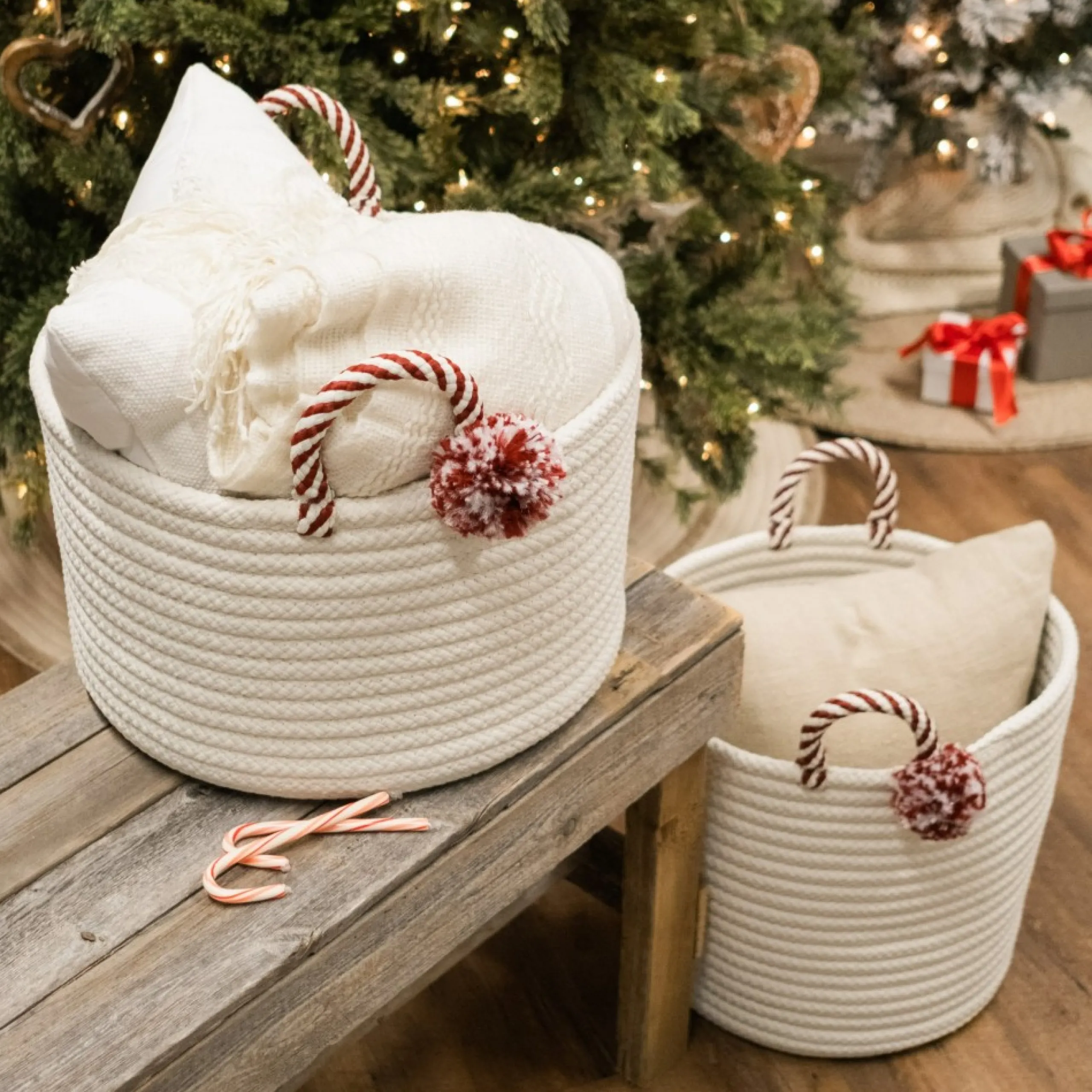 Elevate Your Storage Solutions This Holiday Season With Our Charming Candy Cane Basket. Featuring Eye-Catching Red Spiral Handles Adorned With A Soft Pom-Pom, This Textured, Woven, And Braided Basket Brings A Touch Of Festive Flair To Your Home. Effortlessly Carry And Relocate Items Using The Easy-Grip Handles. Ideal For Blankets, Gifts, Toys, Or Holiday Decorations, This Basket Adds A Cheerful Touch To Any Space.