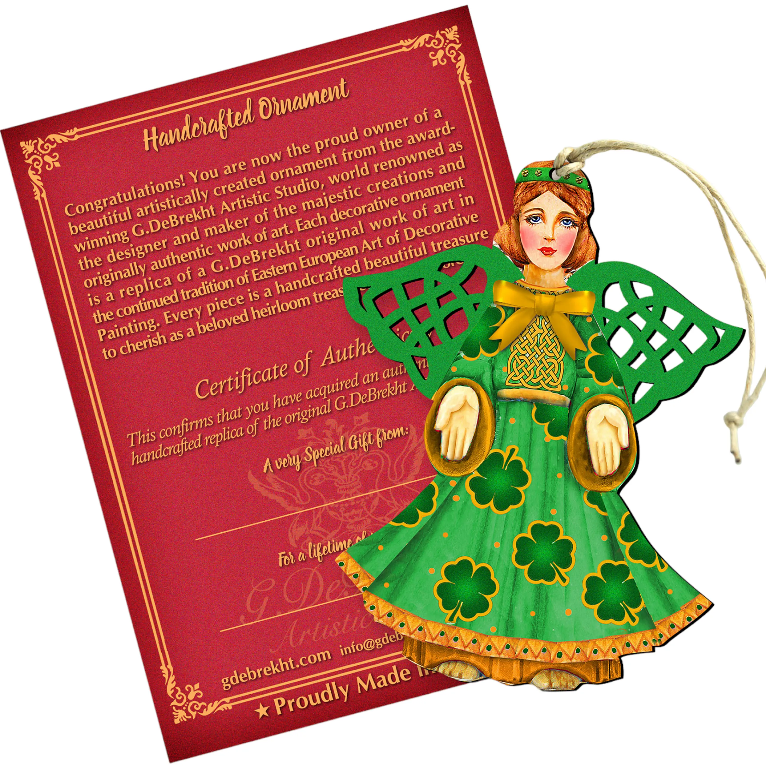 Ornaments Depict An Irish Angel Wearing A Dress With Clover Leaves Design And A Big Ribbon