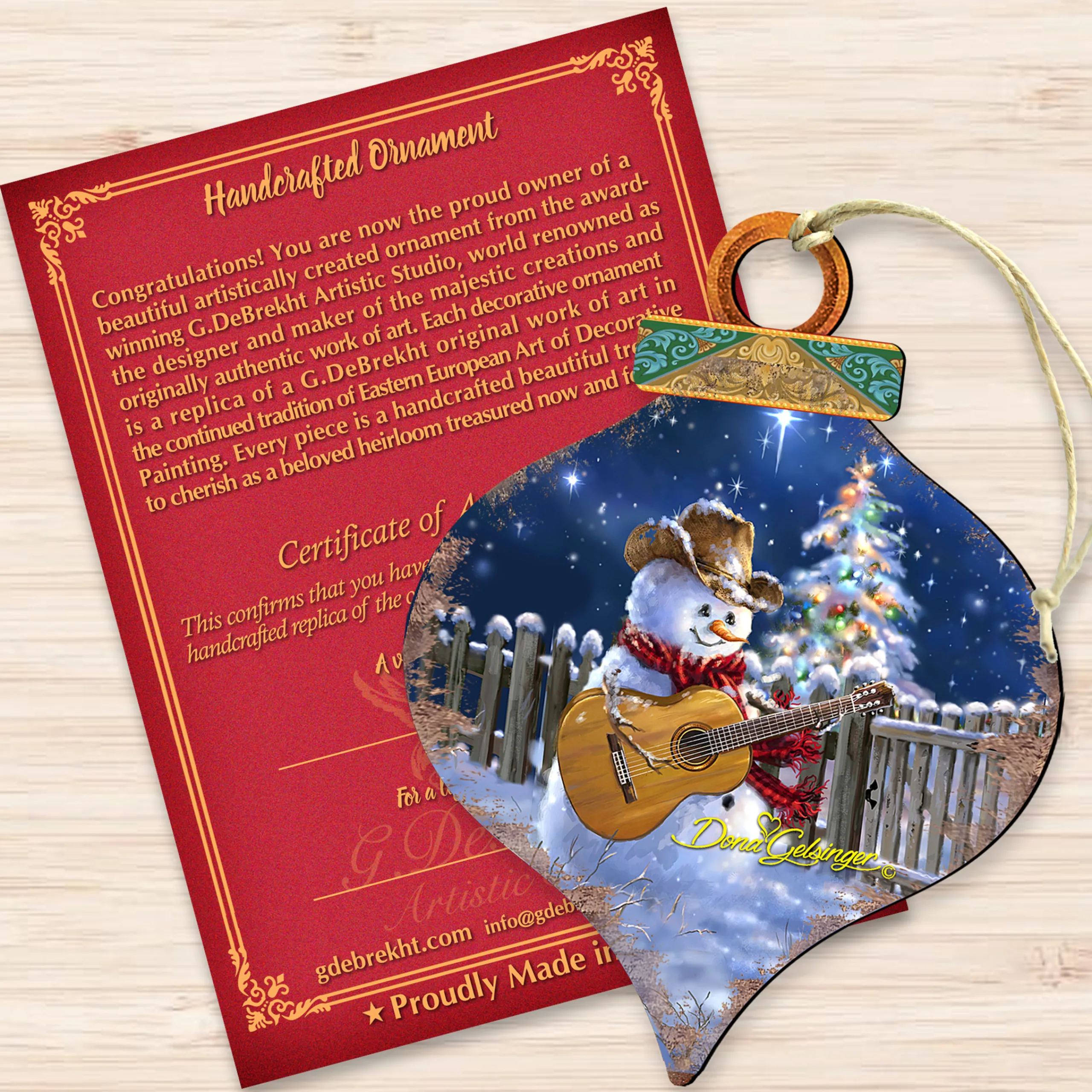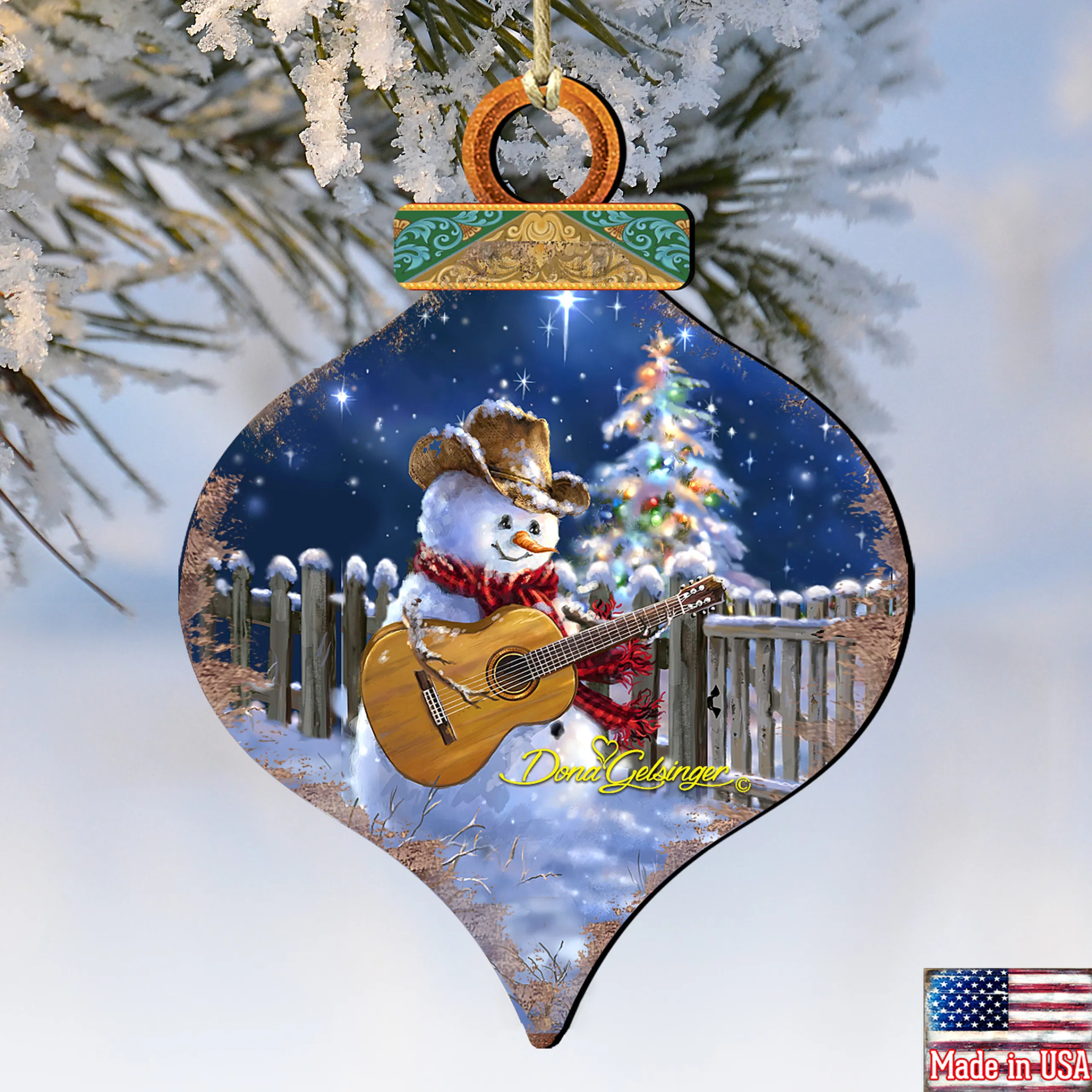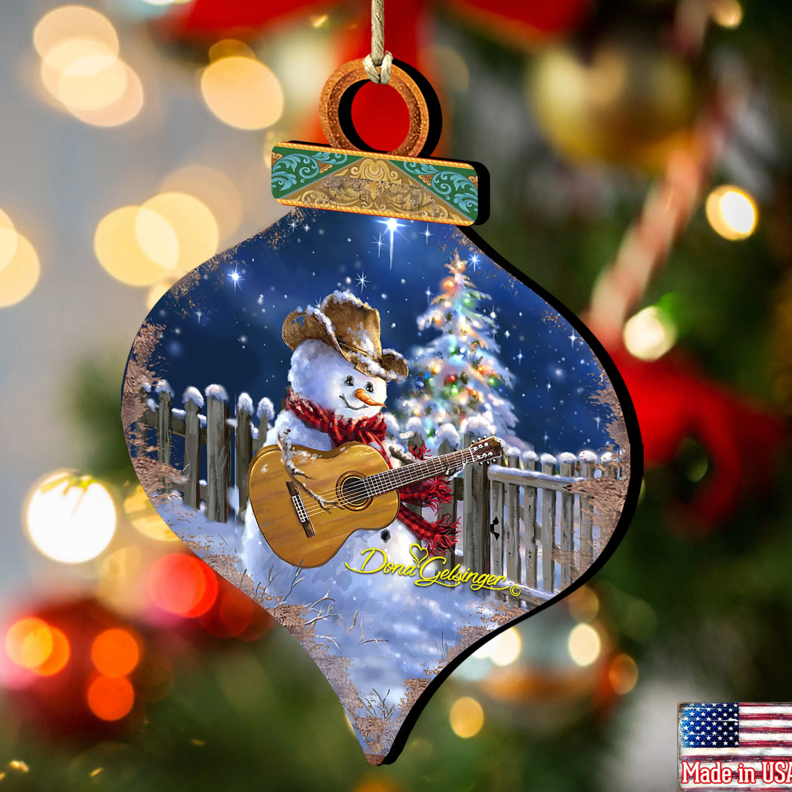 Invite The Beauty Of Christmas Into Your Home With This Set Of Charming Ornaments. These Onion Shaped Ornaments Depict A Snowman Playing Guitar With A Christmas Tree At The Back. Each Ornament Was Handcrafted From Birch Wood And Designed By Dona Gelsinger. These Would Be A Perfect Addition To Your Home Christmas Decoration Or A Great Gift.