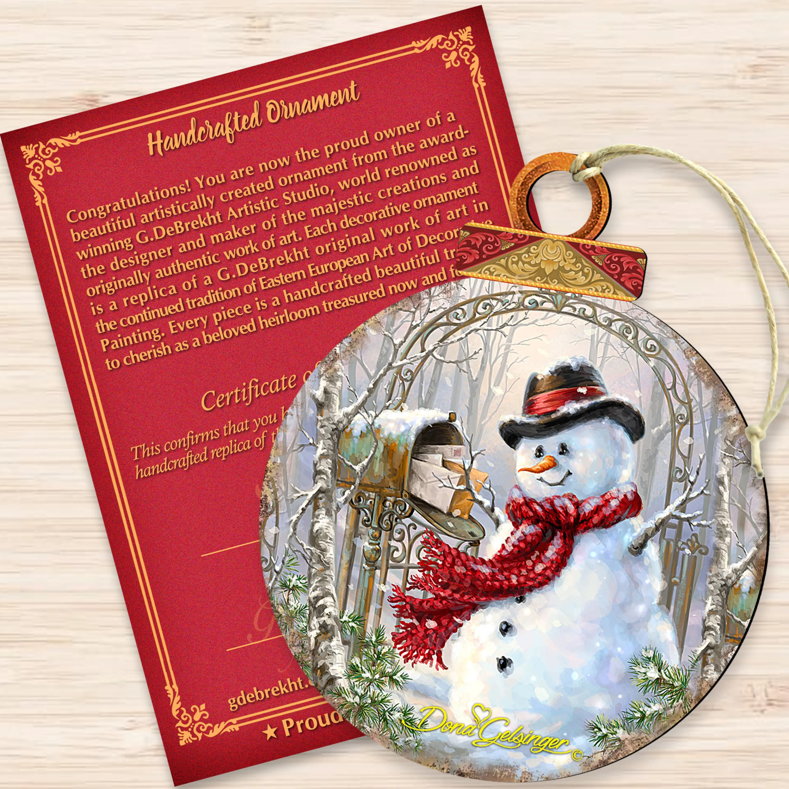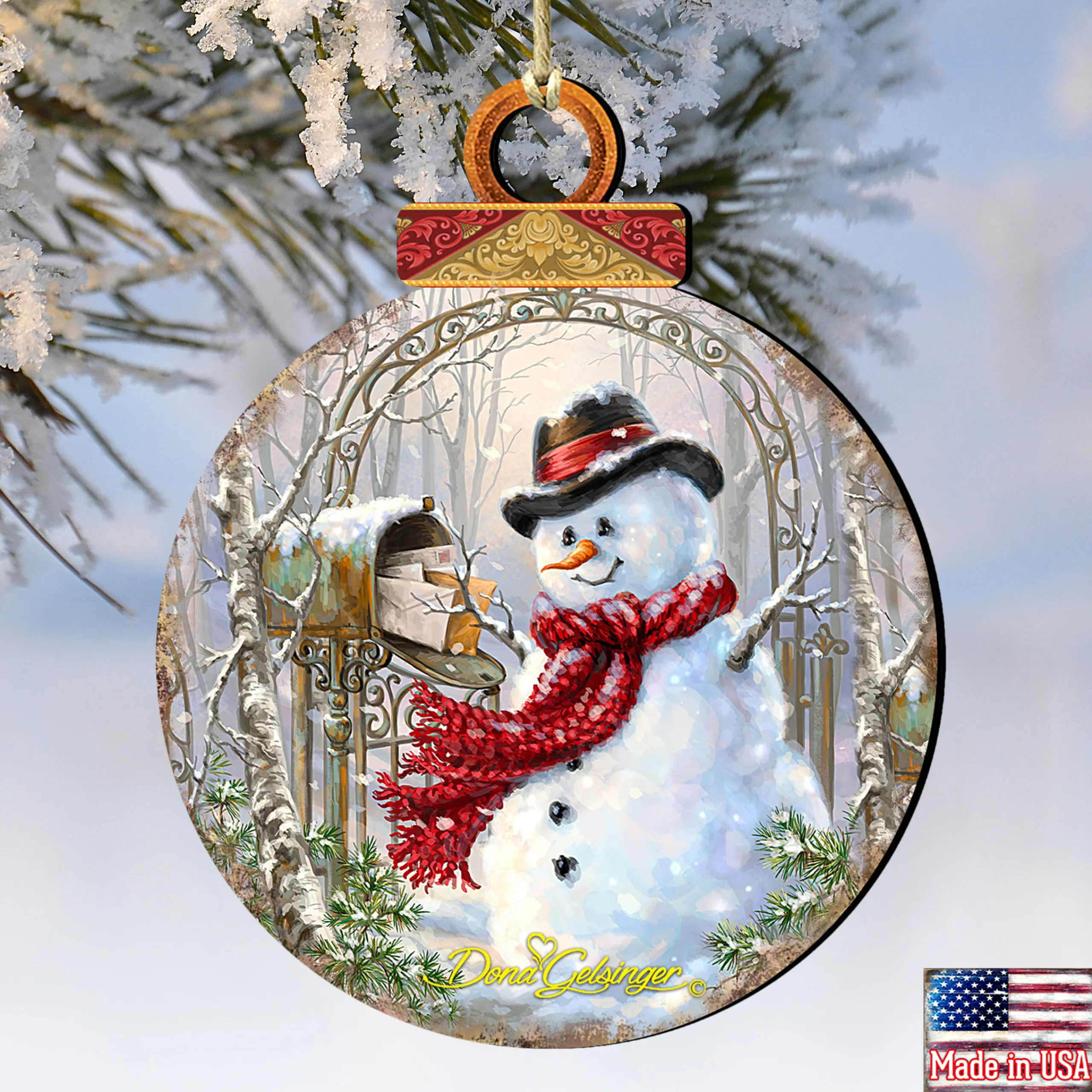 Invite The Beauty Of Christmas Into Your Home With This Set Of Charming Ornaments. These Ornaments Depict A Mailman Snowman Wearing A Scarf In The Winter Season. Each Ornament Was Handcrafted From Birch Wood And Designed By Dona Gelsinger. These Would Be A Perfect Addition To Your Home Christmas Decoration Or A Great Gift.