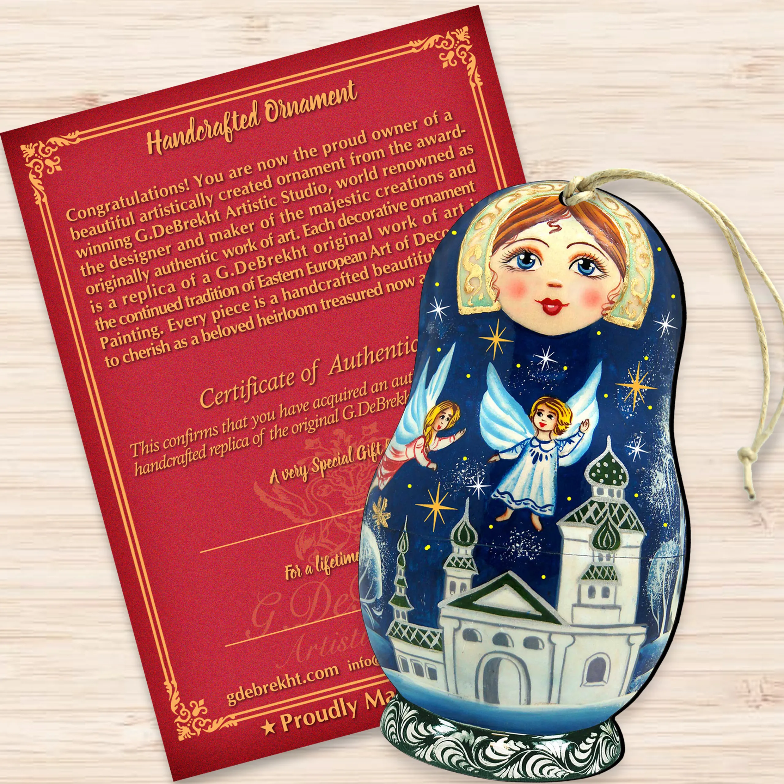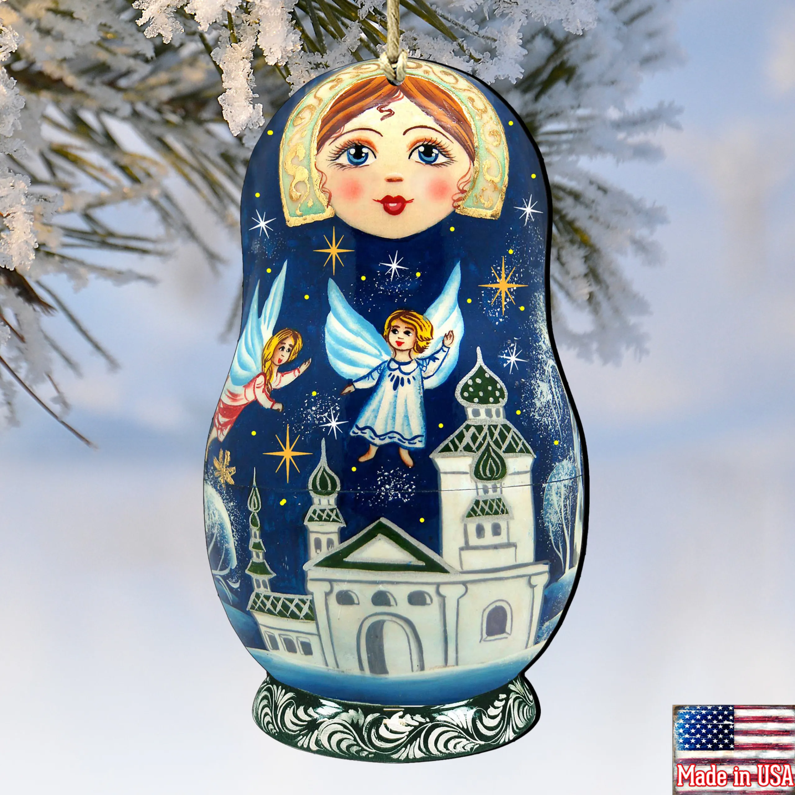 Invite The Beauty Of Christmas Into Your Home With This Set Of Charming Ornaments. These Ornaments Depict A Matreshka Doll With Flying Angels And Bright Stars. Each Ornament Was Handcrafted From Birch Wood And Designed By G.Debrekht. These Would Be A Perfect Addition To Your Home Christmas Decoration Or A Great Gift.