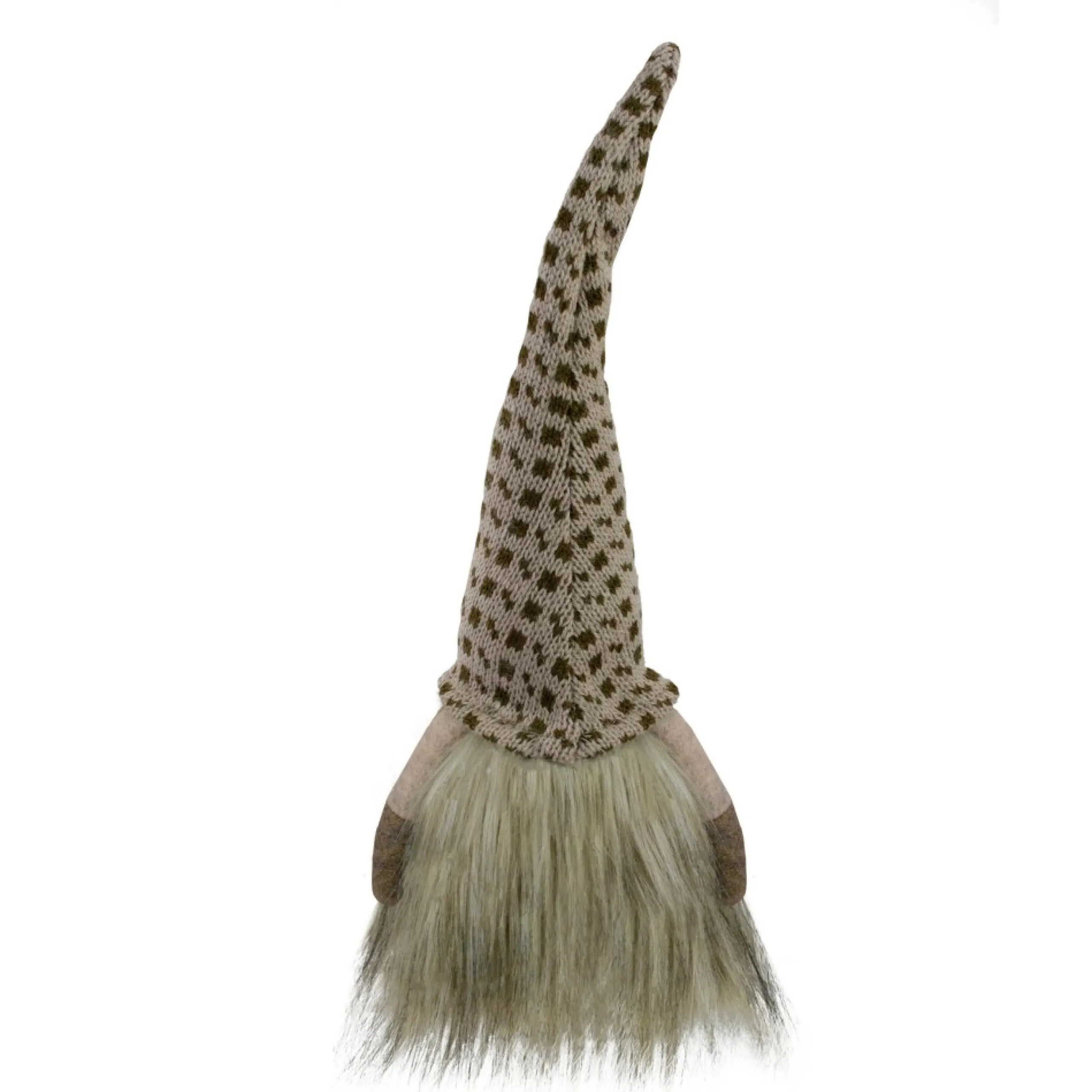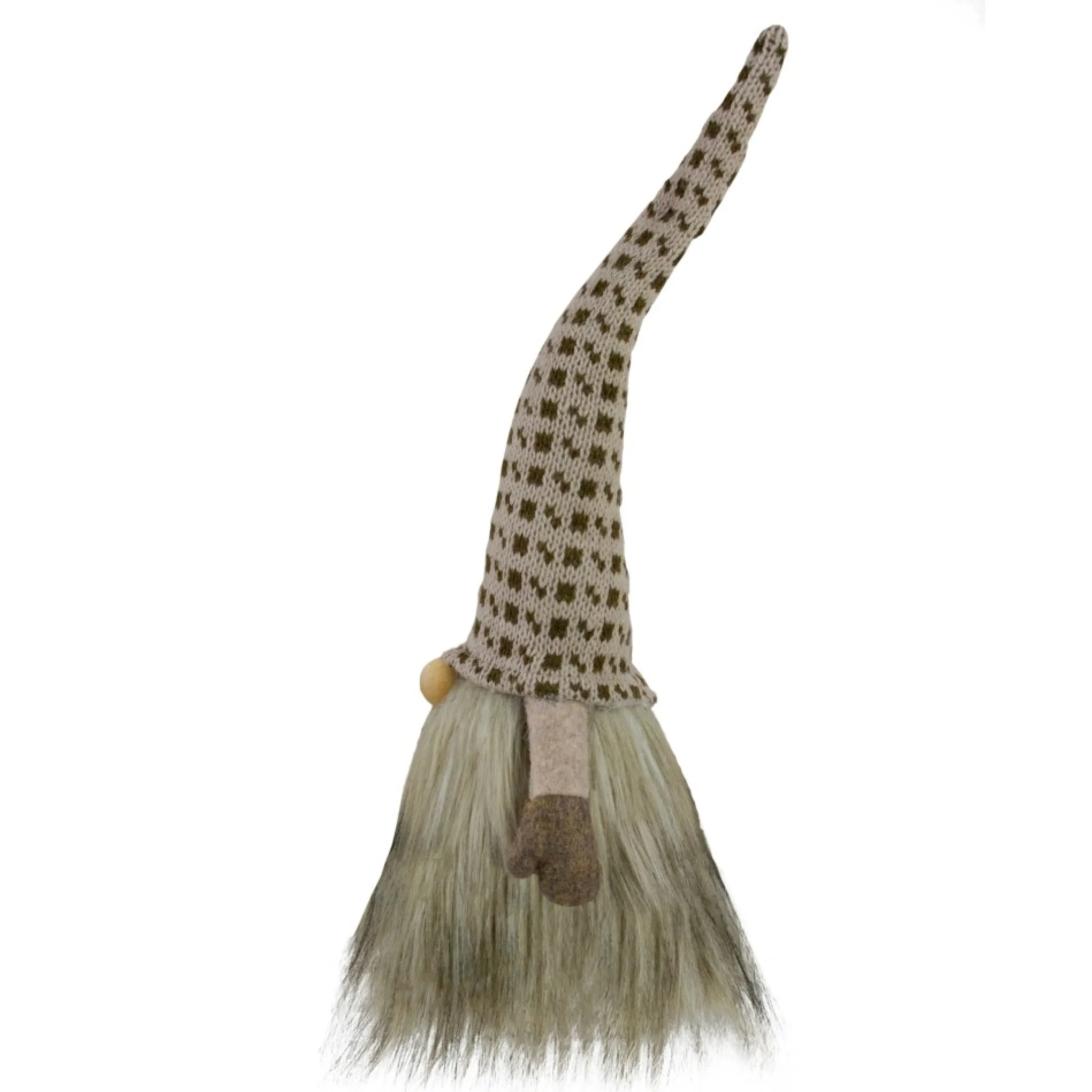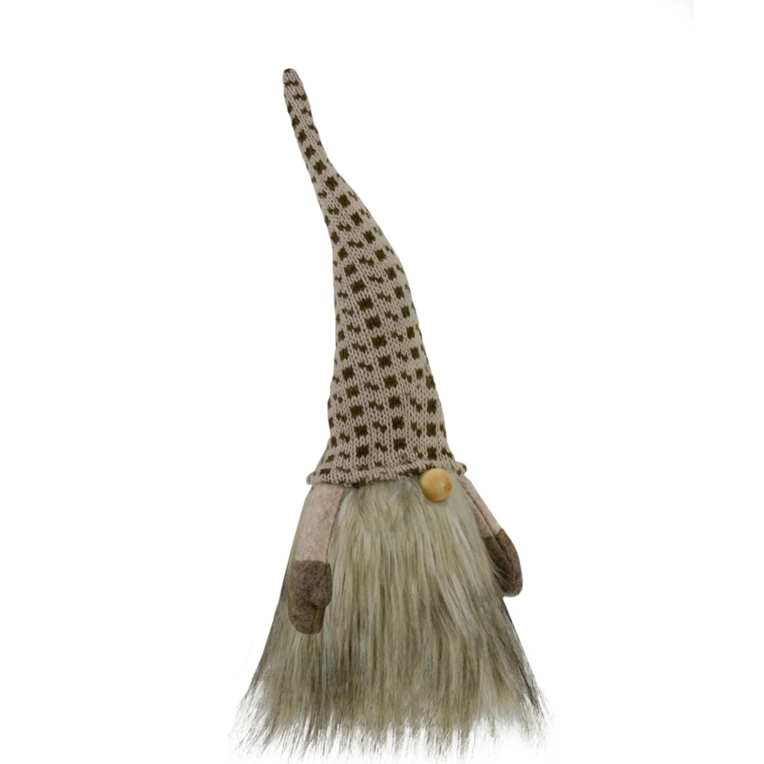 The Gnome Wears A Beige And Brown Patterned Hat And Mittens