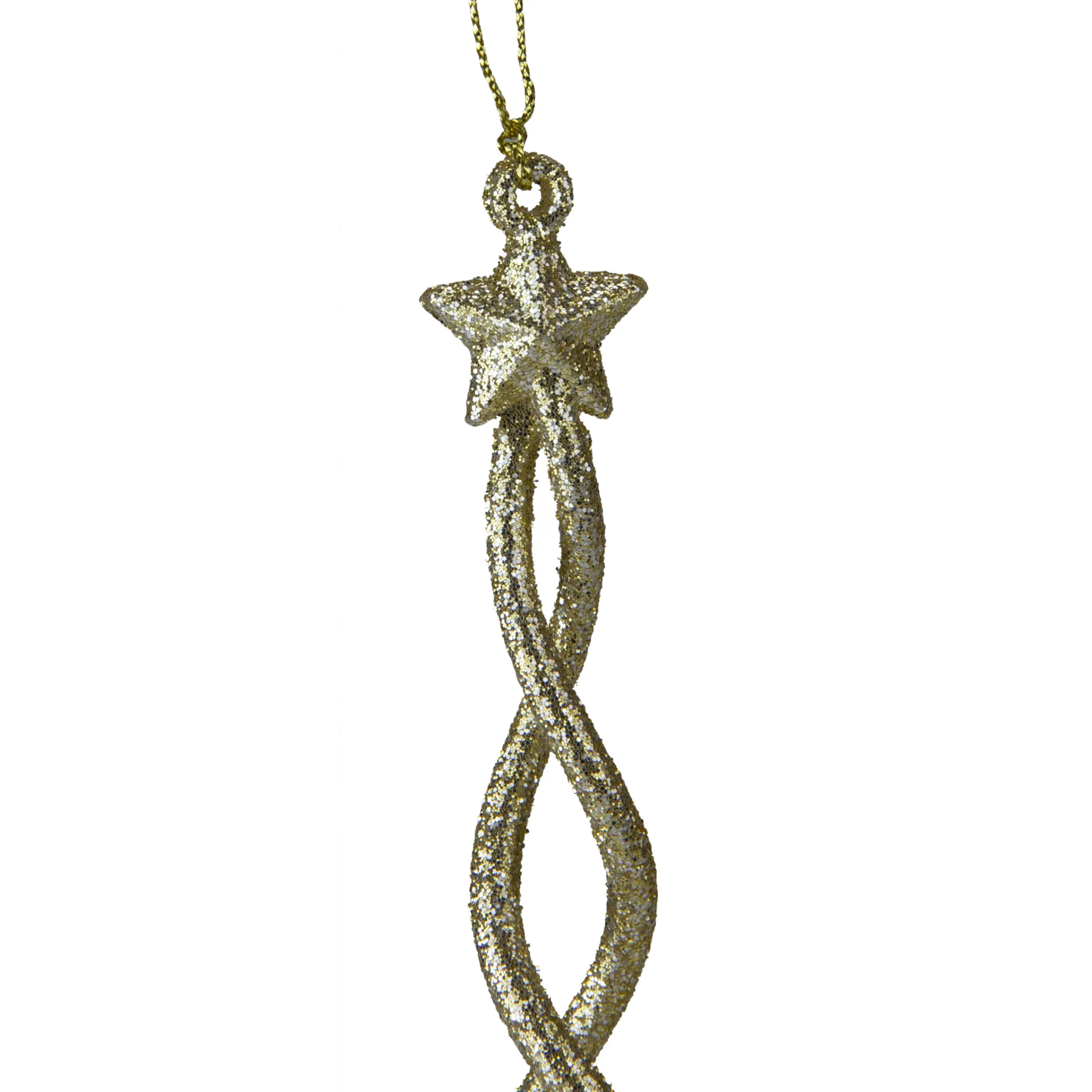 The Weather Outside Is Certainly Frightful So Stay Inside, Surrounded By A Decorated Tree And A Warm Fire. This Ornament Is Gold And Silver In Color, Coated In Glitzy Glitter There Is A Twisted Design With A Small Star On Top And A Small Ball On The Bottom. Perfect For Creating An Elegant Tree With Simple Lights Could Also Be Placed In Your Doorways Or Windows.
