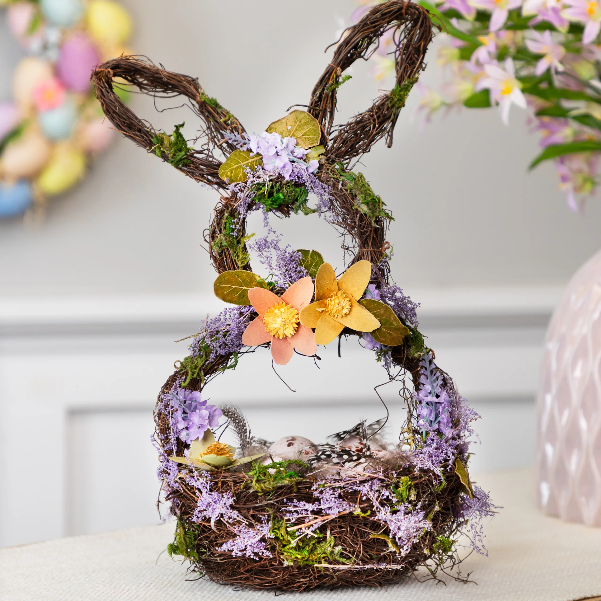 Bring Home That Easter Feeling Today With This Bunny Rabbit Shaped Basket. This Bunny Basket Comes Decorated With Moss, Artificial Flowers, And Feathers. Nestled Inside Of The Basket Are Some Speckled Eggs. This Basket Will Be A Perfect Addition To Your Holiday Or Spring Decor For Years To Come.
