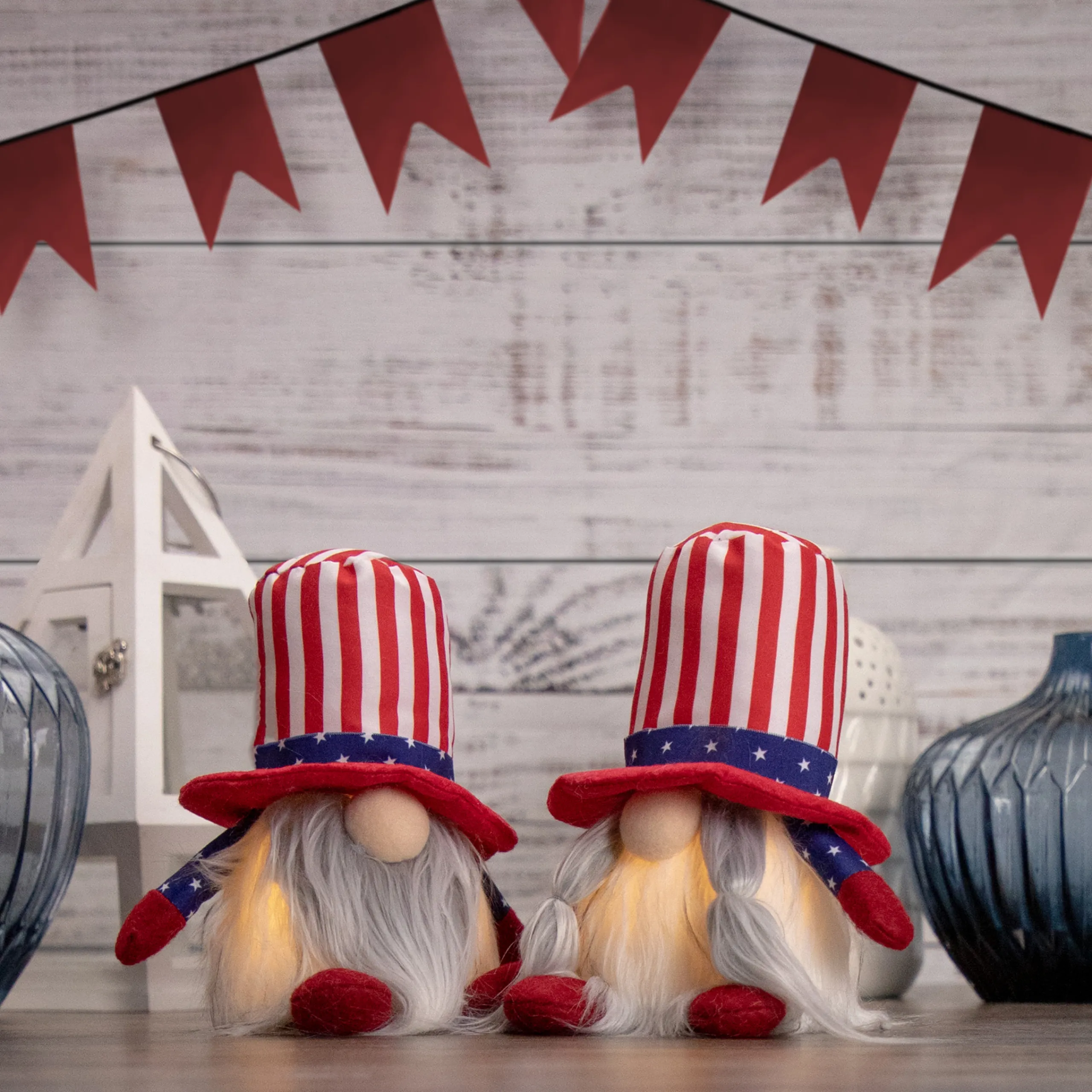 Gnomes Are Best Known For Guarding Earthly Treasures, Providing Good Luck, And Are Perfect For Protecting Your Goodies. This Gnome Is Wearing Red And White Striped Hat With Blue And White Star Ribbon. He Wears A Blue Sweater With White Star Accents And His Belly Lights Up. His Large Bulbous Nose Pokes Out From His Long White Beard. Place This Gnome On Your Mantle, Or Alone On Any Table For The Perfect Patriotic Decoration.