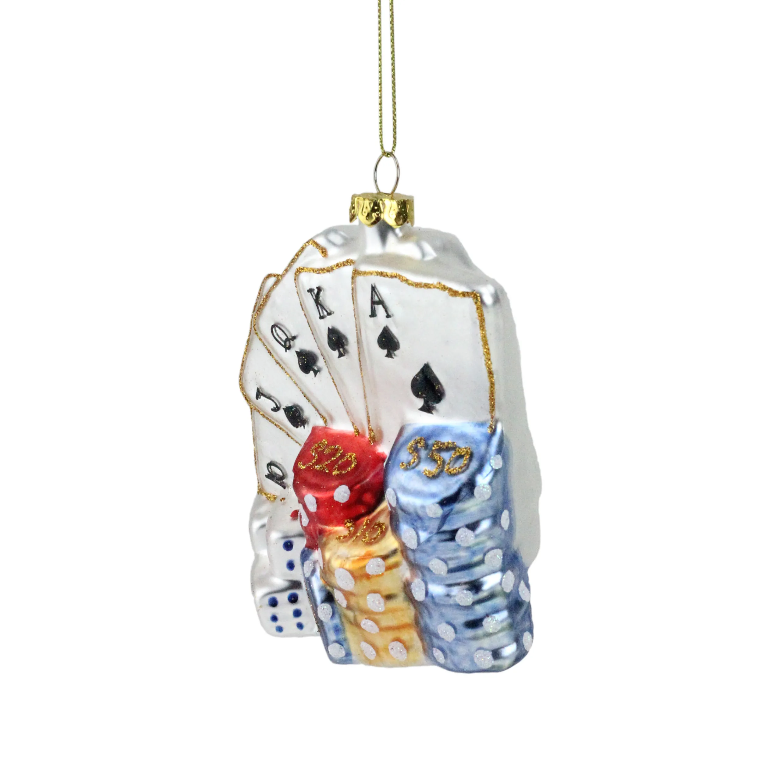 Forget The Casino And Bring Game Night To Your Holiday Decor This Year With This Poker-Themed Glass Ornament. This Handblown And Hand-Painted Ornament Depicts A Royal Flush, Some Dice, And Poker Chips With Pops Of Sparkly Glitter. This Ornament Will Be The Perfect Addition To Your Christmas Tree Or A Great Gift Idea For The Poker Lover In Your Life.