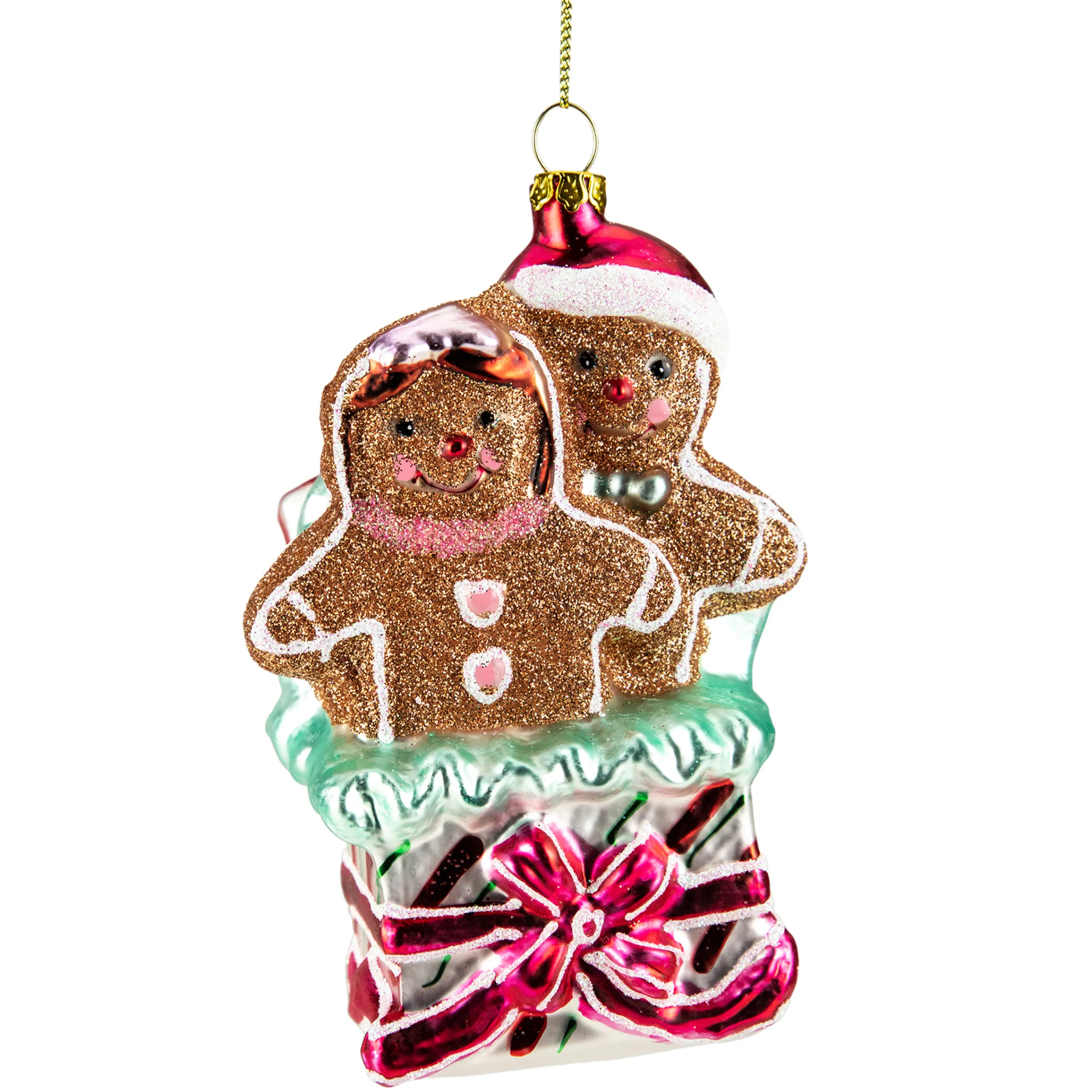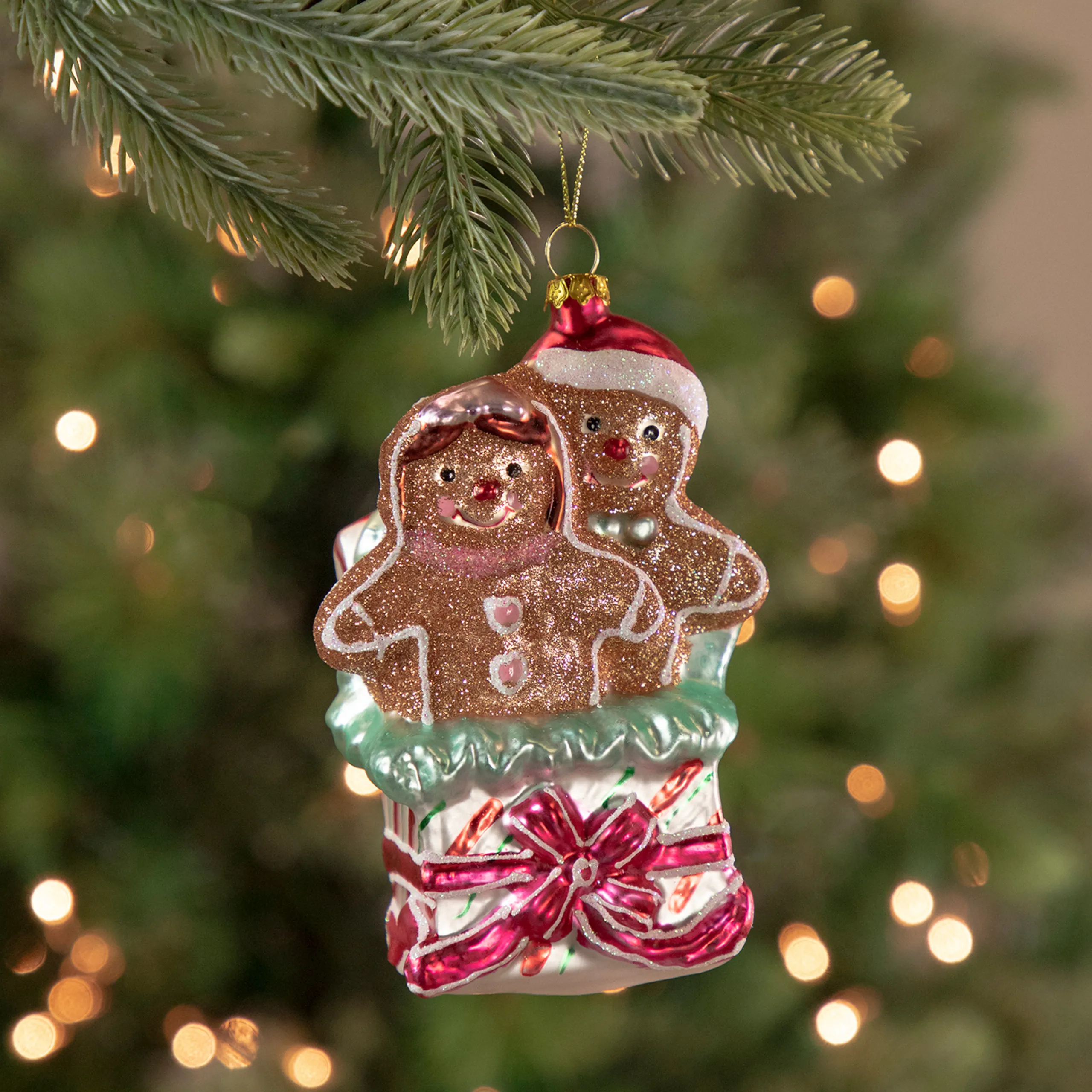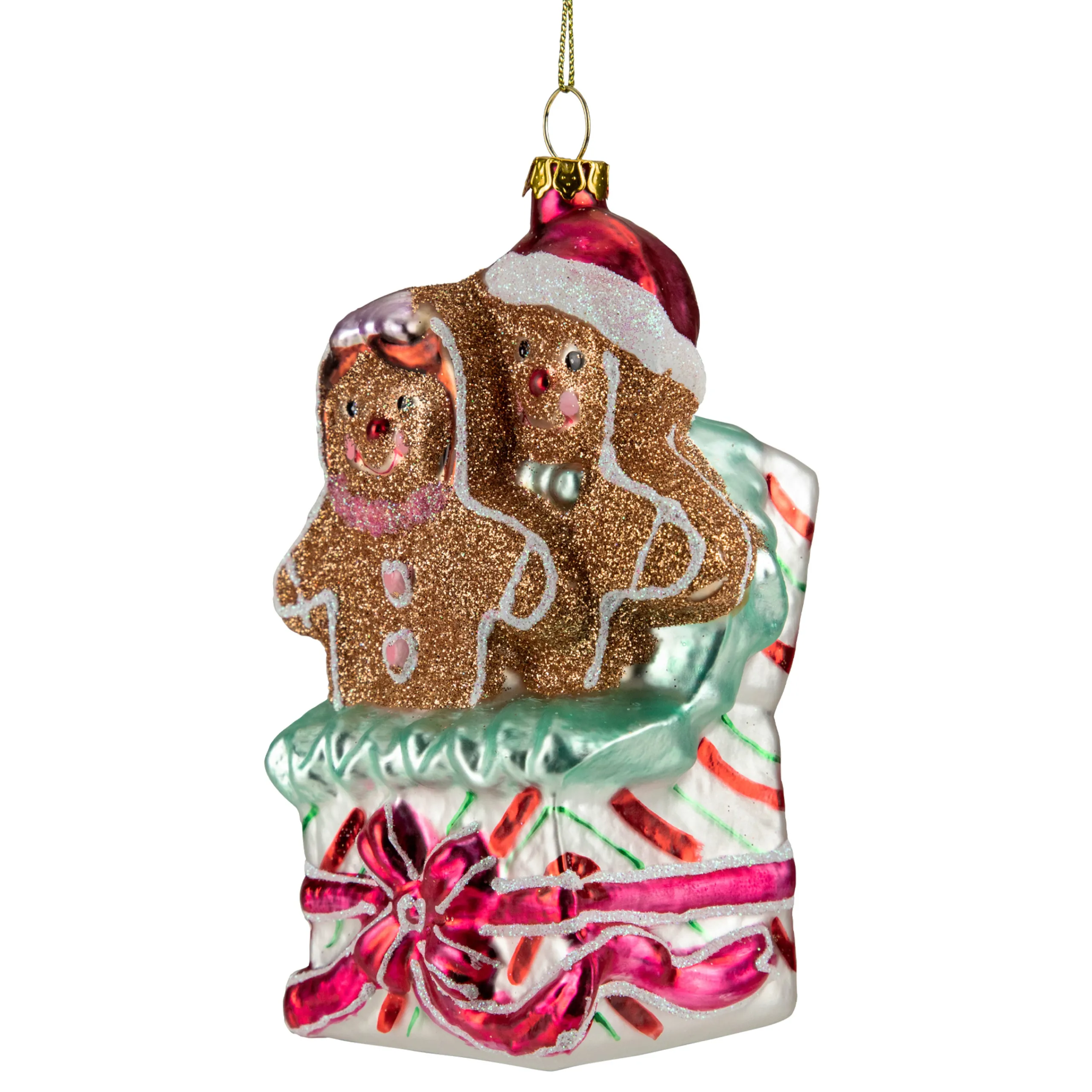 This Ornament Features An Adorable Gingerbread Couple In A Gift Box. This Ornament Is Crafted From High-Quality Glass, And Comes Accented With Shimmering Glitter And Intricate Details. Hang It On Your Tree Or Use It As A Decorative Accent For Your Holiday Wreaths Or Garlands. With Its Festive Design And Eye-Catching Colors, This Ornament Is Sure To Delight And Bring Joy To Your Holiday Season