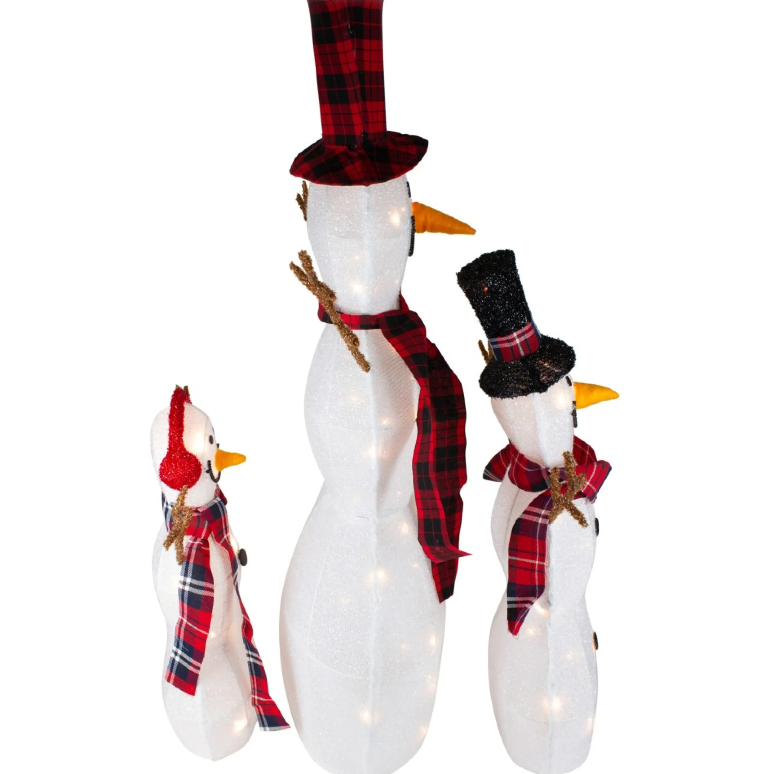 It’s The Most Wonderful Time Of The Year! Bring Some Frosty Friends To Your Holiday Display With This Snowmen Family Set. The Larger-Sized Snowman Wears A Red And Black Plaid Hat With A Matching Scarf. The Medium-Sized Snowman Wears A Blue And Red Plaid Scarf With A Black Hat With A Matching Plaid Stripe. The Smallest Snowman Wears A Blue And Red Plaid Scarf With Red Ear Muffs. These Snowmen Are Pre-Lit By Clear Mini Lights And Create A Unique Glow To Your Decor. The Smiling Faces Of The Snowmen Will Create A Warm And Inviting Touch To Any Area You Display Them For Years To Come.