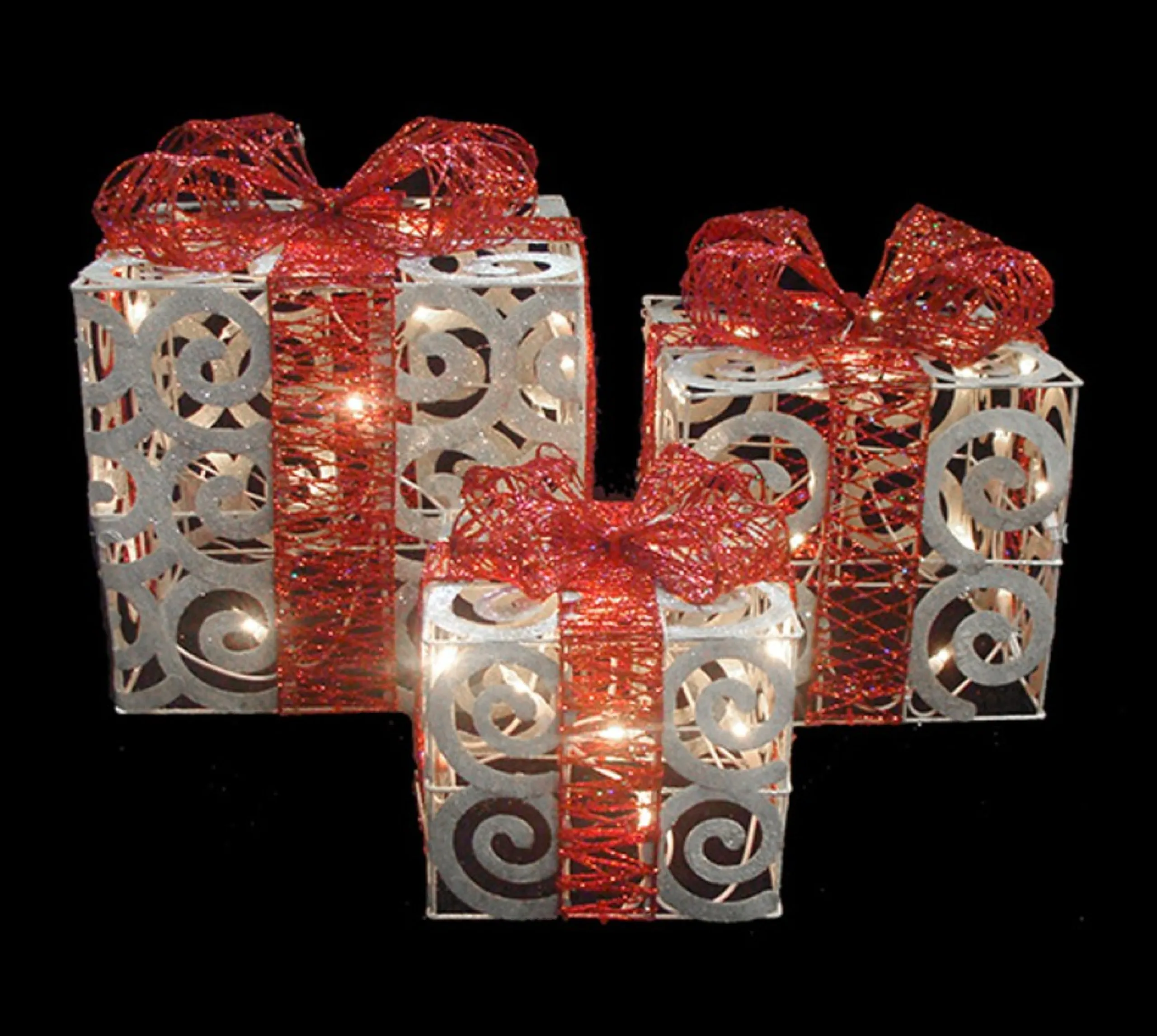Get Into The Holiday Spirit With This Gift Box Set. This Set Features Elegant-Looking Pre-Lit Gift Boxes That Are White Swirls With Red Bows And Accented With Glitter. These Will Be The Perfect Addition To Your Porch, Entryway, Tabletop, Or Anywhere You Wish To Add A Little Holiday Charm.