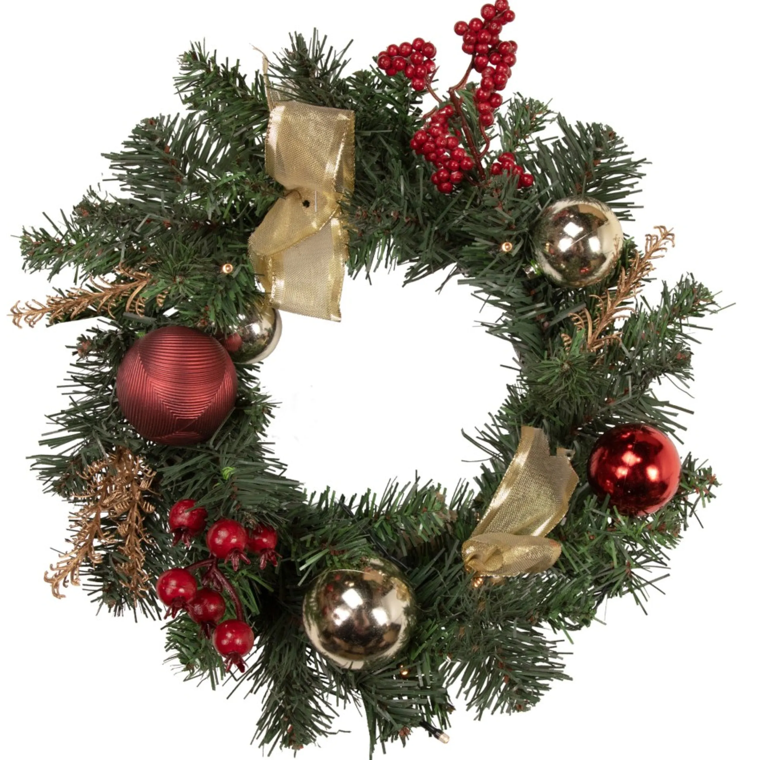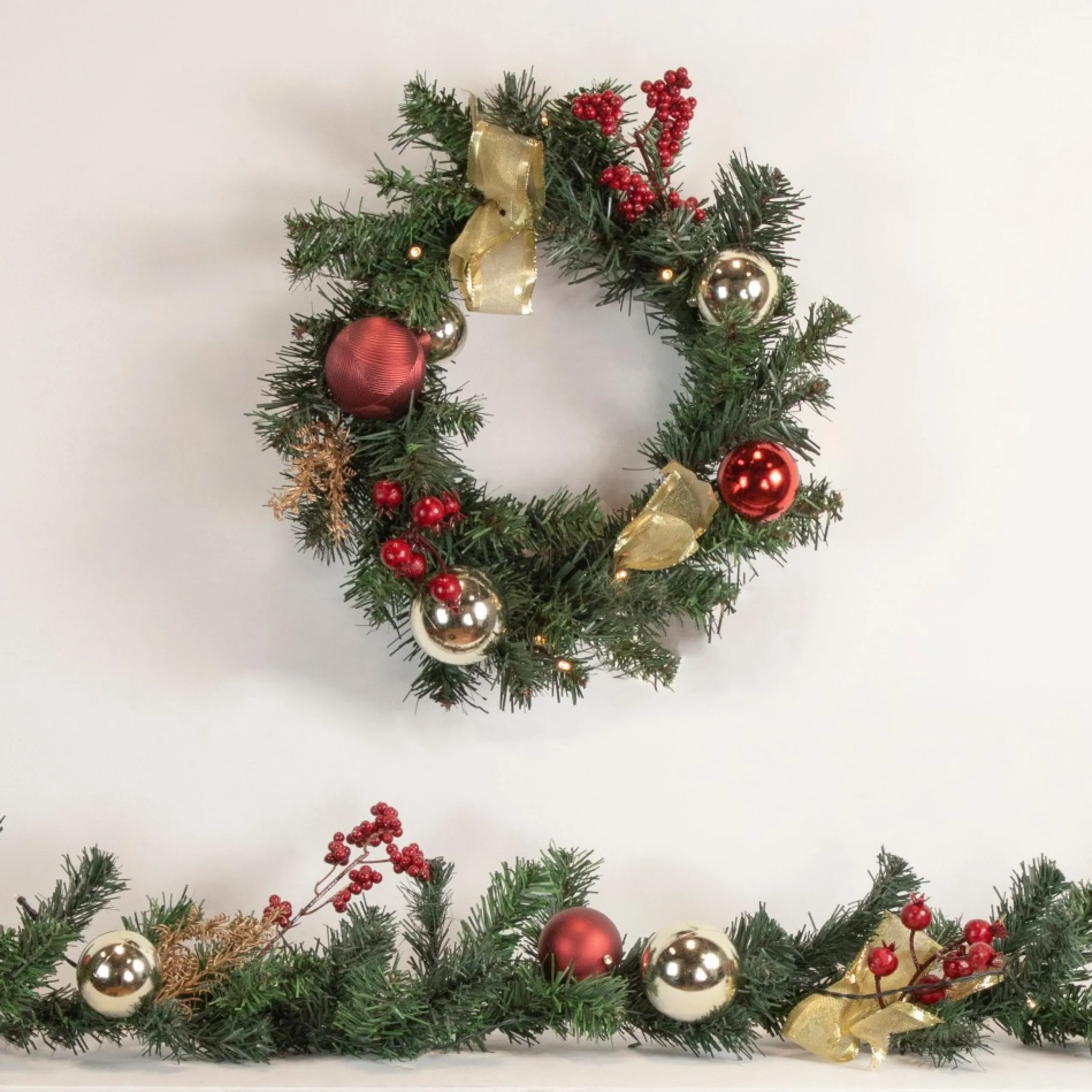With The Hustle And Bustle Of The Holiday, You May Not Have Enough Time To Fully Decorate Your Home This Season. This Lovely Pre-Decorated Green Pine Wreath Will Make This Year’s Decorating A Breeze. This Wreath Is Accented With Burgundy And Gold Ball Ornaments, Striped Ribbon, And Red Berries. The Battery-Operated Lights Will Add A Bit Of Sparkle To Any Space. This Wreath Is Perfect For Hanging On Walls, On A Door, Or Adding Candles And Creating A Unique Table Decoration. This Wreath Will Be A Great Addition To Your Holiday Decor For Many Years.