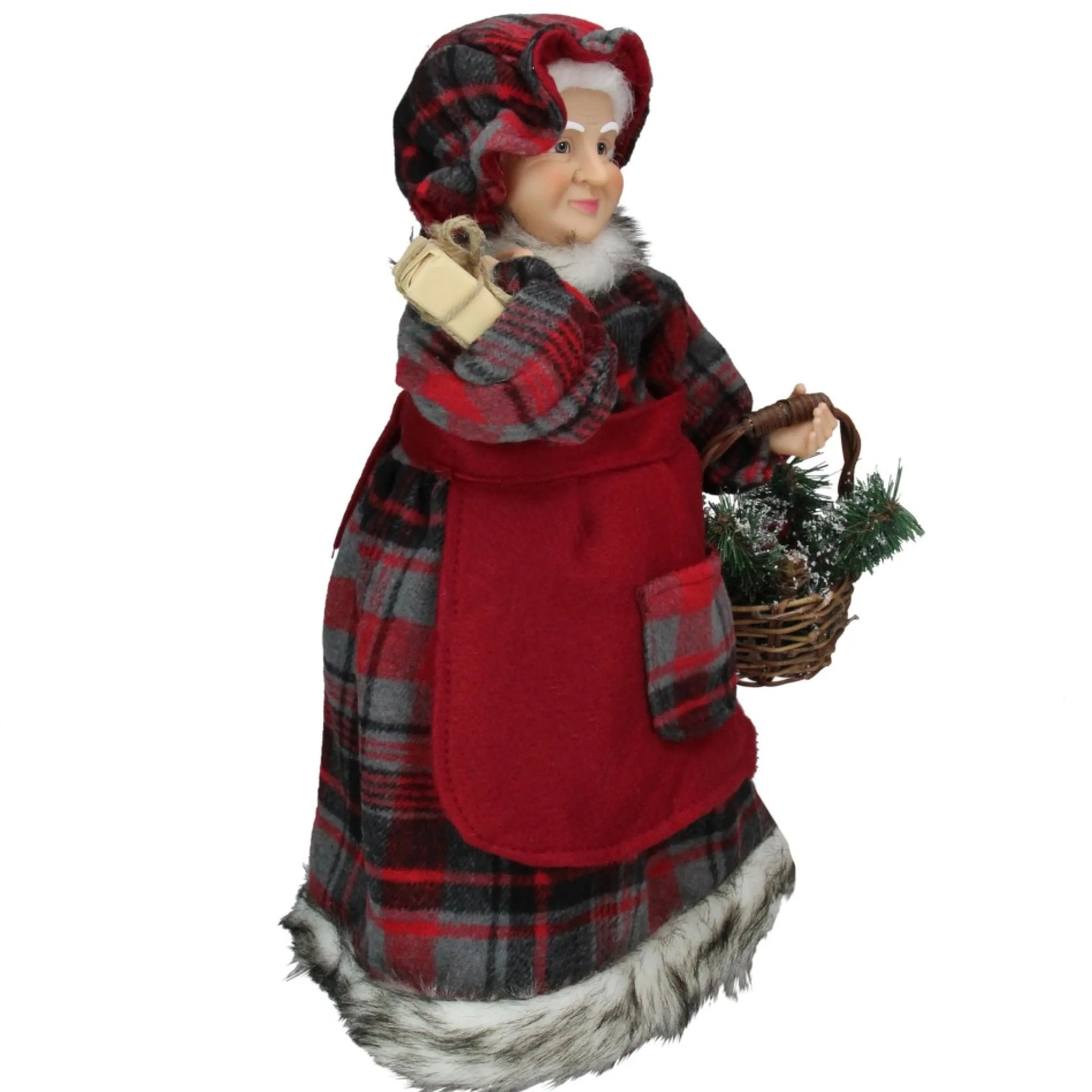 Full Of Country Charm, Mrs. Claus Will Make A Jolly Addition To Your Holiday Festivities! She Is Wearing A Warm And Cozy Plaid Red, Gray, And White Faux Fur-Trimmed Dress, A Red Plaid Bonnet, And A Red Apron With A Plaid Pocket. She Is Accented With A Wrapped Present And A Basket Of Frosted Pine And Pinecones. Perfect To Add To Any Room In Your Home That Needs A Little Bit Of Holiday Cheer.