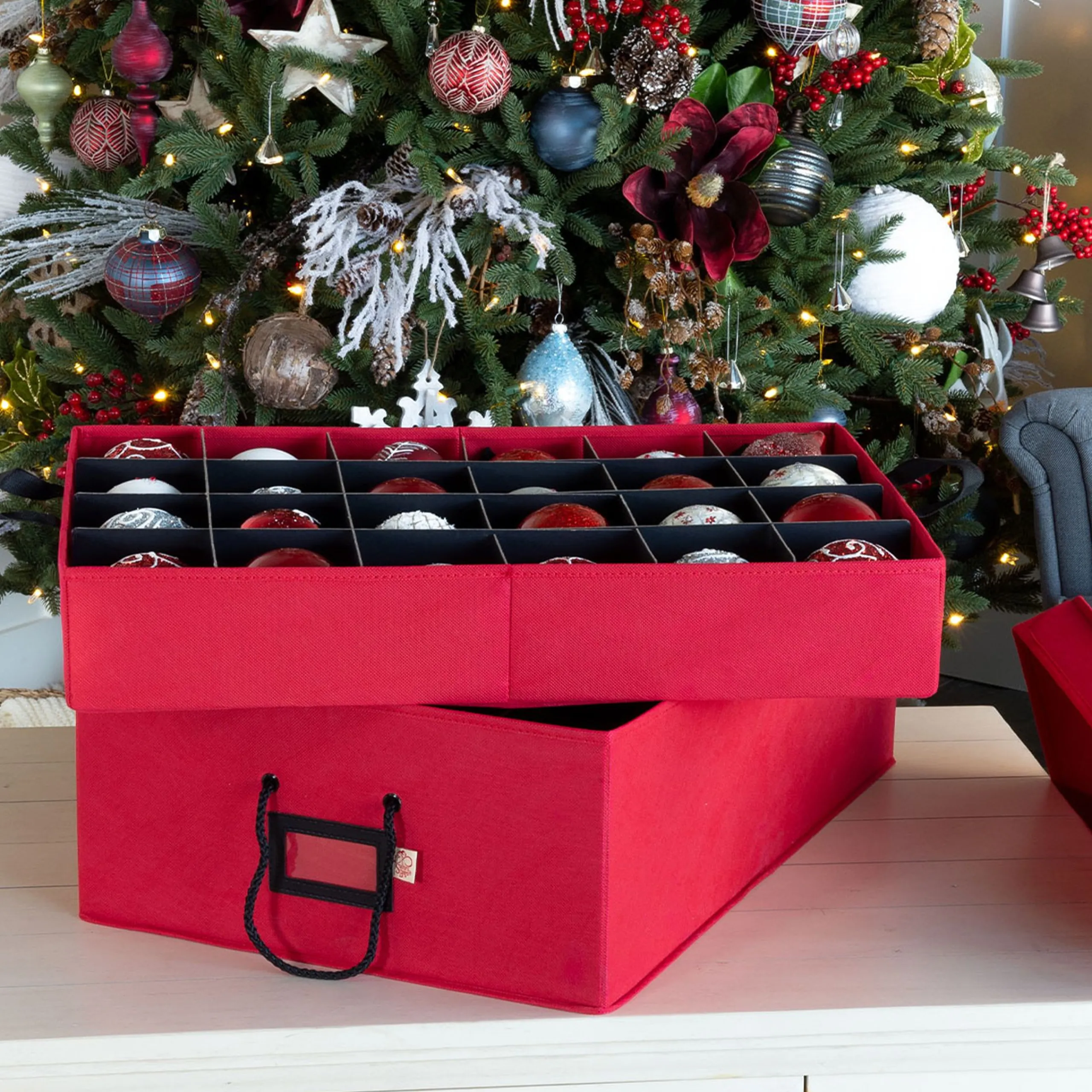 The Two Tray 4″ Ornament Storage Box Will Hold Your Ornaments Safe And Organized All Year Long. The Lightweight Box Holds 48 4″ Ornaments, 24 In Each Tray, With Dividers Between The Ornaments. The Trays And Dividers Are Acid-Free To Protect The Vibrant Colors Of Your Ornaments From Damage And Discoloration. While Decorating The Tree, The Trays Can Be Removed And Individually Carried Allowing You To Place The Ornaments Onto The Tree Right Out Of The Tray. To Keep Track Of Your Ornaments The Front Of The Box Has A Clear Id Window For Tags Listing The Contents Of The Box. The Ornament Storage Box Features A Decorative Exterior Pattern With Matching Braided Rope Carrying Handles. The Two Tray Ornament Box Will Keep Your Ornaments Safe And Shining Year After Year.
