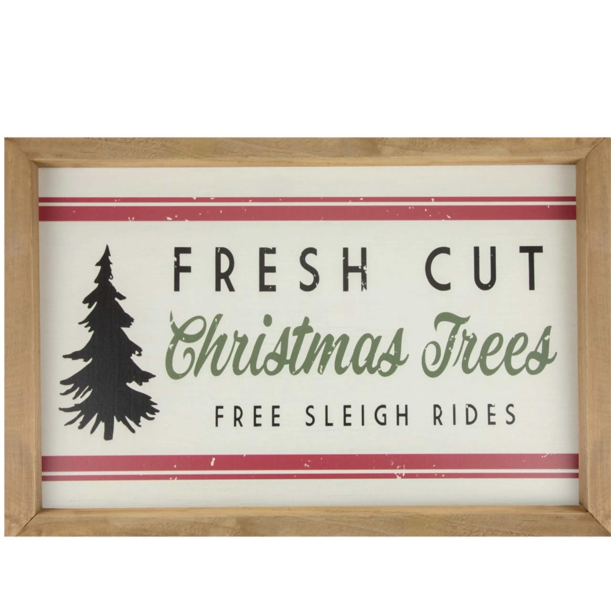 Add This Wooden Wall Sign To Your Holiday Decor! The Rectangular Plaque Features A Pine Tree And Reads “Fresh Cut Christmas Trees Free Sleigh Rides”. This Wall Decor Is A Perfect Addition To Any Empty Space In Your Home To Bring Christmas Joy.