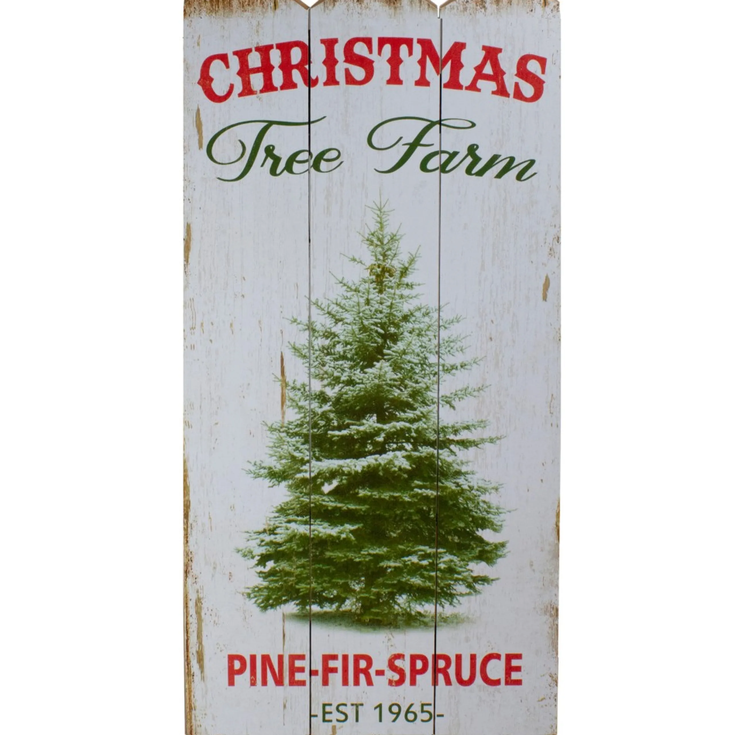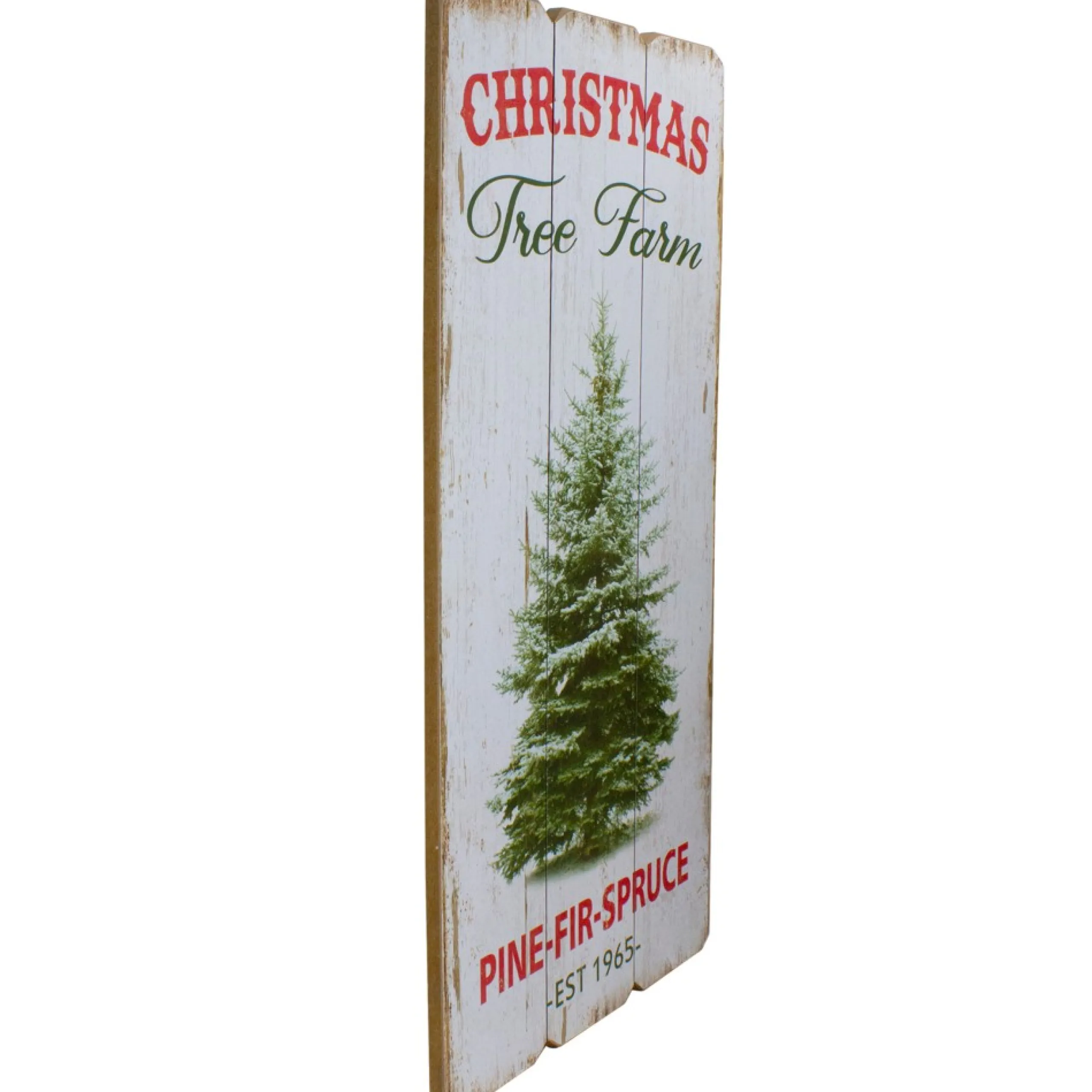 Give Your Home A Country Time Feel This Holiday Season With This Rustic Wooden Sign. It Features White-Washed Wooden Planks With A Picture Of A Green Tree In The Middle And Reads ‘Christmas Tree Farm’ At The Top And ‘Pine-Fir-Spruce Est 1965’ At The Bottom. A Great Way To Spruce Up Your Holiday Decor.