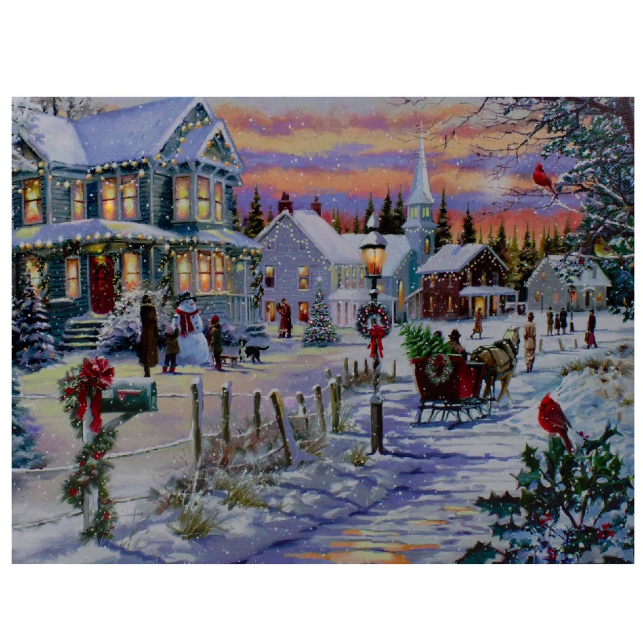 This Stunning Winter Village Scene Depicts A Beautiful Victorian-Style House, A Church And A Horse-Drawn Sleigh Ride. It Comes Illuminated With Both Led Lights And Color-Changing Fiber Optic Lights. Christmas Scene Wall Canvas, Easily Fits Into Any Holiday Decor.