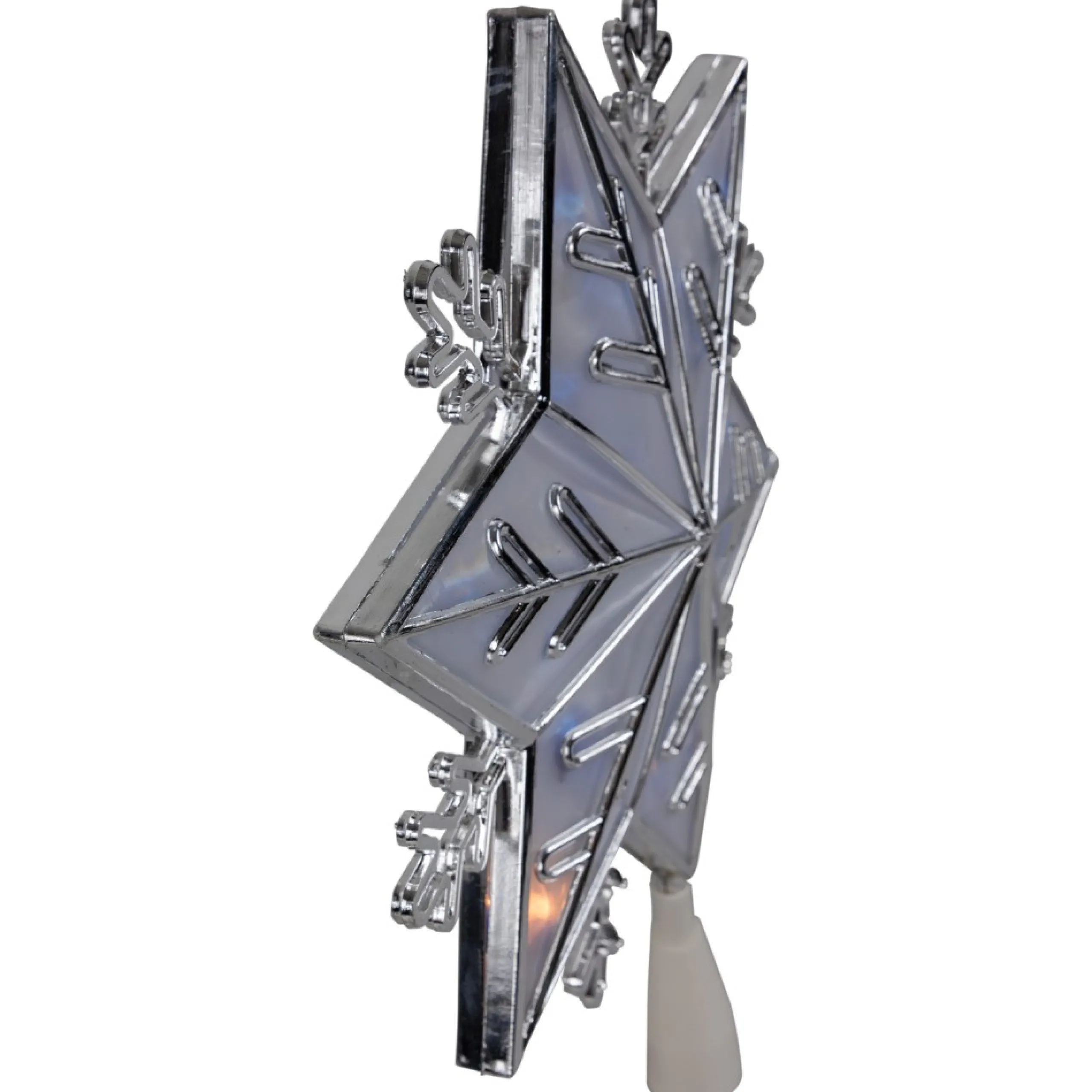 This Elegant Topper Features A Stunning Silver Frame With A Frosted Center, Creating A Beautiful Snowflake Effect That Complements Any Tree. The Blue Lights Shine Through The Frosted Center, Creating The Appearance Of Twinkling Stars. This Topper Is Perfect For Adding A Touch Of Sophistication And Charm To Your Holiday Decor. Bring A Piece Of Winter Wonderland Into Your Home This Holiday Season With Our Snowflake Christmas Tree Topper.