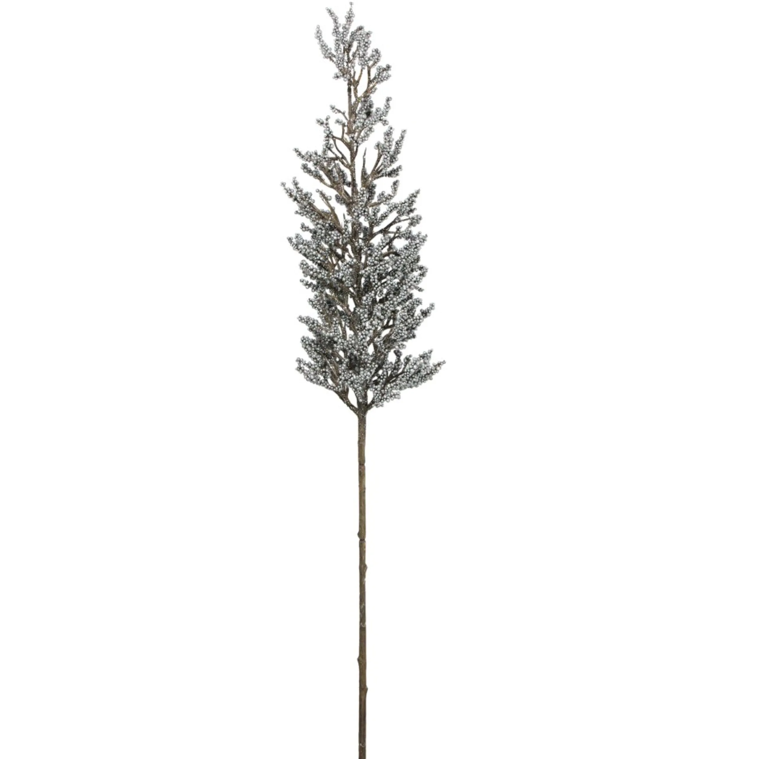 Features A Bark Brown Branch Covered With A Silver Glitter Dusted Pine Sprig At The Top