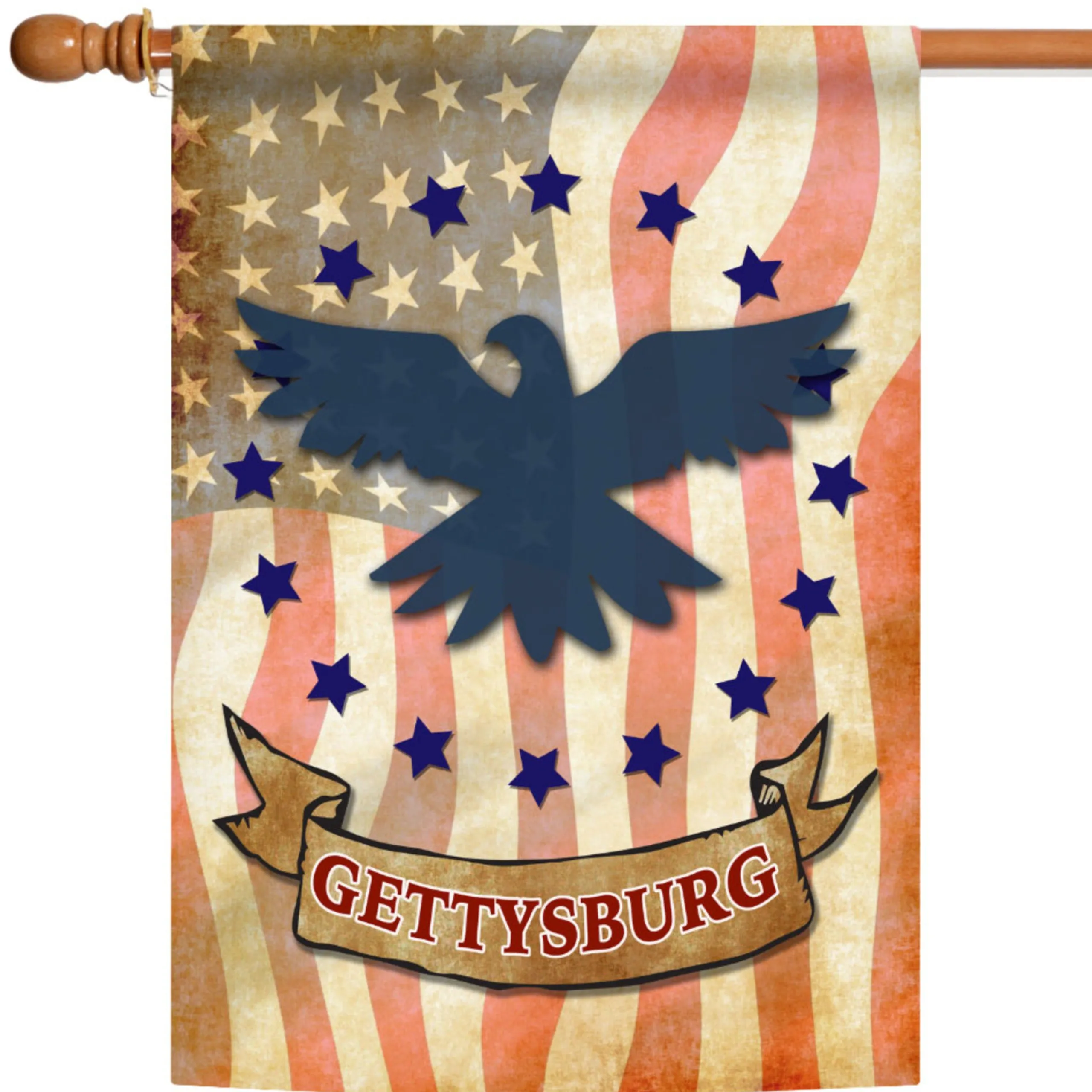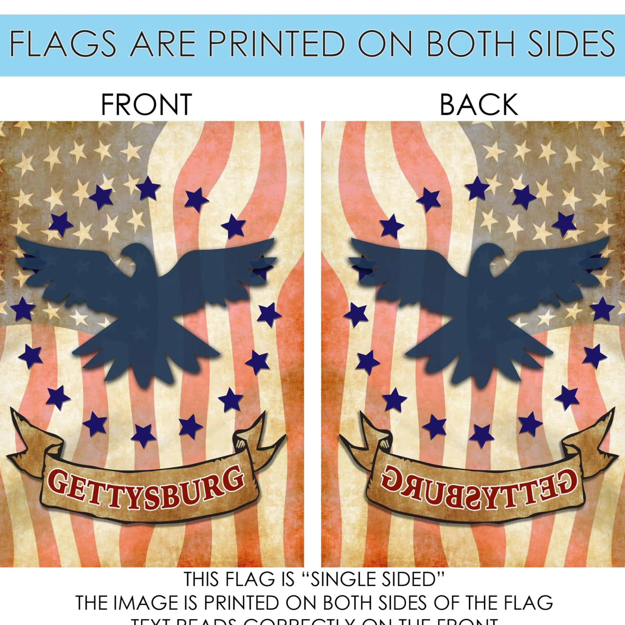 Celebrate The Spirit Of Patriotism And Honor The Historic Battle Of Gettysburg With This House Flag. This Flag Proudly Displays The Word “Gettysburg” In Bold Letters, Reminding Us Of The Significance Of This Pivotal Moment In American History. The Flag Is Adorned With A Majestic Eagle, A Symbol Of Freedom And Strength, Surrounded By Stars Against The Backdrop Of The Usa Flag. Show Your Patriotism And Honor The Legacy Of Gettysburg With This Flag.