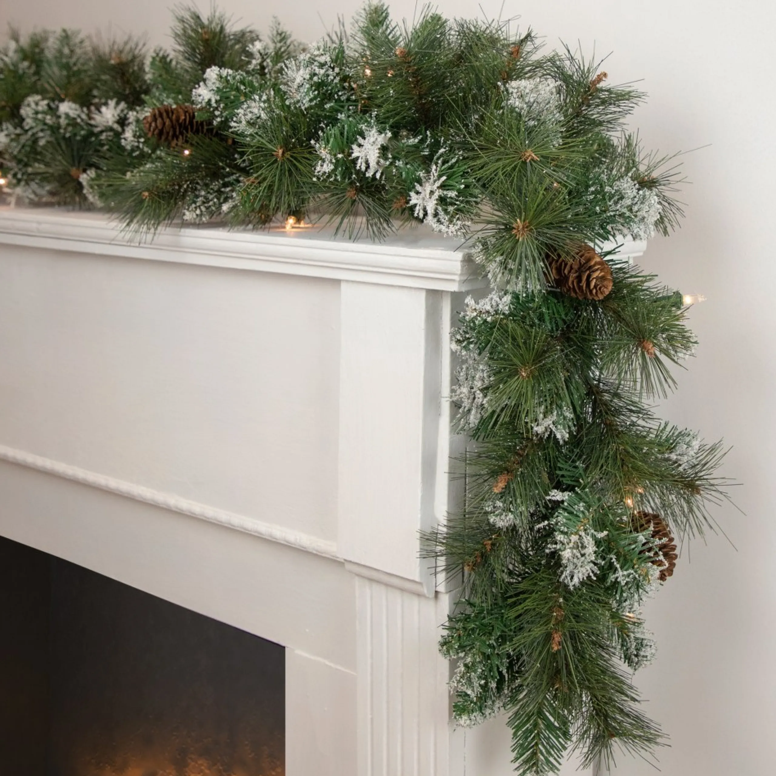 Bring The Beauty Of Winter Into Your Home With This Frosted Artificial Snow Valley Pine Garland. Crafted From Traditional Green Pine Needles Mixed With Long Needle Pine To Create Depth And Fullness. The Branches Have A Frosted Feature That Mimics A Real Tree In Nature After A Light Snowfall. The Added Pine Cones Create A Rustic Feel To Any Decor Style. The Dazzling Clear Incandescent Mini Lights Add Some Extra Sparkle To The Garland And The Surrounding Area. Sure To Impress Your Guests Wherever You Place It.