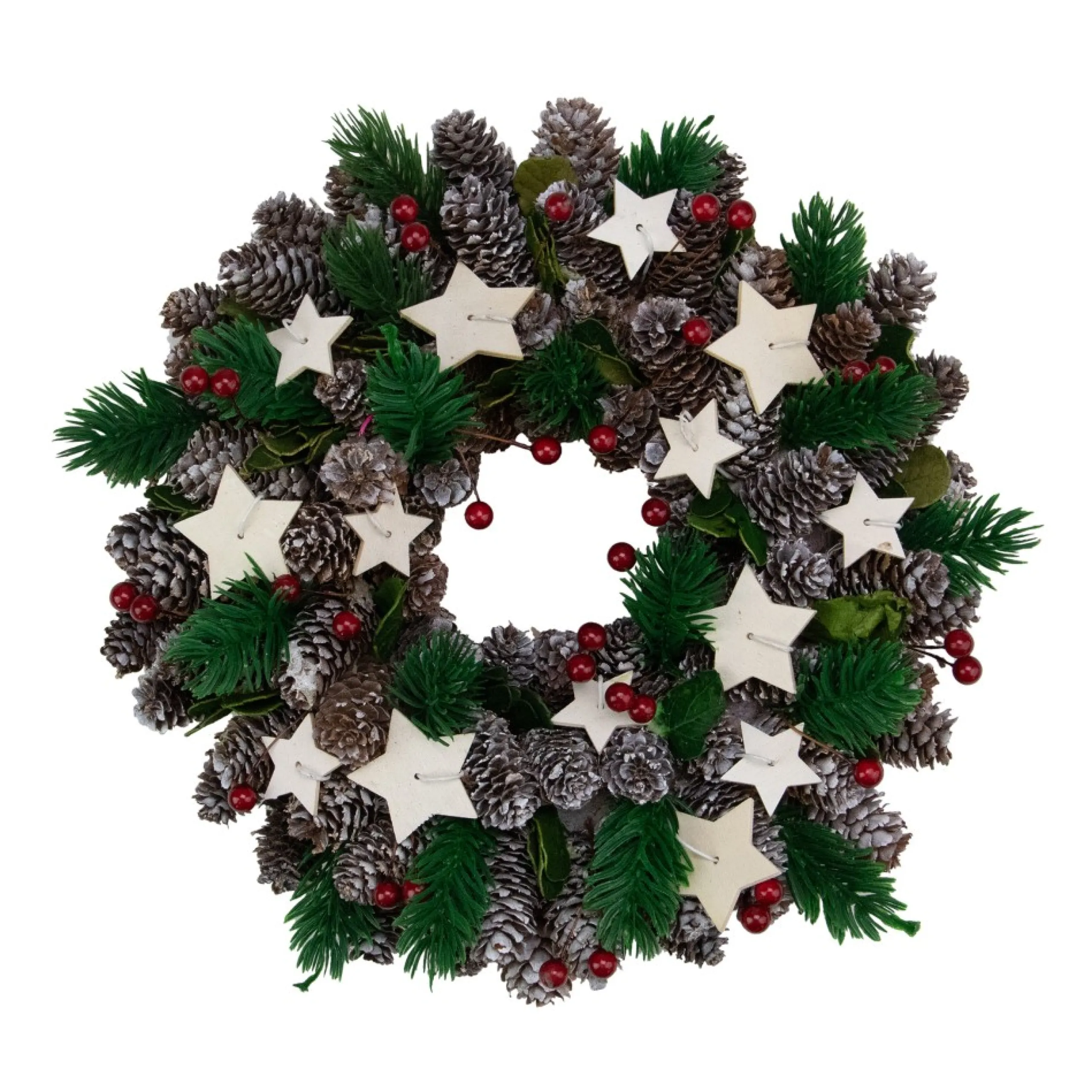 This Rustic Pine Cone Wreath Lends A Warm And Cozy Feel. Pine Sprigs, Leafy Foliage, Berries, And Wooden Stars Embellish This Wreath. A Light Dusting Of Glitter And White-Tipped Pine Cones Provides A Wintry Look. Ideal For Doors, Walls Or As Part Of Your Holiday Table Centerpiece.