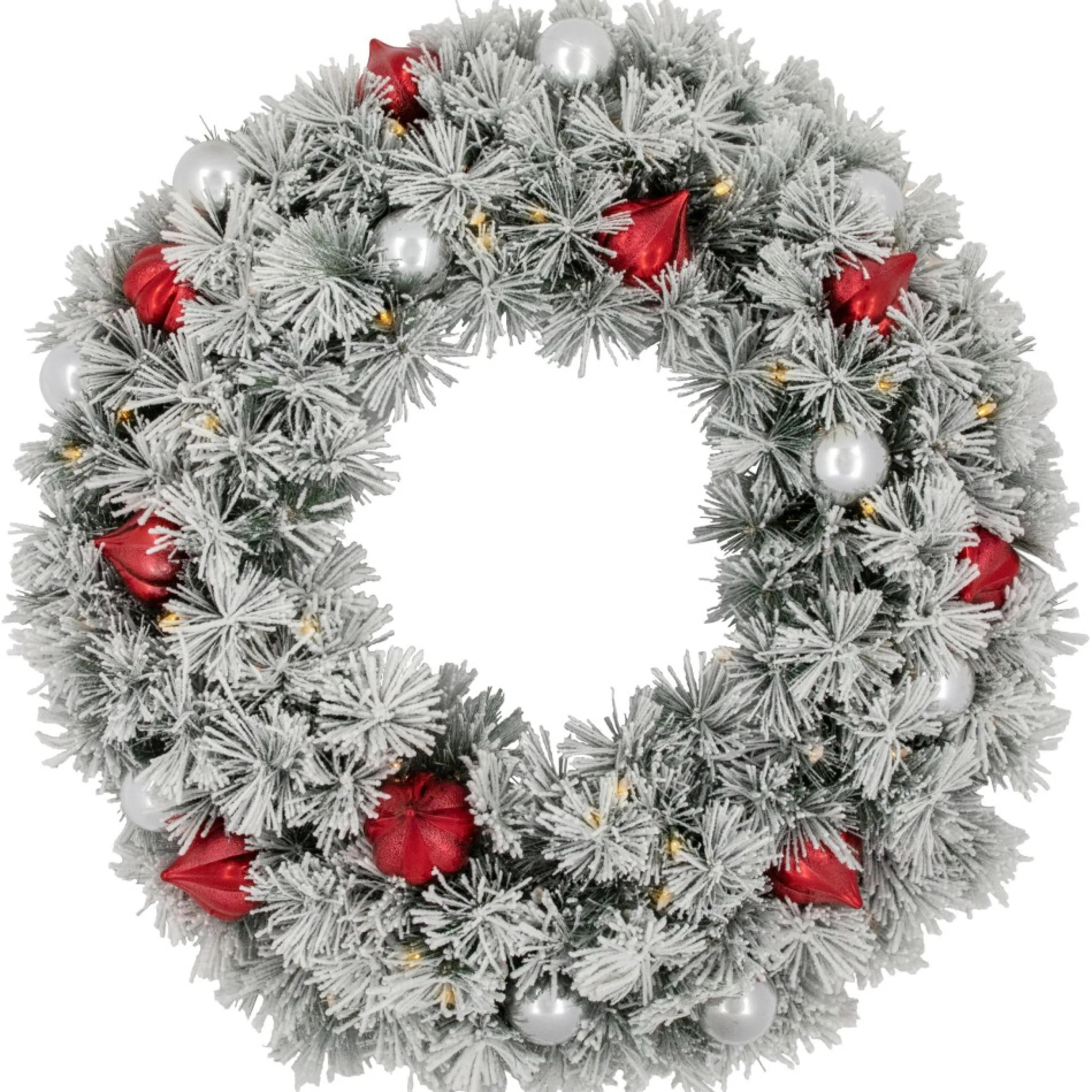 Show Your Holiday Spirit With This Pre-Lit, Battery Operated Artificial Wreath With Timer. Designed To Impress, This 30-Inch Enchanting, Snowy Bristol Pine Wreath Comes Pre-Lit With Warm White Led Lights That Add A Warm And Inviting Glow To Any Space. Its Heavily Flocked Branches Create A Lush And Voluminous Appearance, Adding A Touch Of Elegance To Your Doors And Mantles. Comes Pre-Decorated With Red And Silver Ornaments. This Wreath Can Be Used Year After Year, Making It A Perfect Addition To Your Holiday Decor. Hang It Above The Fireplace, Use It As As A Stunning Centerpiece Or Anywhere Else In Your Home To Infuse A Festive Ambiance That Will Delight Your Family And Guests Throughout The Holiday Season.
