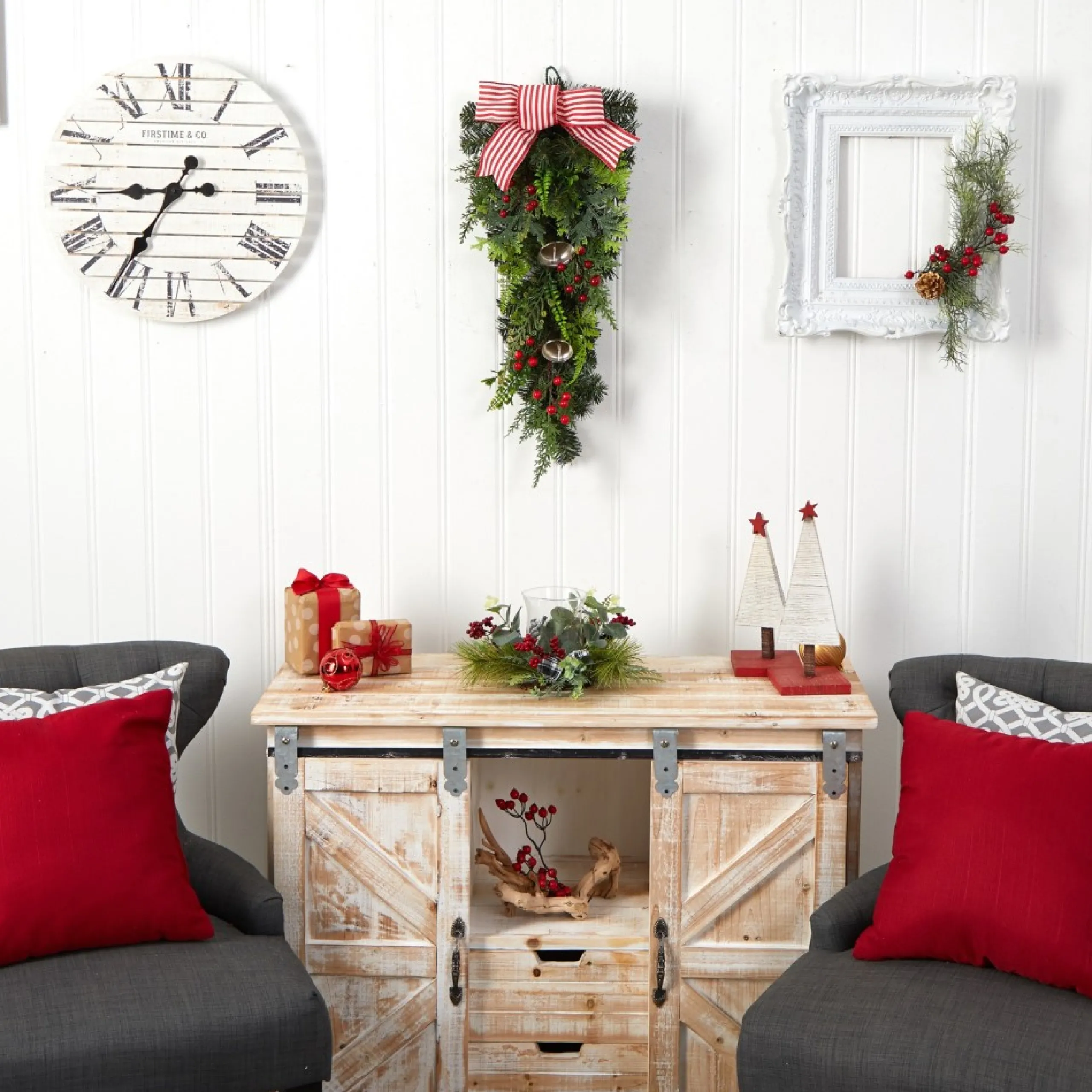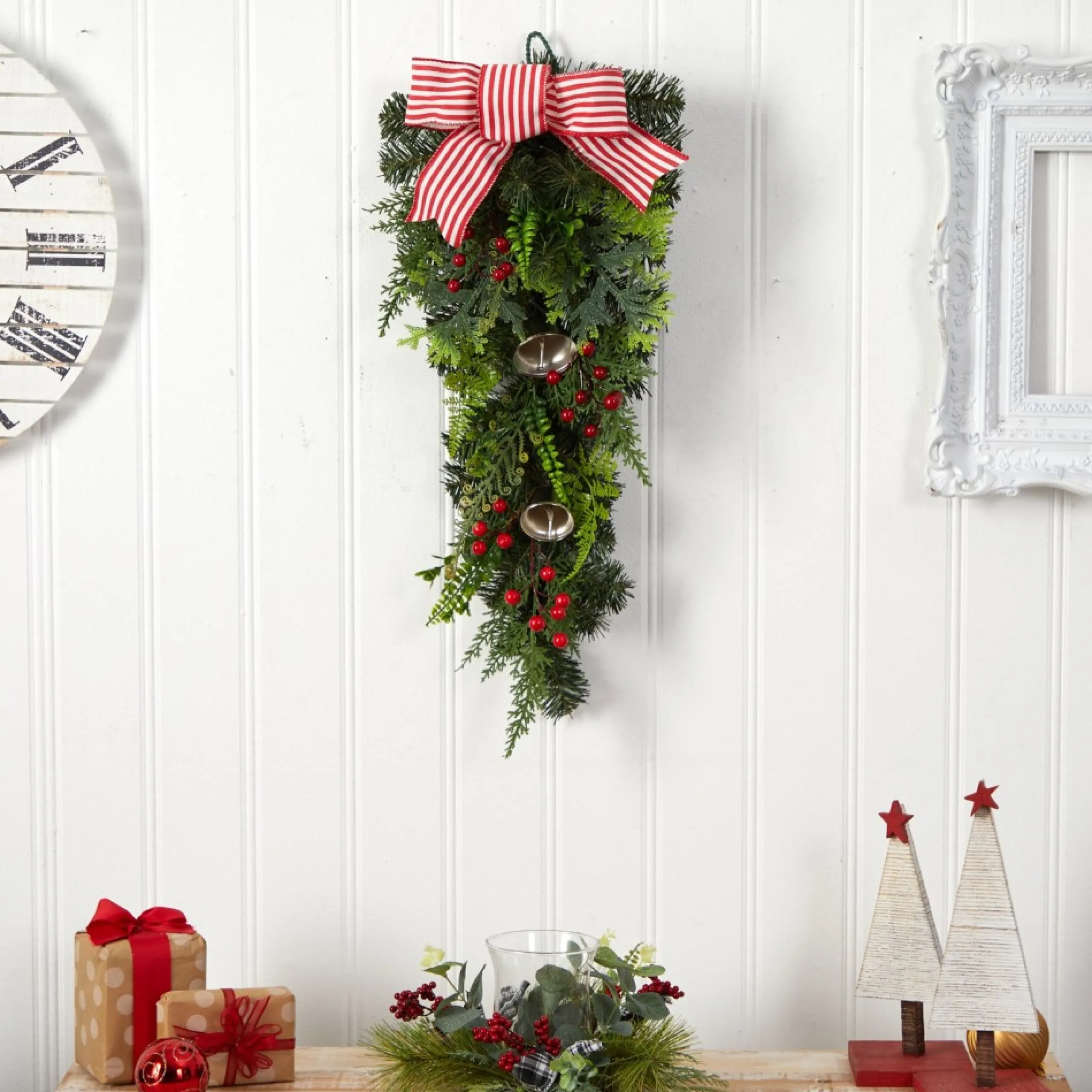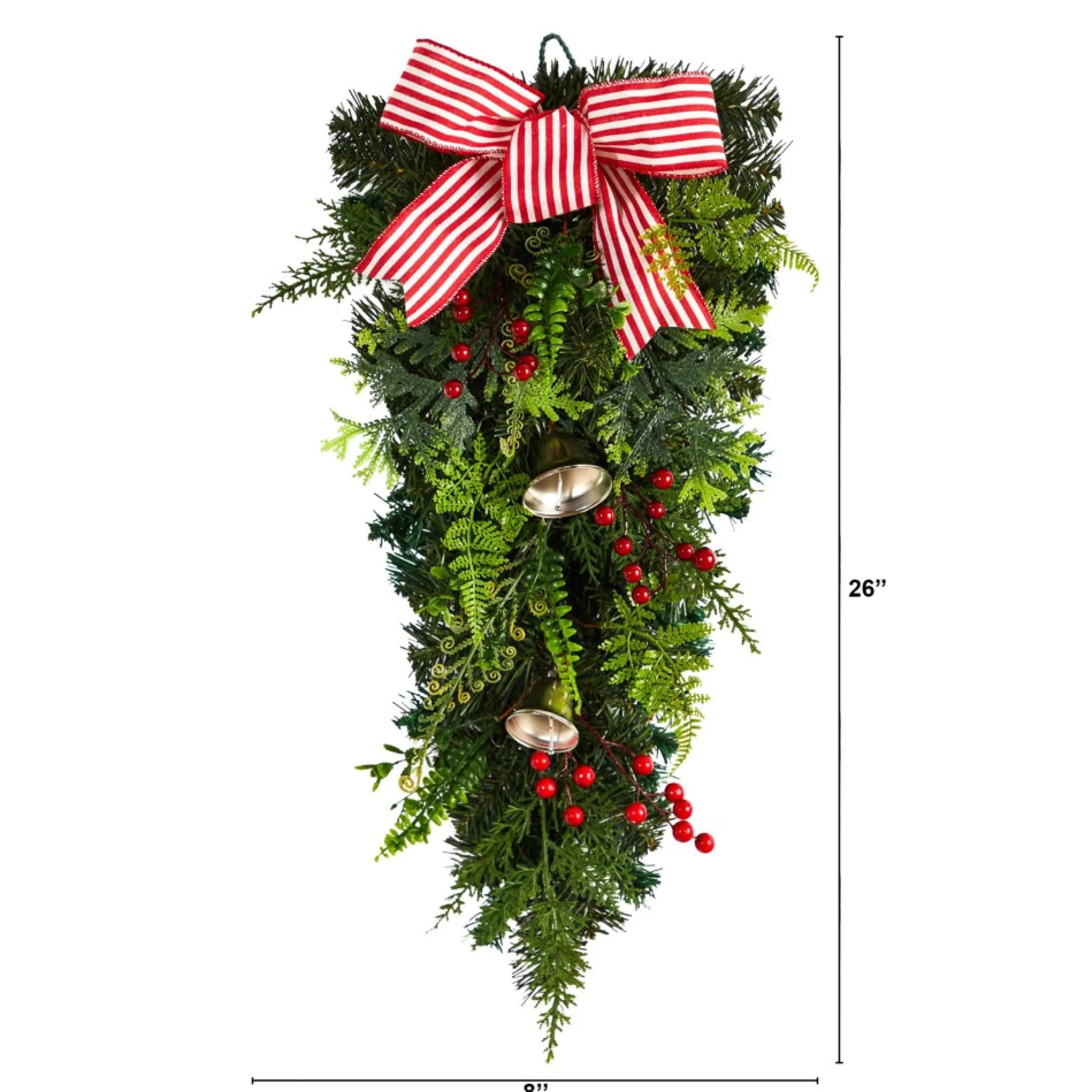 Unlit Teardrops*Nearly Natural 26″ Bells And Bow Artificial Christmas Teardrop Swag, Unlit