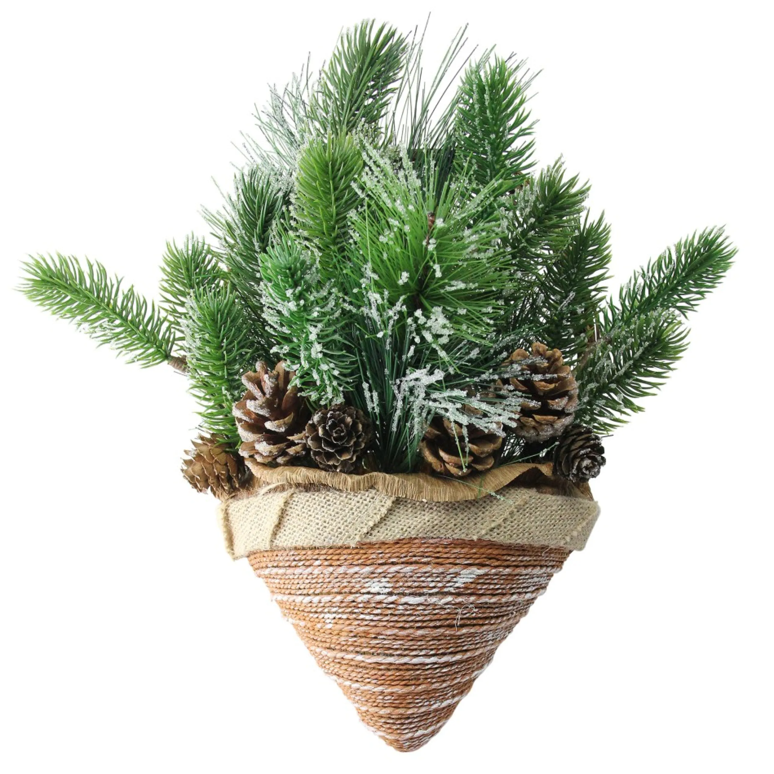Ice Pine Cones And Branch Tips In Burlap Basket