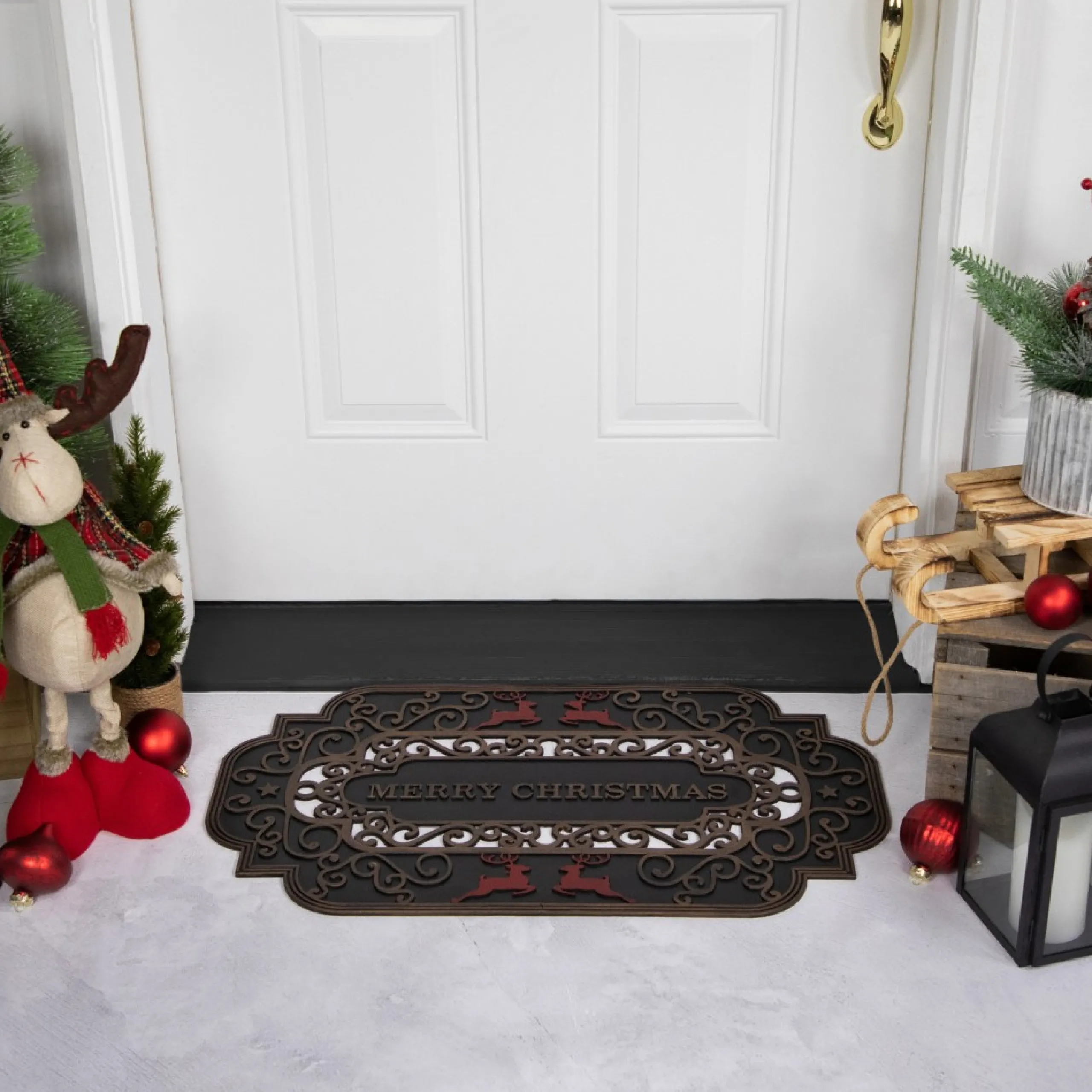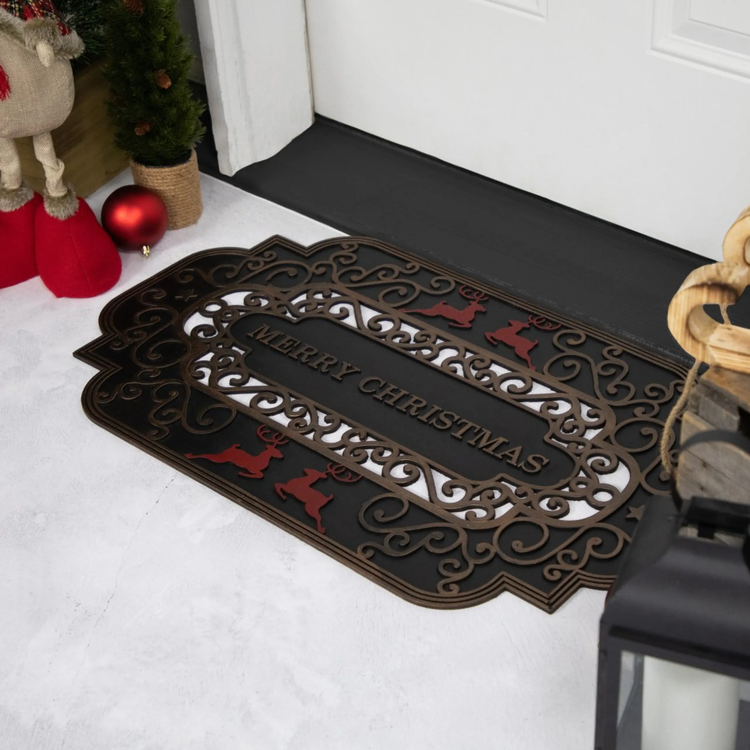 Add A Festive Touch To Your Home With Our “Merry Christmas” Doormat. This Doormat Features Elegant Scroll Patterns And 2 Jumping Reindeer, Making It The Perfect Way To Welcome Your Guests During The Holiday Season. The Black And Copper Colors Create A Classic And Timeless Look That Will Complement Any Decor Style. Made With Durable Material, This Doormat Will Withstand The Elements And Heavy Foot Traffic, Ensuring It Will Last For Many Holiday Seasons To Come. Spread Some Holiday Cheer With This Beautiful And Functional Doormat.