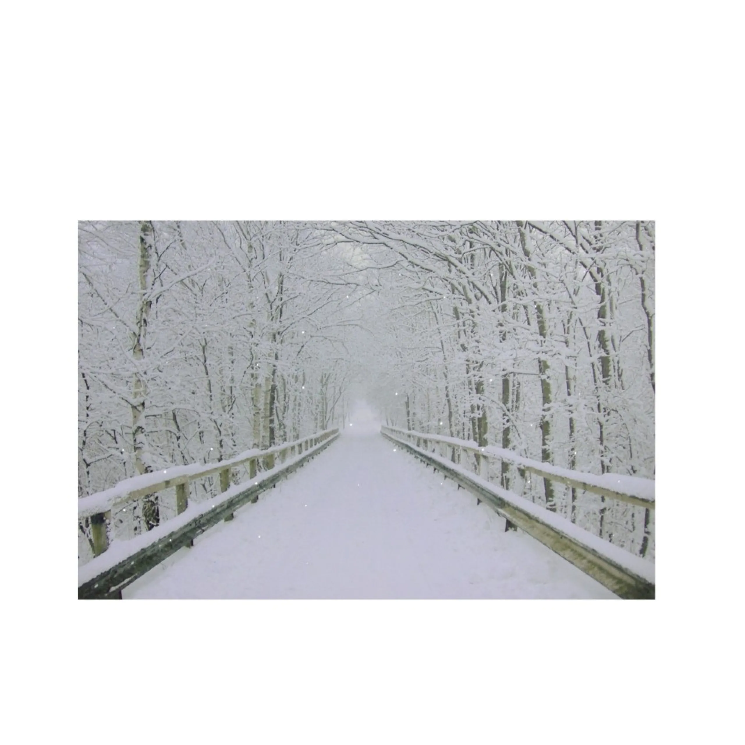 This Winter Scene Depicts A Snow Covered, Wooden Bridge Among Mighty, Snow Dusted Trees