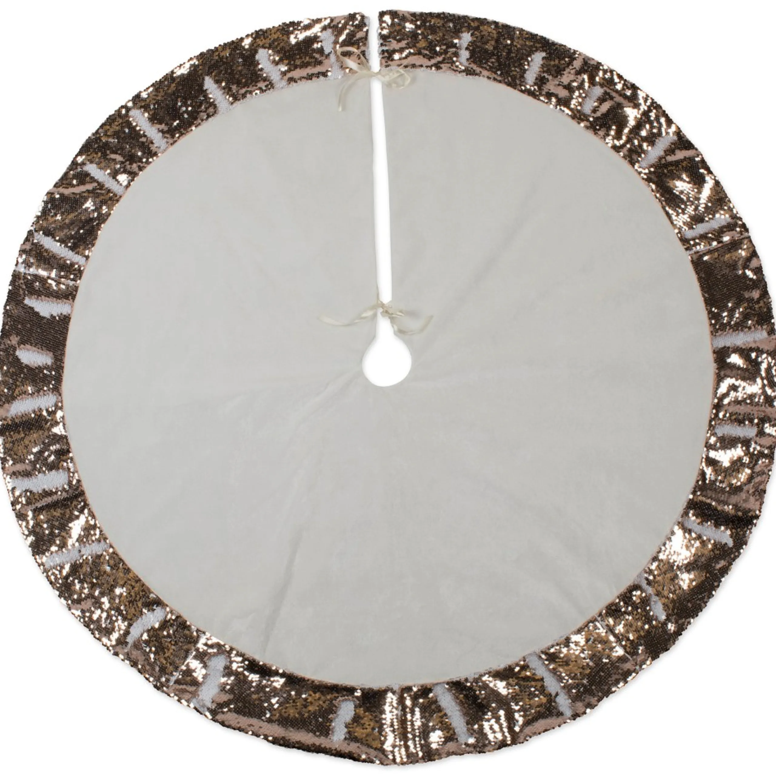 Features Cream Velvet With Champagne Sequin Border Tree Skirt