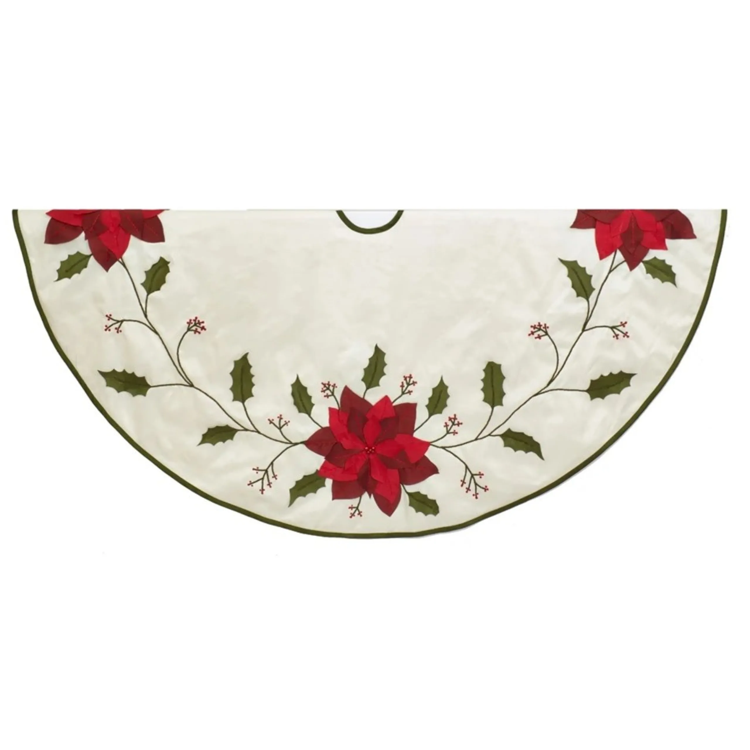 This Ivory And Red With Poinsettia Applique Tree Skirt Is A Festive Way To Add To Your Christmas Tree. This Tree Skirt Features An Ivory Design With Classic Poinsettias And Holly Leaves. This Tree Skirt Is Accented With Green Trim. Great For All Kinds Of Holiday Decorations Including Tree Trimming, Mantle Displays, Tabletop, Centerpieces, And More.