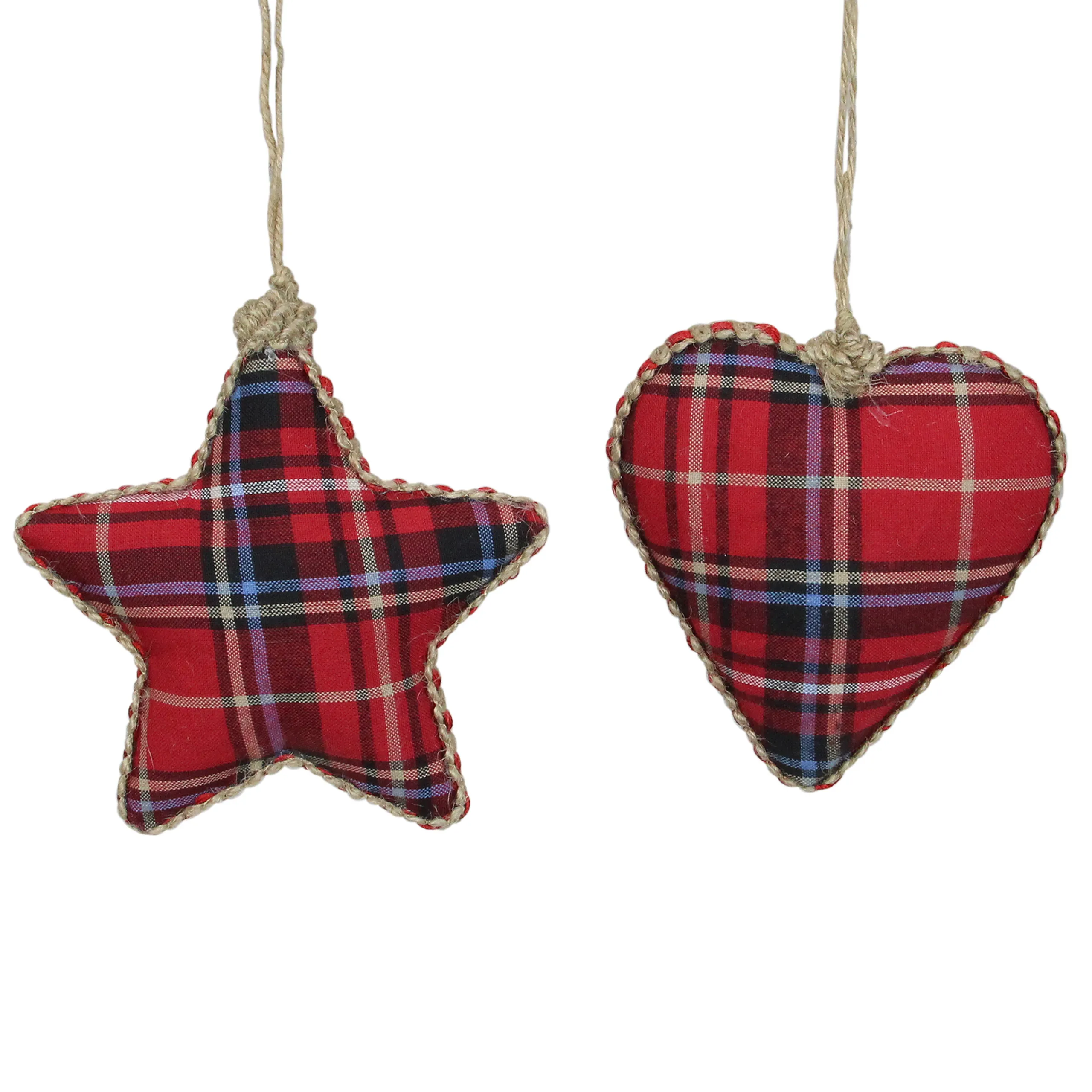 Allstate Stars>Set Of 2 Red Plaid Heart And Star Shatterproof Christmas Ornaments 5″