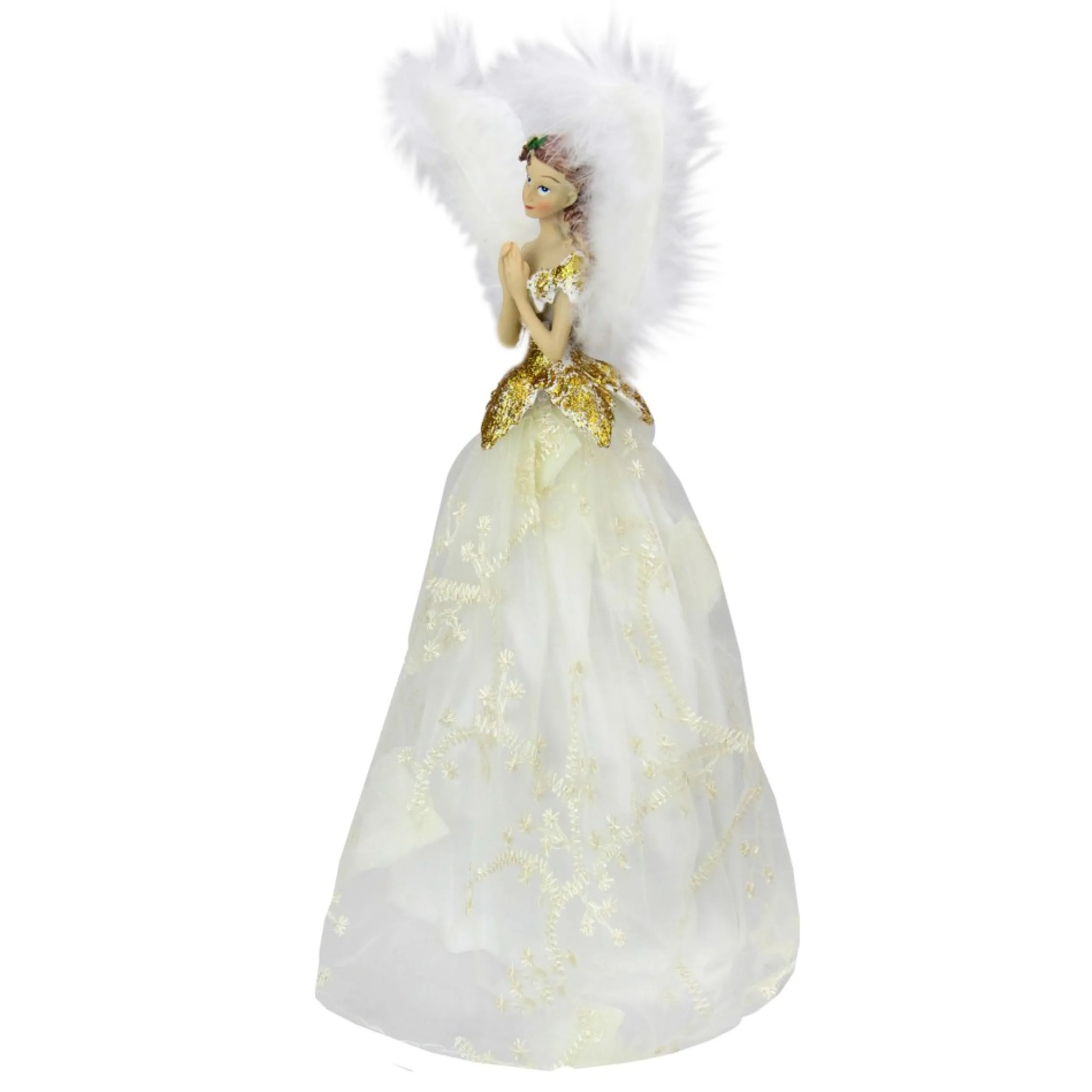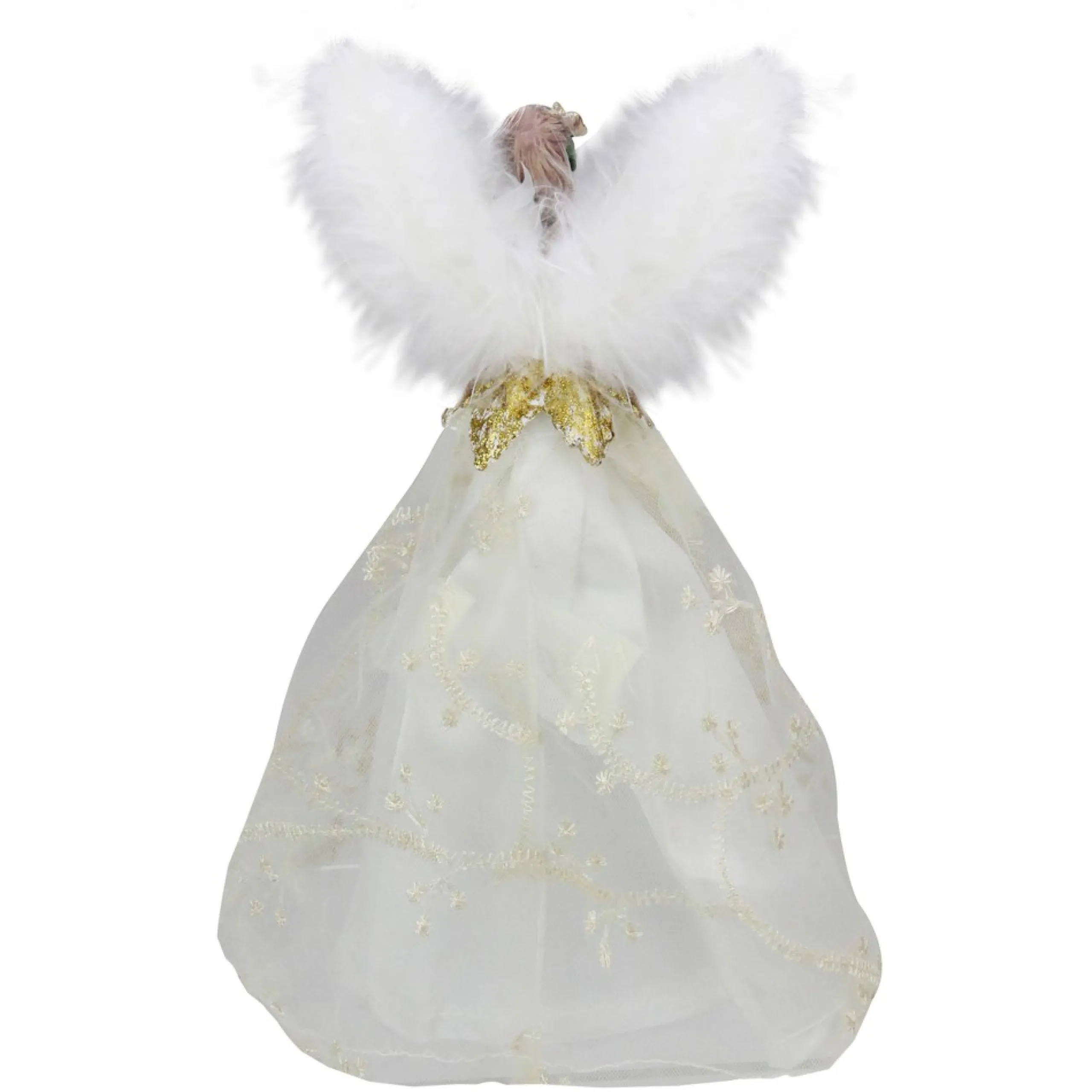 This Ethereal Angel Is A Symbol Of Grace, Radiating Pure Beauty And Heavenly Charm. Adorned In A Resplendent White Dress, Embellished With An Ivory Sheer Overlay, Delicate Floral Stitching Designs, And Shimmering Golden Accents, She Captivates All Who Behold Her. With A Captivating Flower Nestled In Her Hair, This Unlit Tree Topper Brings An Aura Of Serenity And Joy To Your Holiday Decor. Let This Celestial Angel Be The Crowning Glory Of Your Festive Celebrations, Spreading Peace And Magic Throughout Your Home.