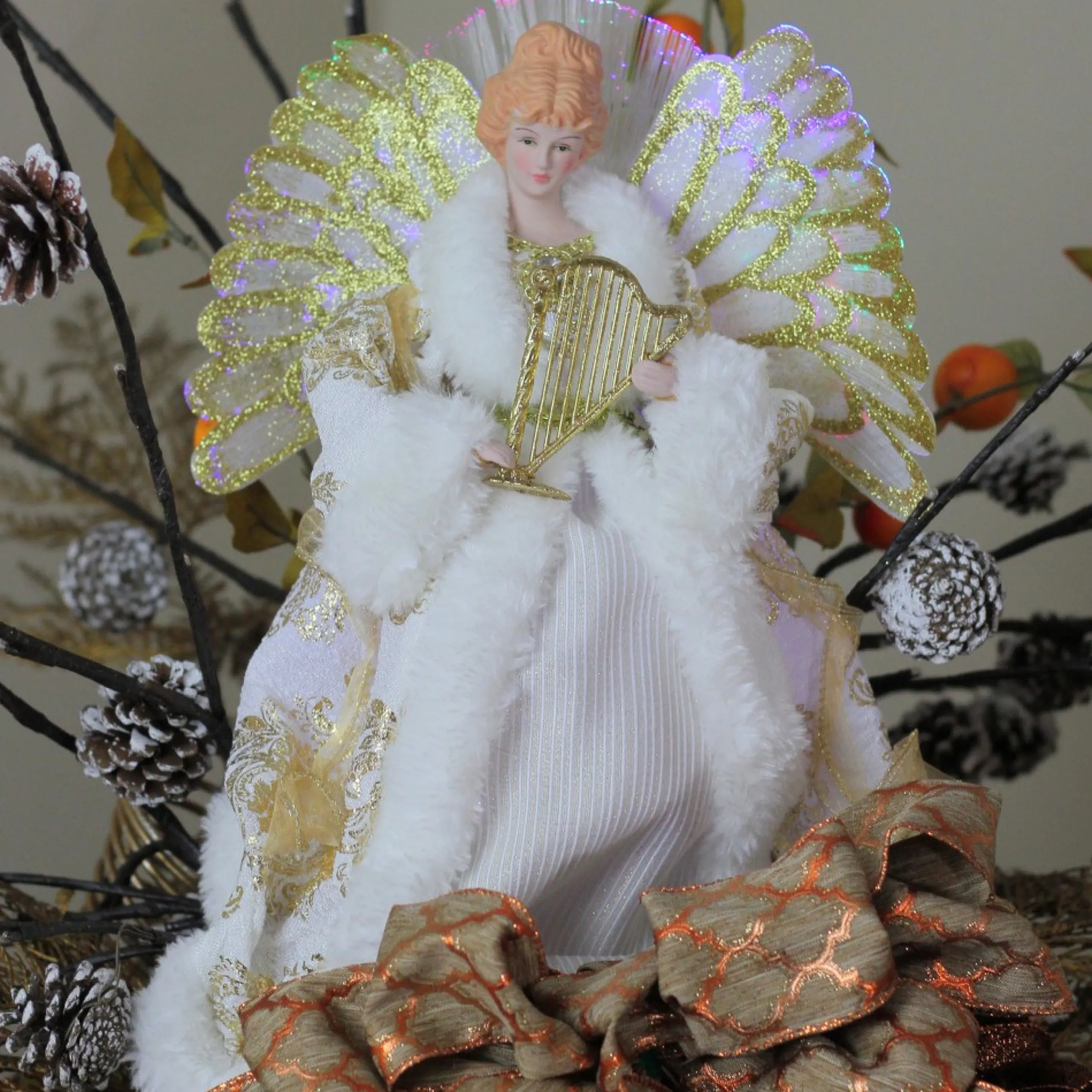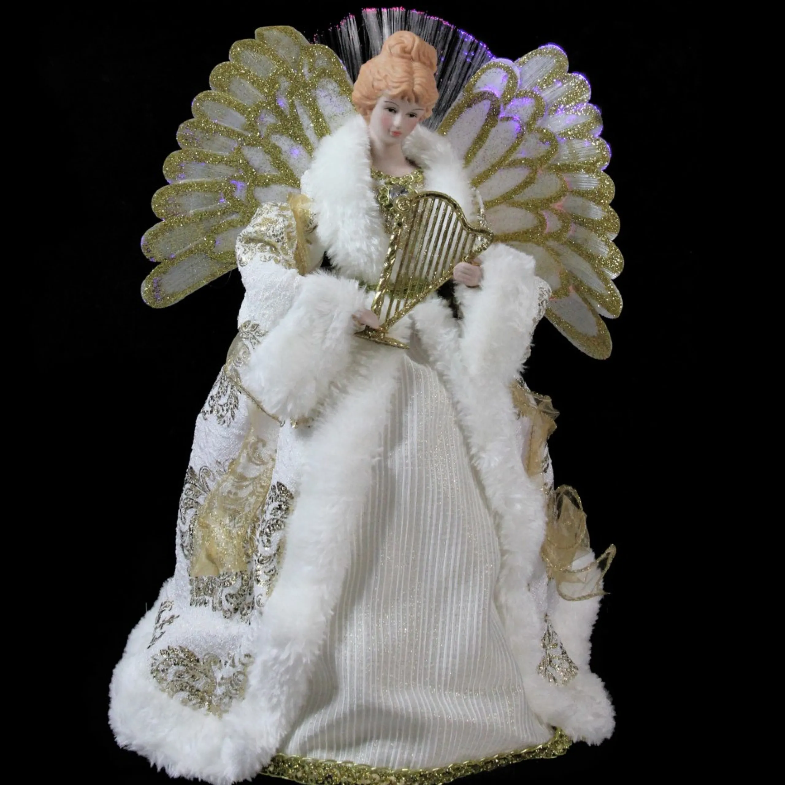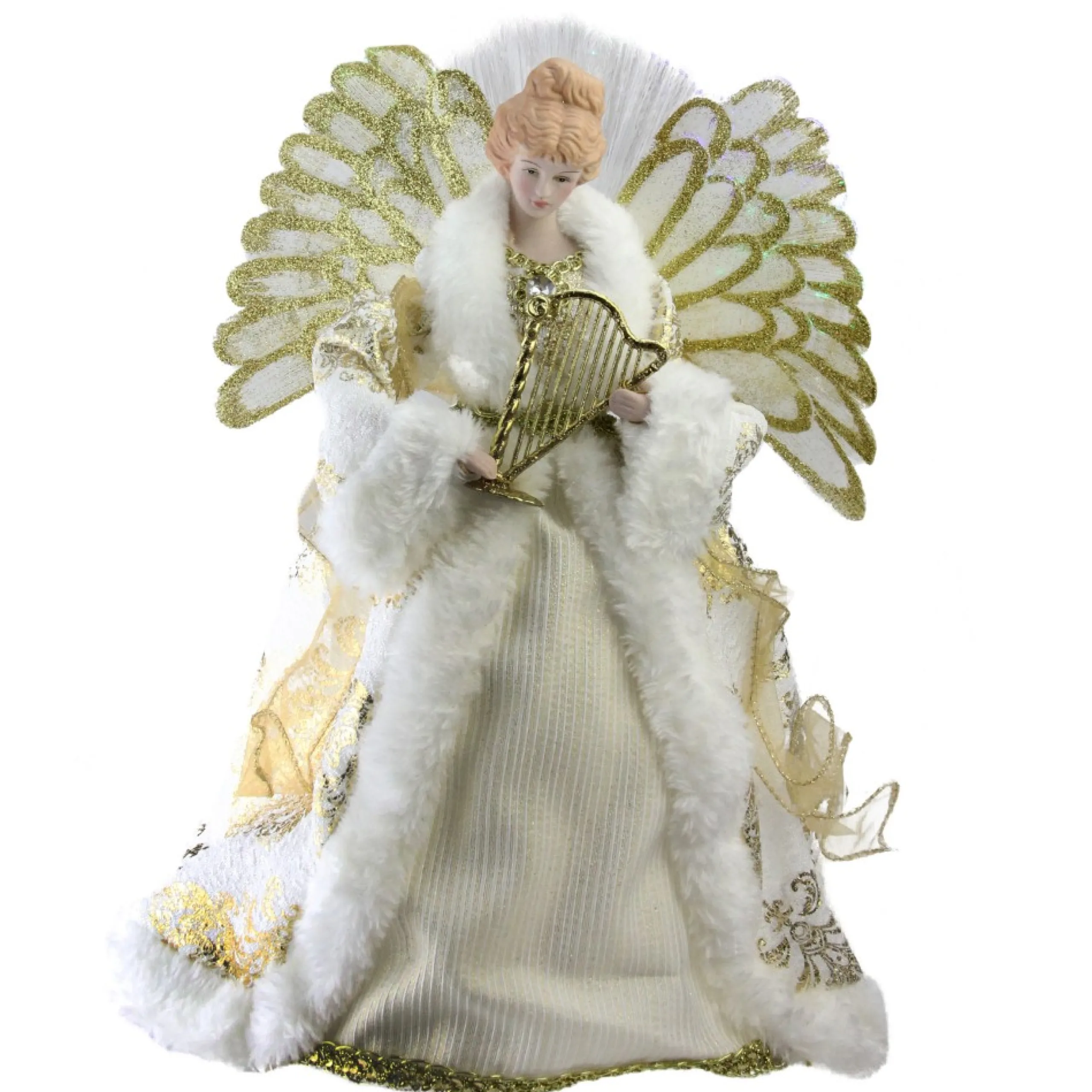 Angel Tree Toppers*Northlight 12″ Lighted Fiber Optic Angel In Gold And Cream Gown With Harp Christmas Tree Topper