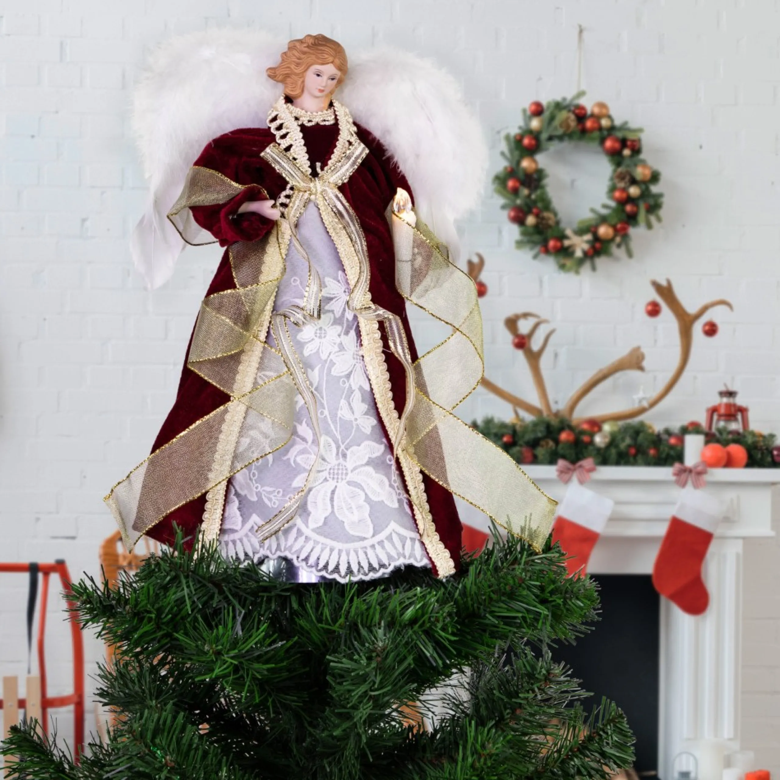 Add A Touch Of Elegance And Charm To Your Christmas Tree With This Exquisite Angel Christmas Tree Topper. This Stunning Topper Showcases A Graceful Angel, Beautifully Dressed In A Burgundy And White Gown, Adorned With Intricate Details And Shimmering Gold Accents. The Angel Delicately Holds A Glowing, Lighted Candle In Her Hands, Casting A Warm And Inviting Glow Over Your Holiday Display. This Angel Tree Topper Is The Ideal Size For Most Christmas Trees, Adding A Focal Point That Captures The Spirit Of The Season.
