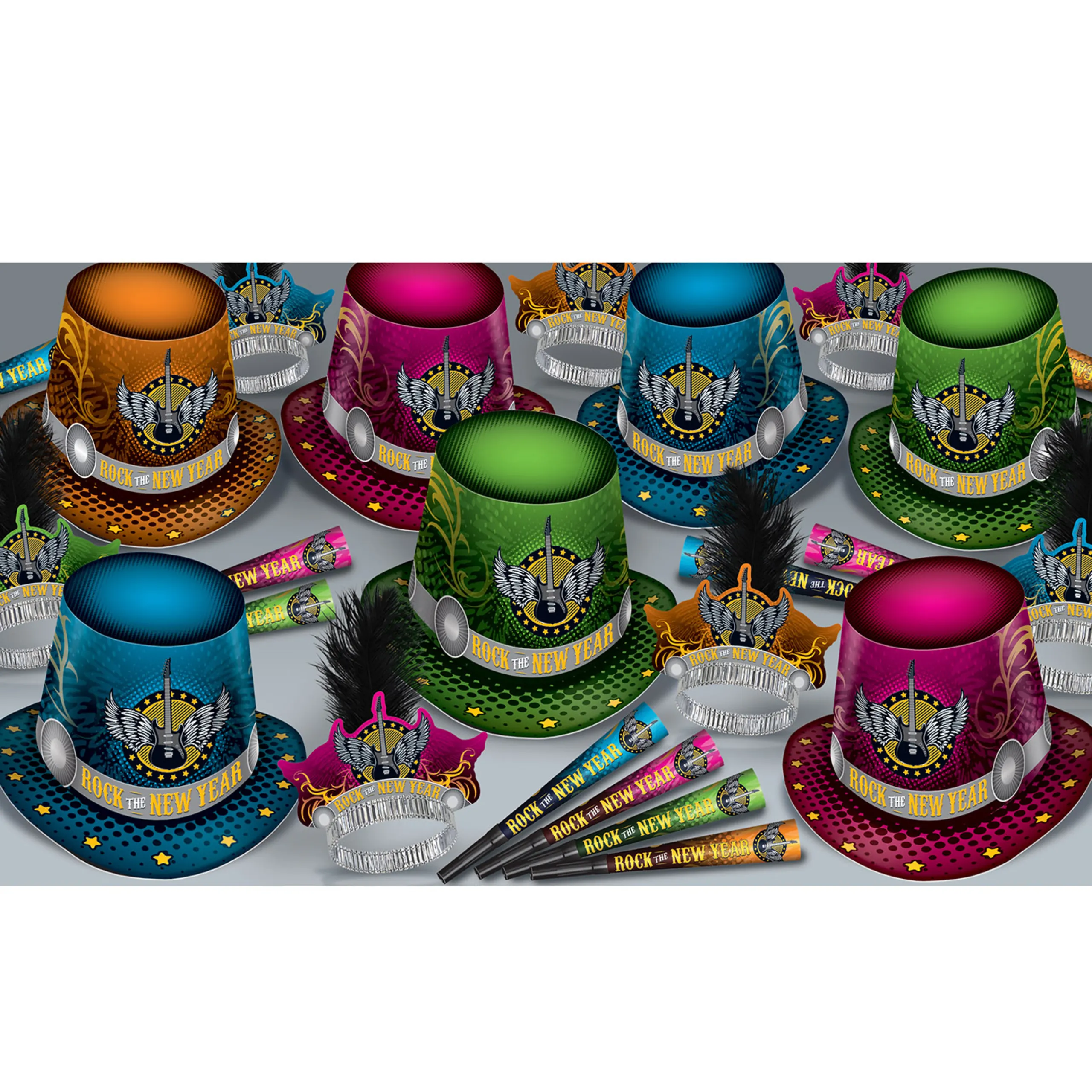 For Decades, Rock And Roll And New Years Have Partnered Together To Welcome In Each Upcoming Year. In True Nye Style, This Glamorous Rock-Inspired Assortment Features 25 Hats, 25 Tiaras, And 50 Horns – Outfitting Up To 50 Party Guests! Made Of Card Stock And Printed With “Rock The New Year” And A Winged Guitar, Each Item Comes In Assorted Colors Of Blue, Green, Pink, And Orange. Items Are Also Available Individually In The Rock The New Year Design.