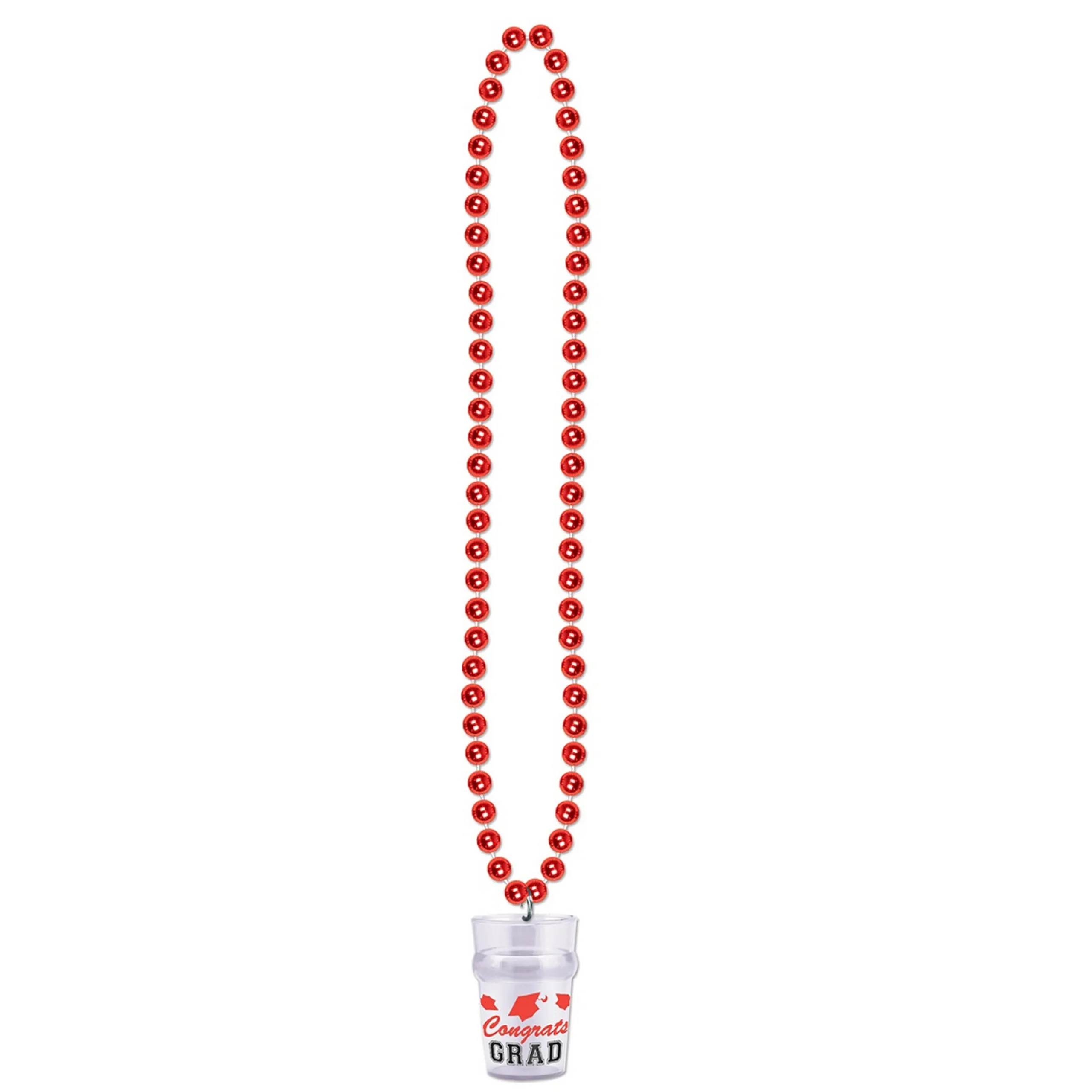 Each Necklace Features Metallic Red Party Beads With A Clear Shot Glass With A Large Red Mortar Board Graduation Cap And Two Small Red Mortar Boards On Either Side And Towards The Bottom Are The Words “Congrats” In Red Cursive Writing And “Grad” In Bold Black Lettering