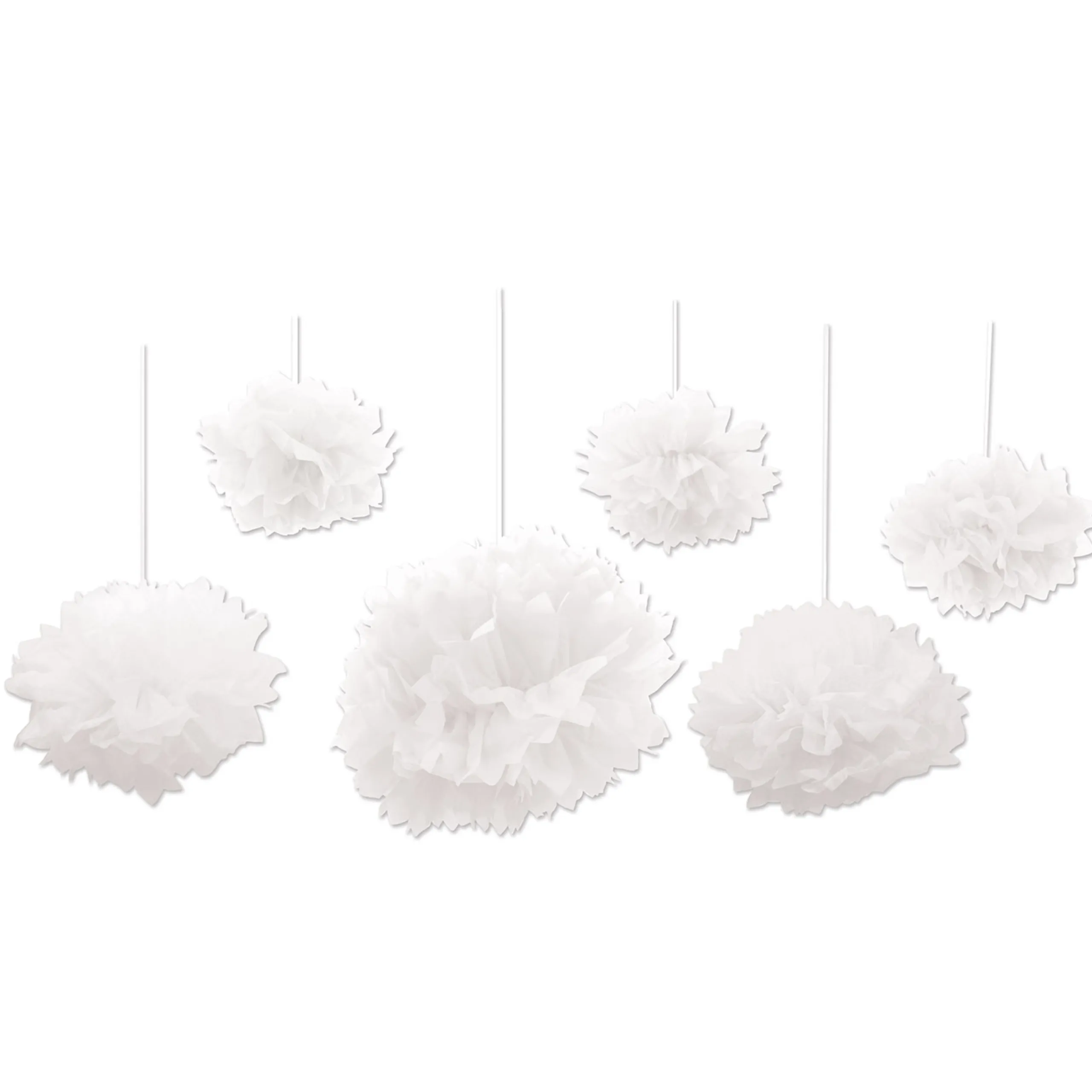 Features Bright White Tissue Fluff Balls In Assorted Sizes With White Satin Ribbon Attached To Each One, Making It A Snap To Hang These From Ceilings Or Railings
