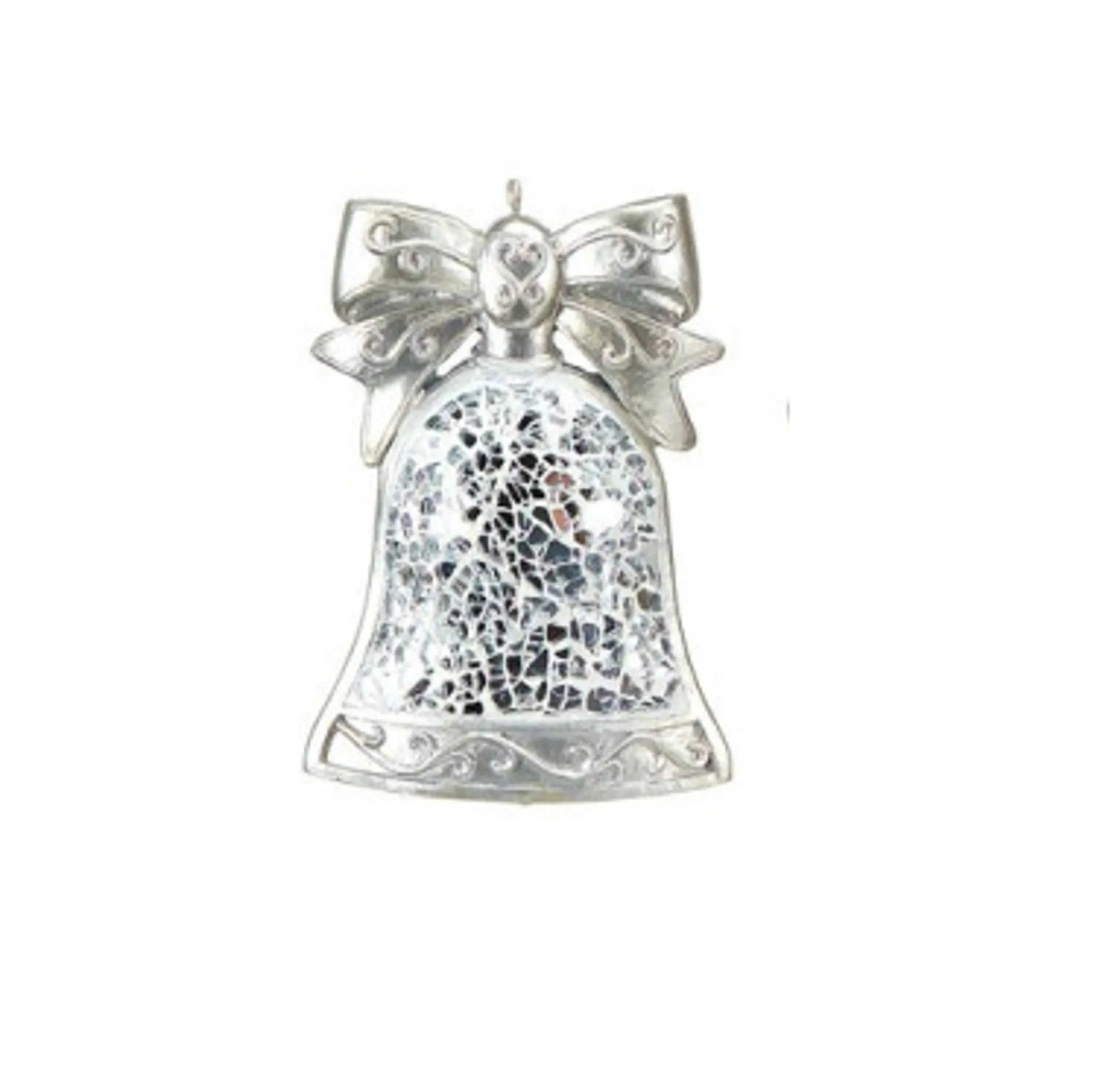 Add A Touch Of Elegance And Festive Charm To Your Holiday Decor With This Beautiful Christmas Ornament. This Exquisite Ornament Features A Gleaming Metallic Silver Bell Adorned With Intricate Scroll Design Patterns, Creating A Captivating Interplay Of Light And Shadow. The Mosaic-Style Glass Detailing Further Enhances Its Beauty, Reflecting The Twinkling Lights Of The Season. Hang This Exquisite Bell Ornament On Your Christmas Tree Or Display It Around Your Home To Create A Dazzling Seasonal Ambiance.