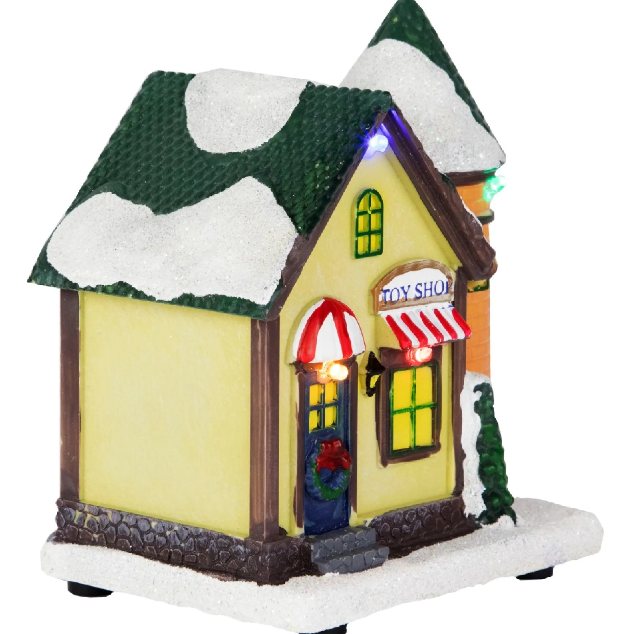 This Sweet Little Toy Shop Is The Perfect Addition To Your Christmas Village Display. Illuminated With Multi-Colored Led Bulbs, It Offers The Perfect Colorful Glow. Exquisite Detail From The Glittery Snow To The Silo Roof. Battery Operated Means It Can Be Placed Anywhere You Wish.