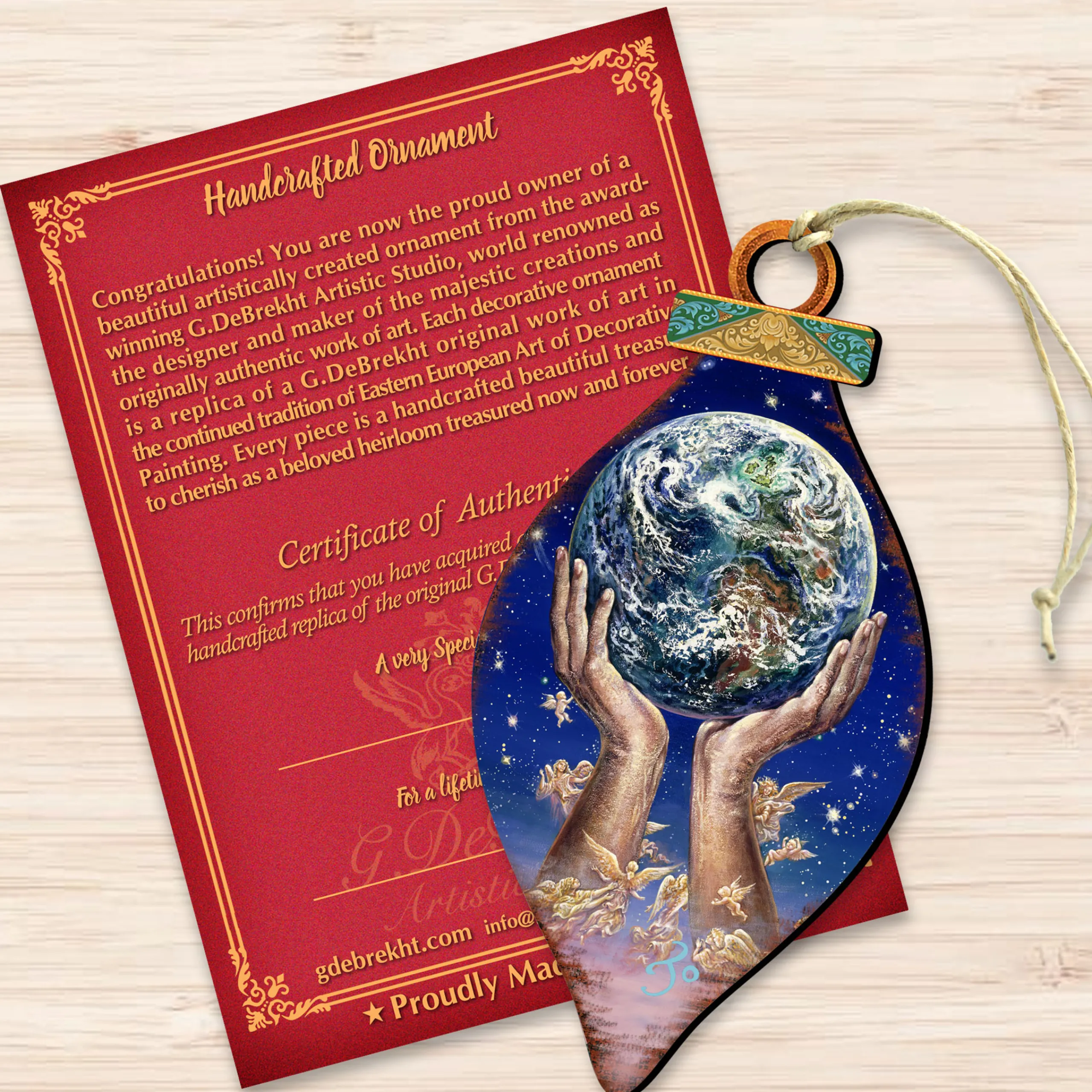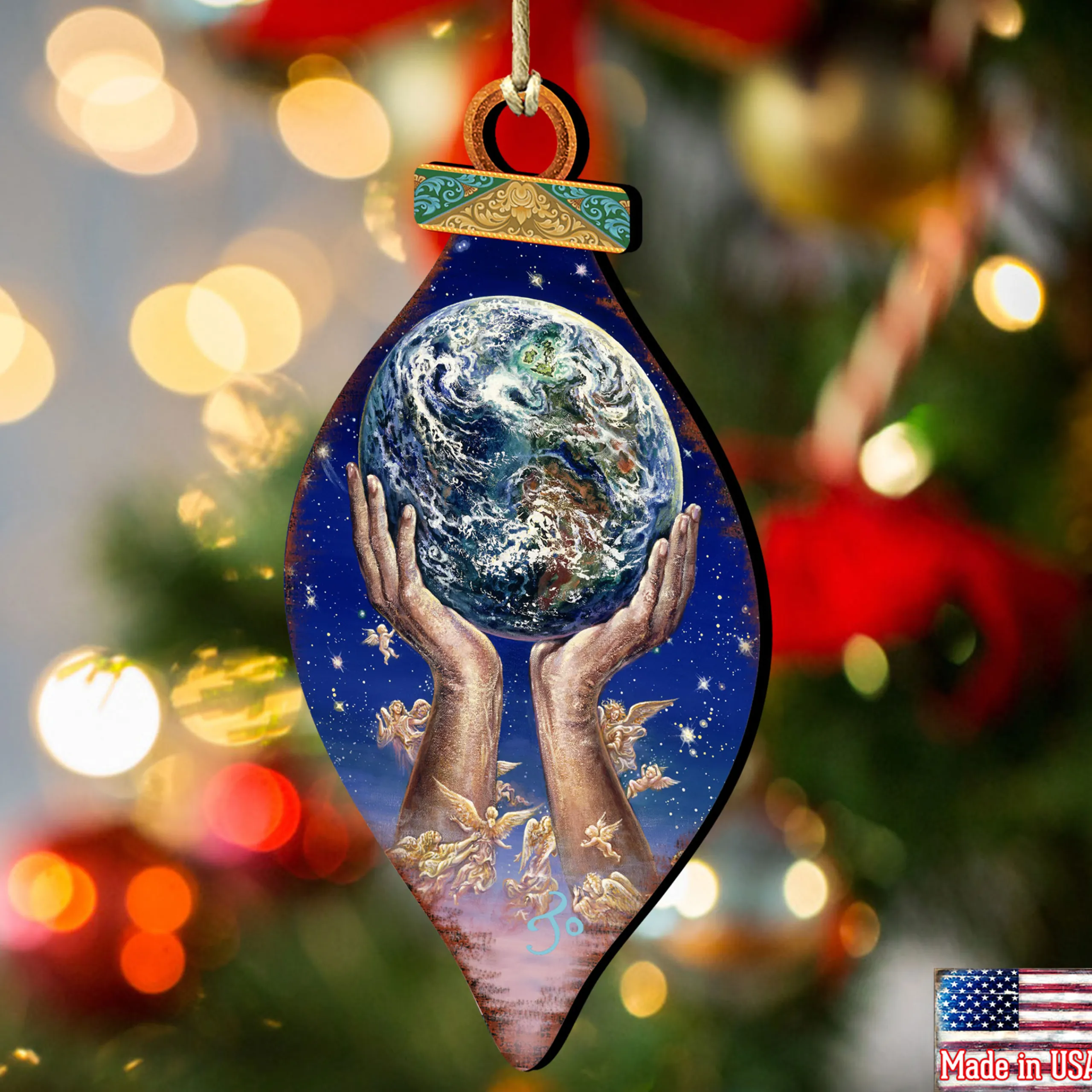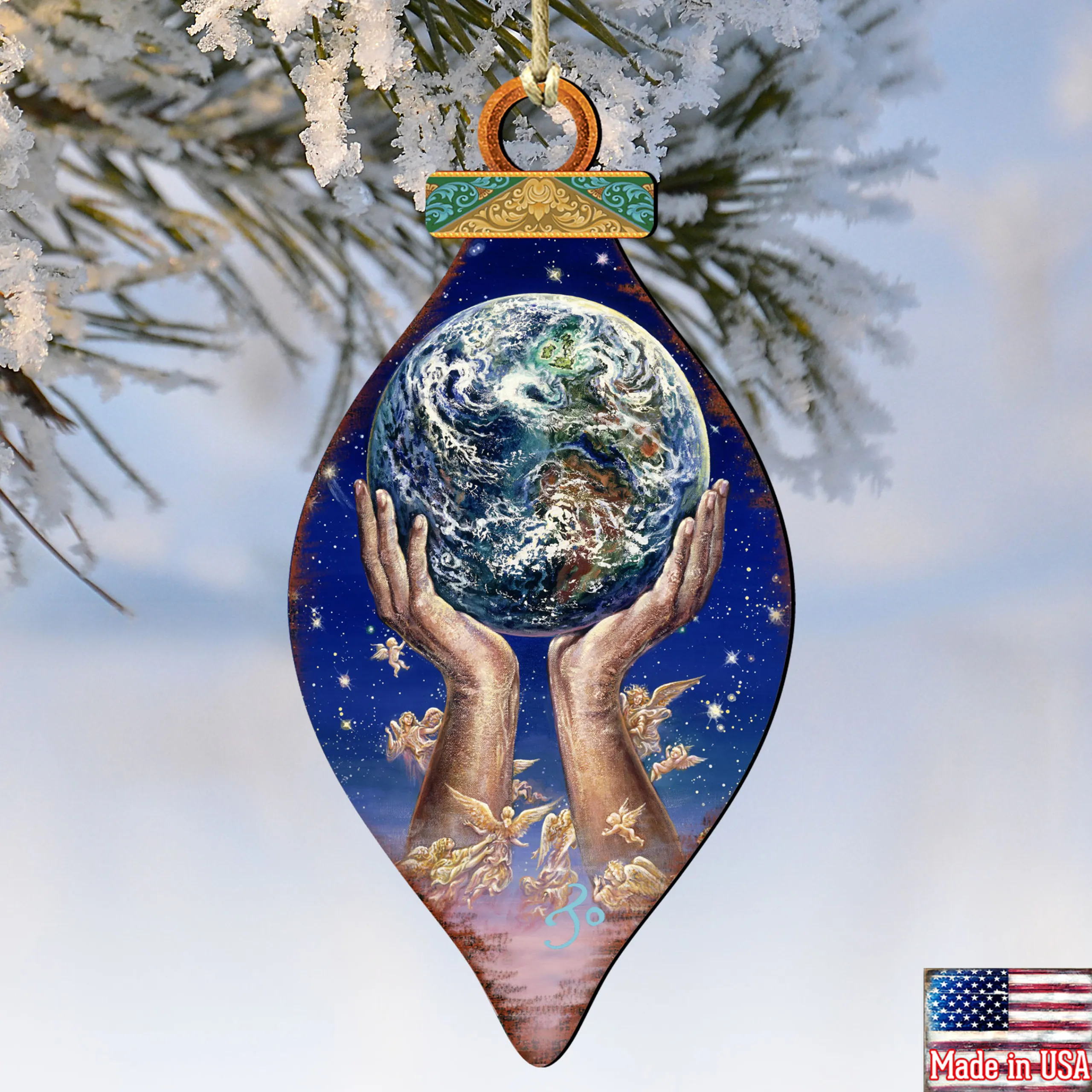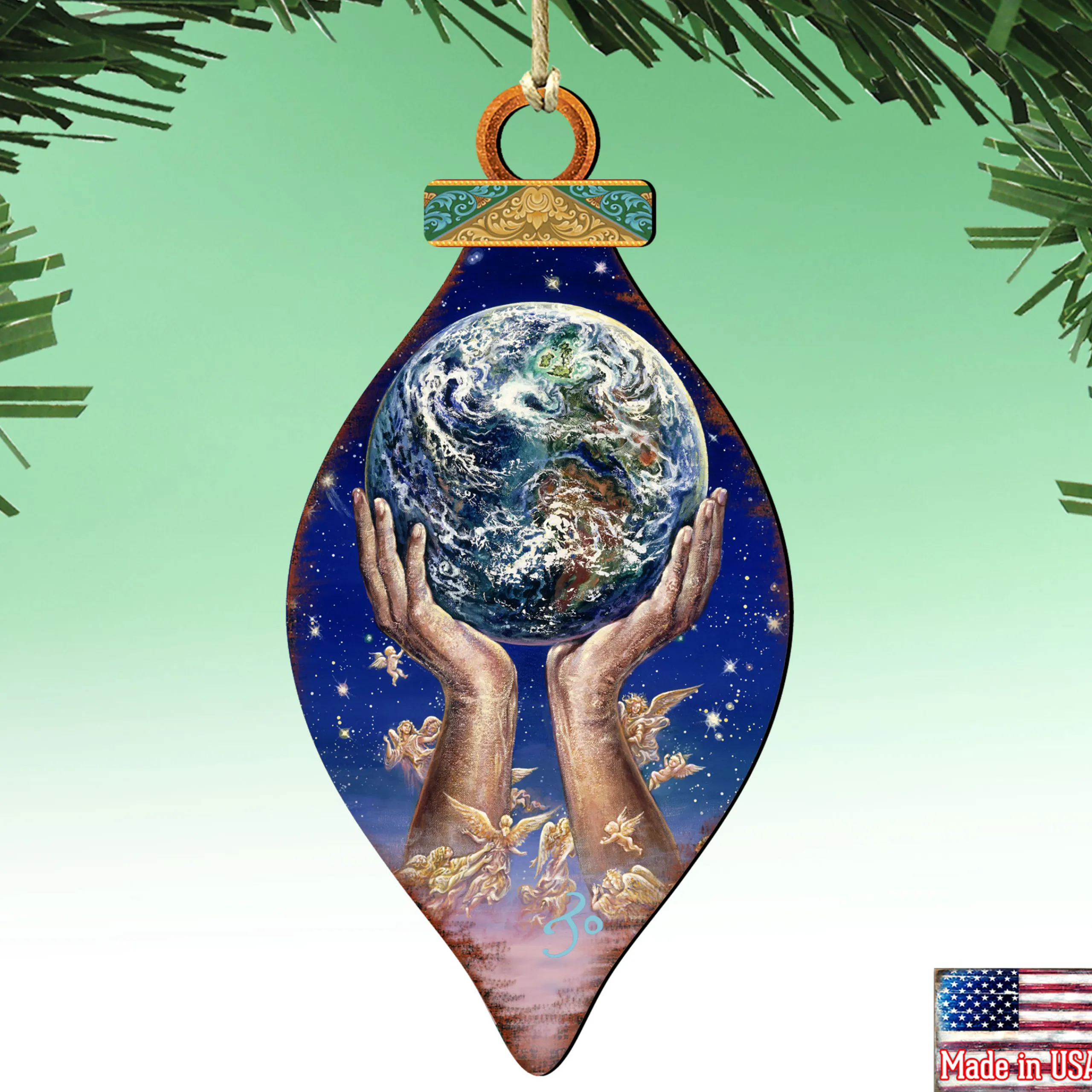 Designocracy Angels & Cherubs>Set Of 2 Hands Holding Earth Wooden Christmas Ornaments 5.5″