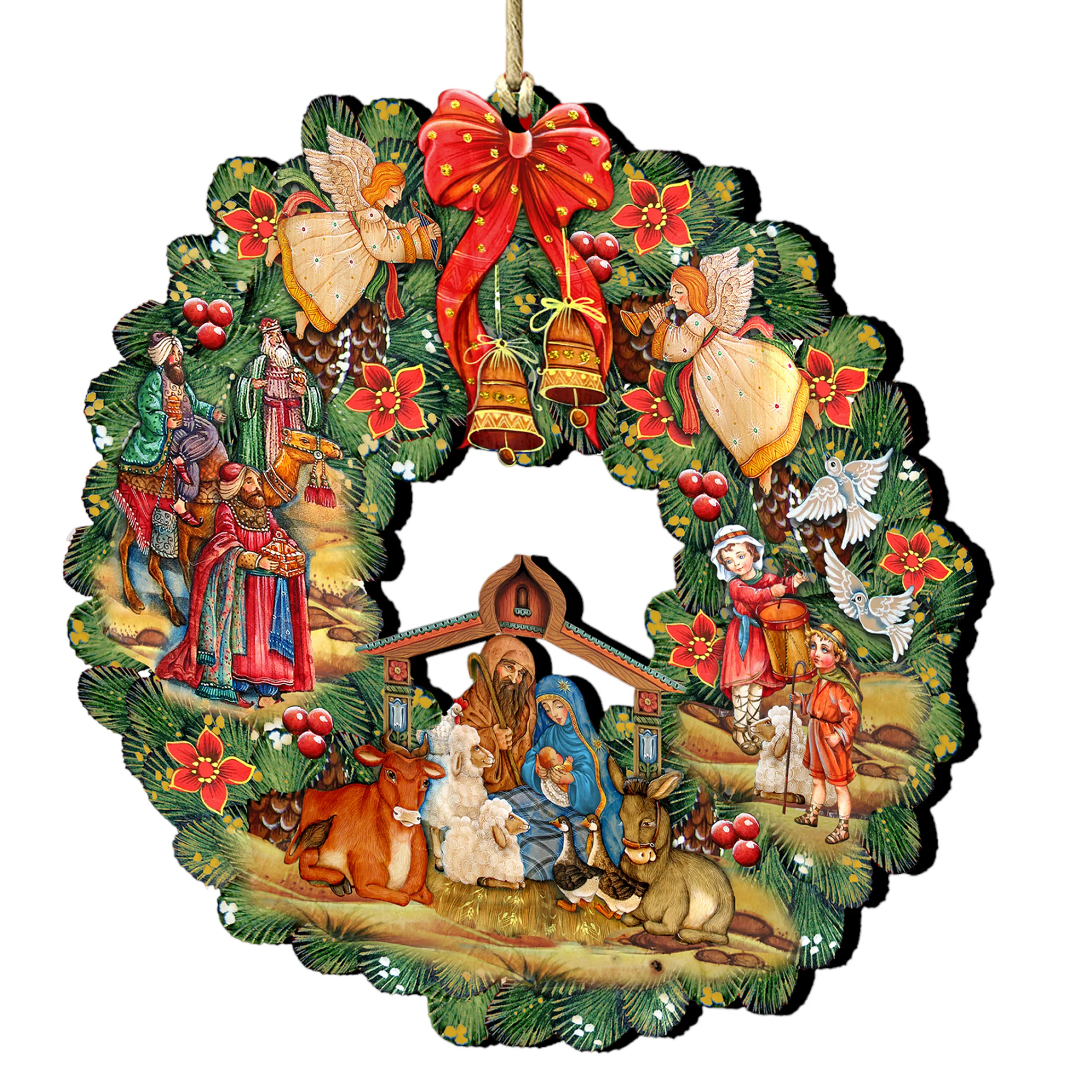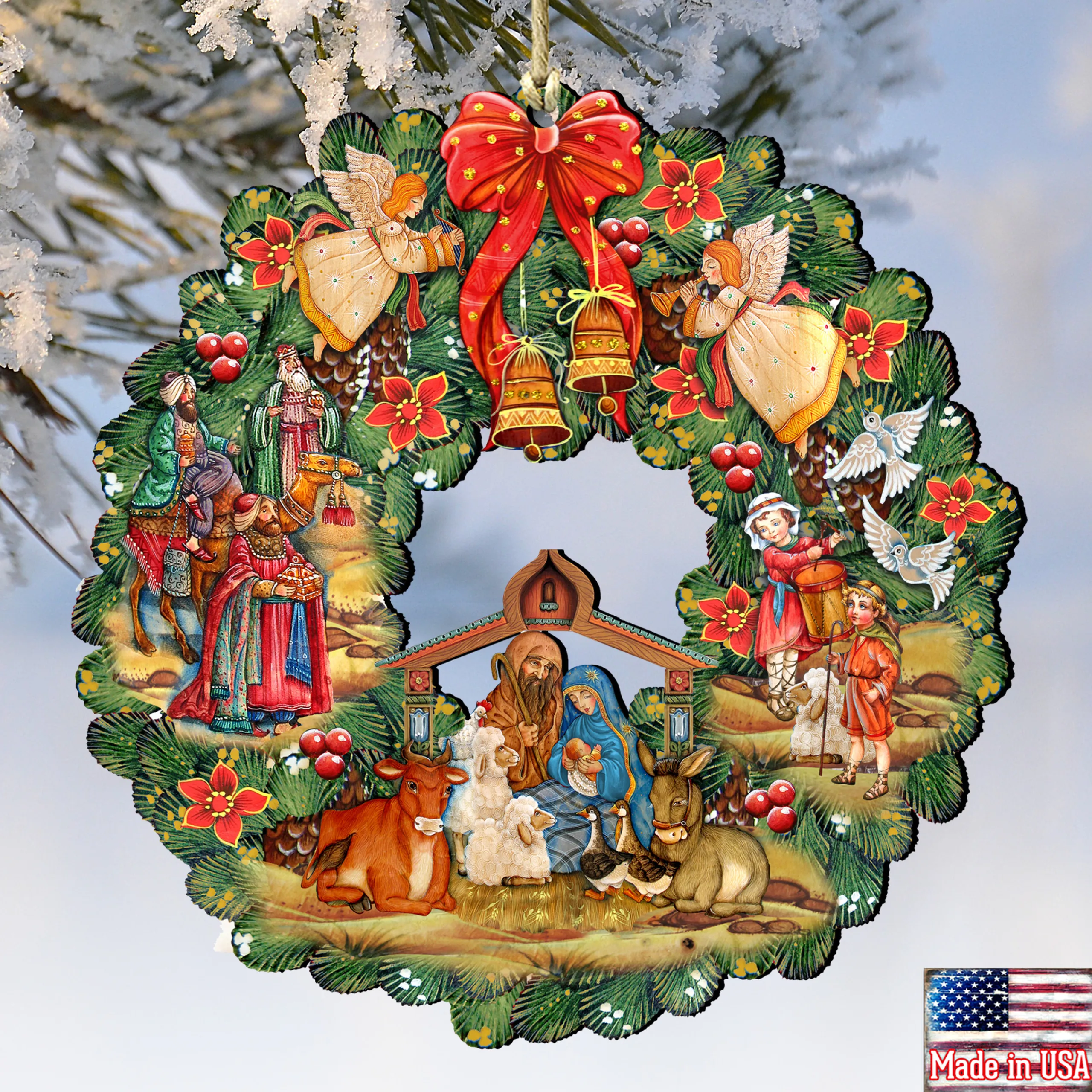 Designocracy Angels & Cherubs>Set Of 2 Nativity Wreath Wooden Christmas Ornaments 5.5″
