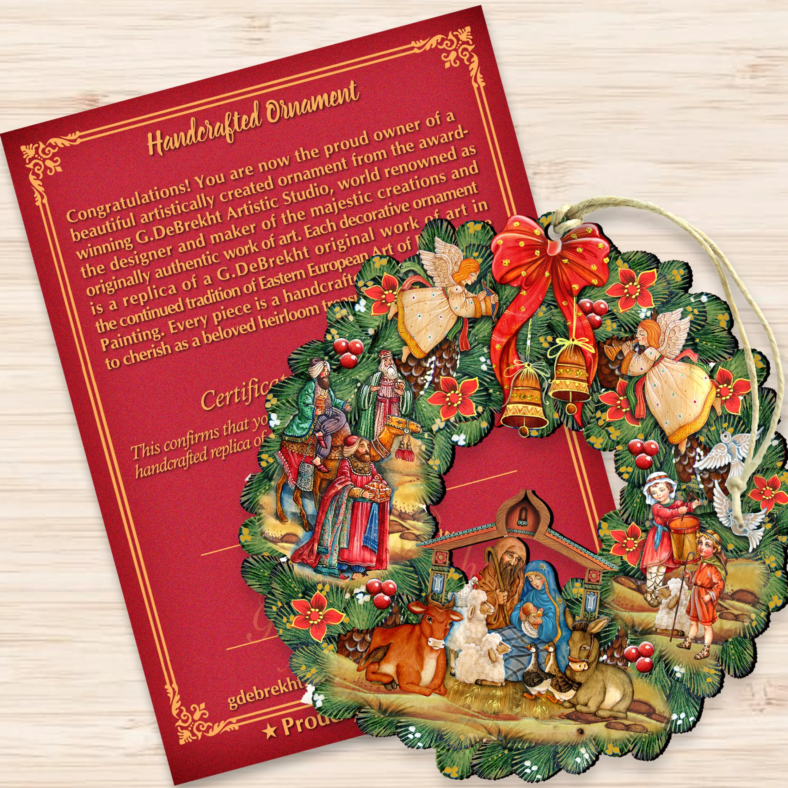 Invite The Beauty Of Christmas Into Your Home With This Set Of Charming Ornaments. These Ornaments Depict A Wreath With Nativity Scenes, Flowers, And Animals Around It. Each Ornament Was Handcrafted From Birch Wood And Designed By G.Debrekht. These Would Be A Perfect Addition To Your Home Christmas Decoration Or A Great Gift.